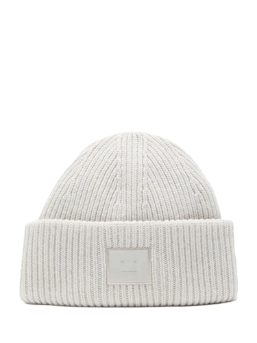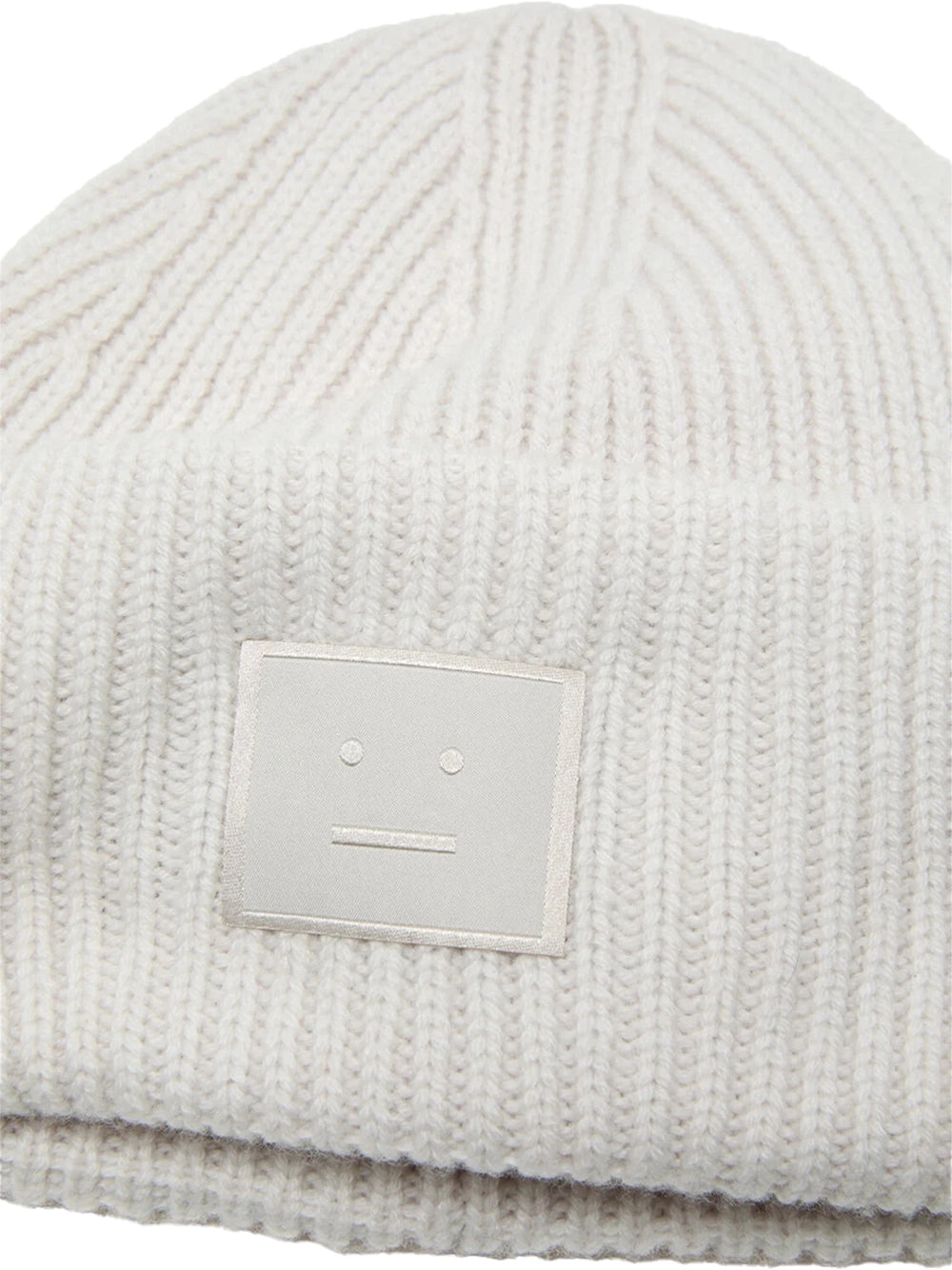 This essential Acne Studios beanie is crafted from chunky ribbed wool for exceptional warmth and texture. The standout feature is the large, embroidered 'Face' logo patch, a signature of the Acne Studios aesthetic. With a classic turned-up cuff, this one-size Acne Studios beanie (approx. 59 cm) offers a comfortable, slouchy fit.