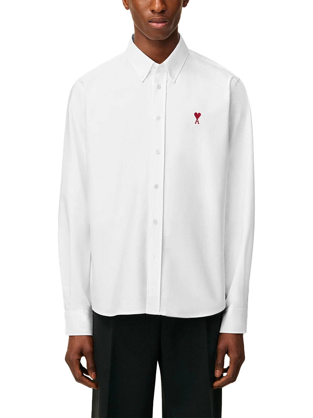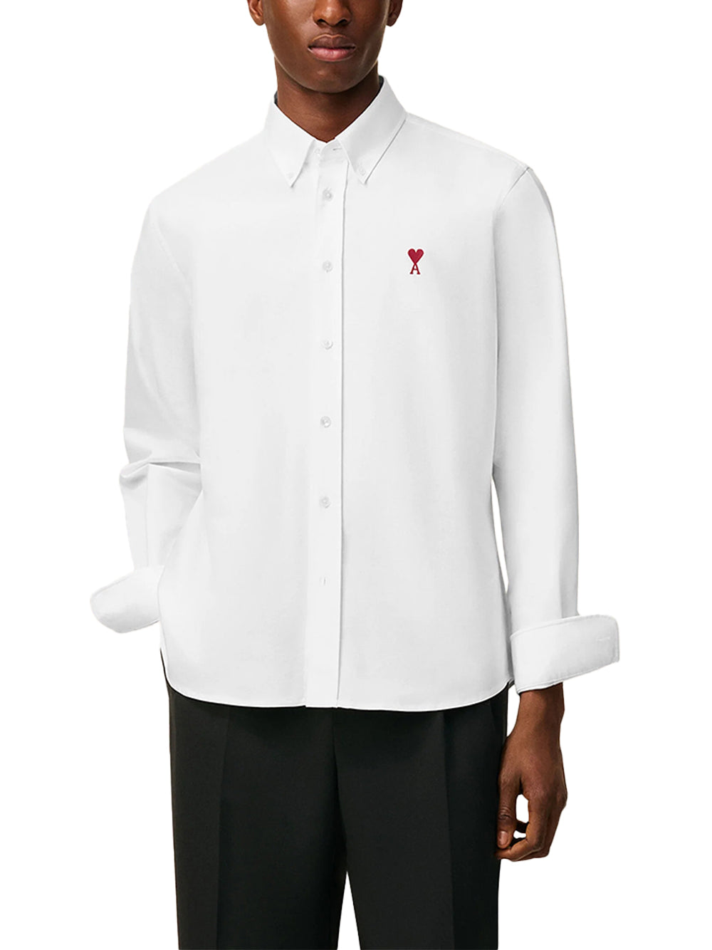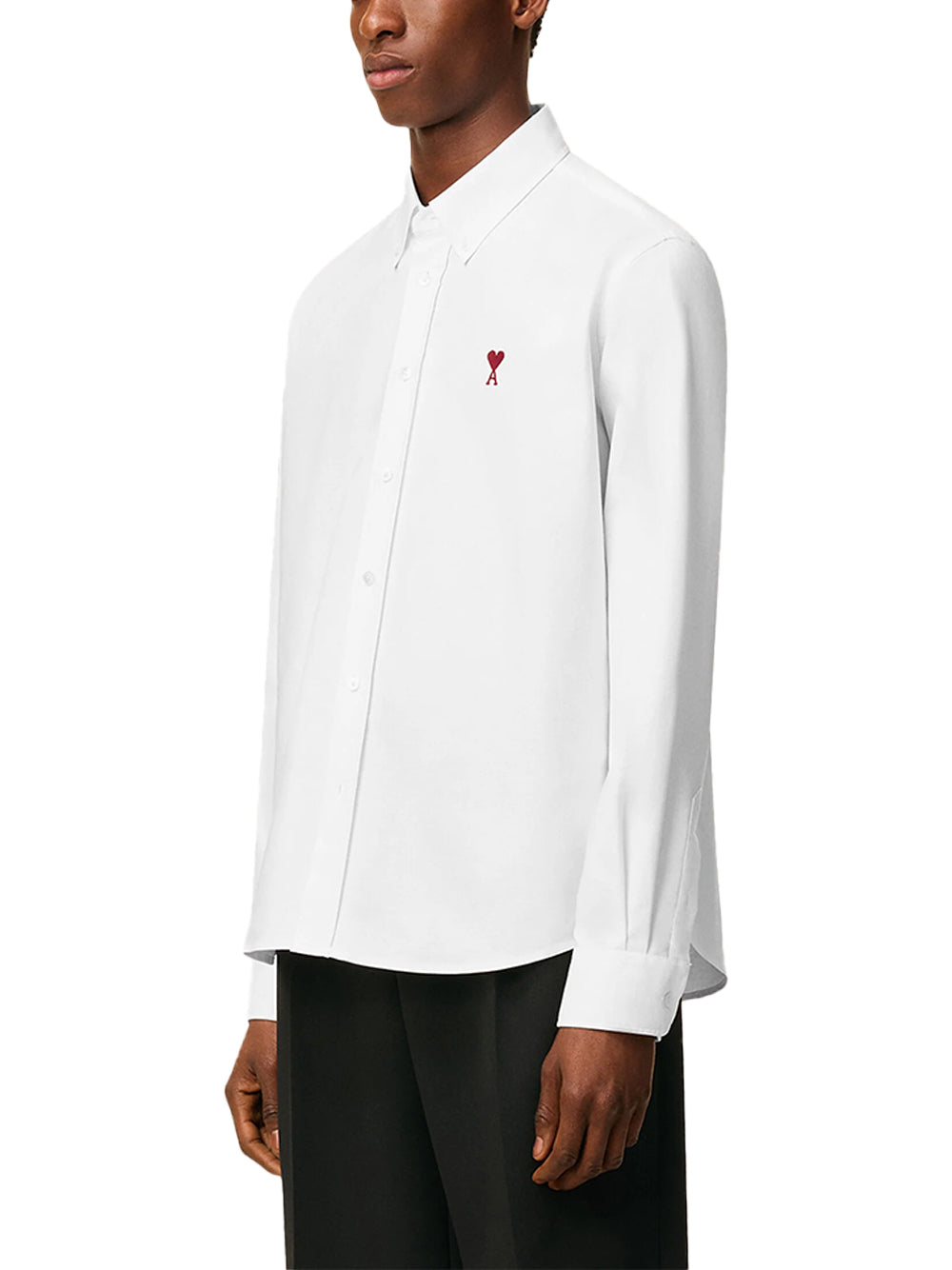 Discover timeless Parisian style with this unisex Ami Paris ADC classic shirt in crisp white. The regular fit design features a button-down collar with removable stays, pearl mother-of-pearl buttons, and the signature red Ami de Coeur embroidery at chest. With lengths of 75.5cm (XS) and 76.5cm (M), this Polish-made Ami Paris shirt represents exceptional value in the Ami Paris sale.