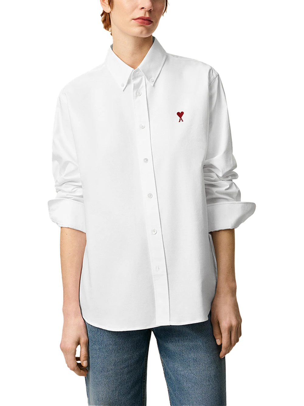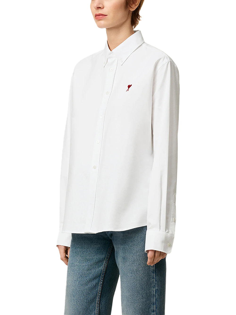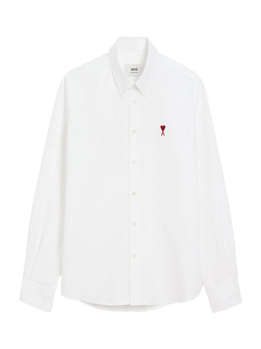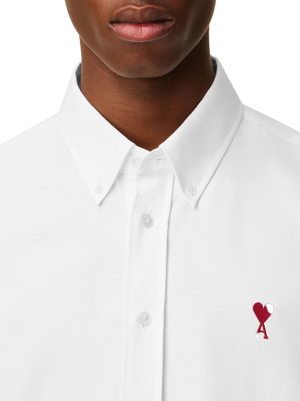Discover timeless Parisian style with this unisex Ami Paris ADC classic shirt in crisp white. The regular fit design features a button-down collar with removable stays, pearl mother-of-pearl buttons, and the signature red Ami de Coeur embroidery at chest. With lengths of 75.5cm (XS) and 76.5cm (M), this Polish-made Ami Paris shirt represents exceptional value in the Ami Paris sale.