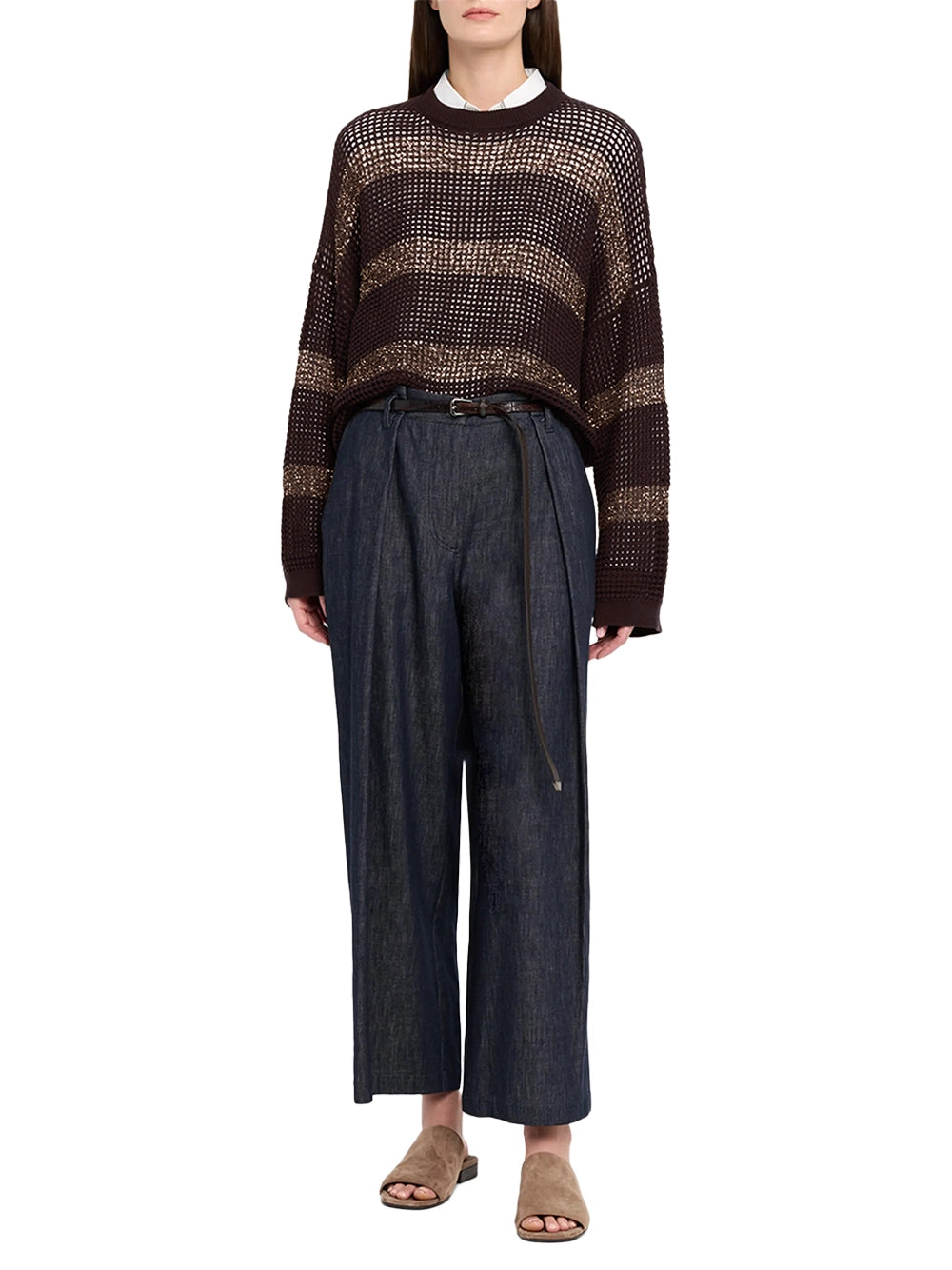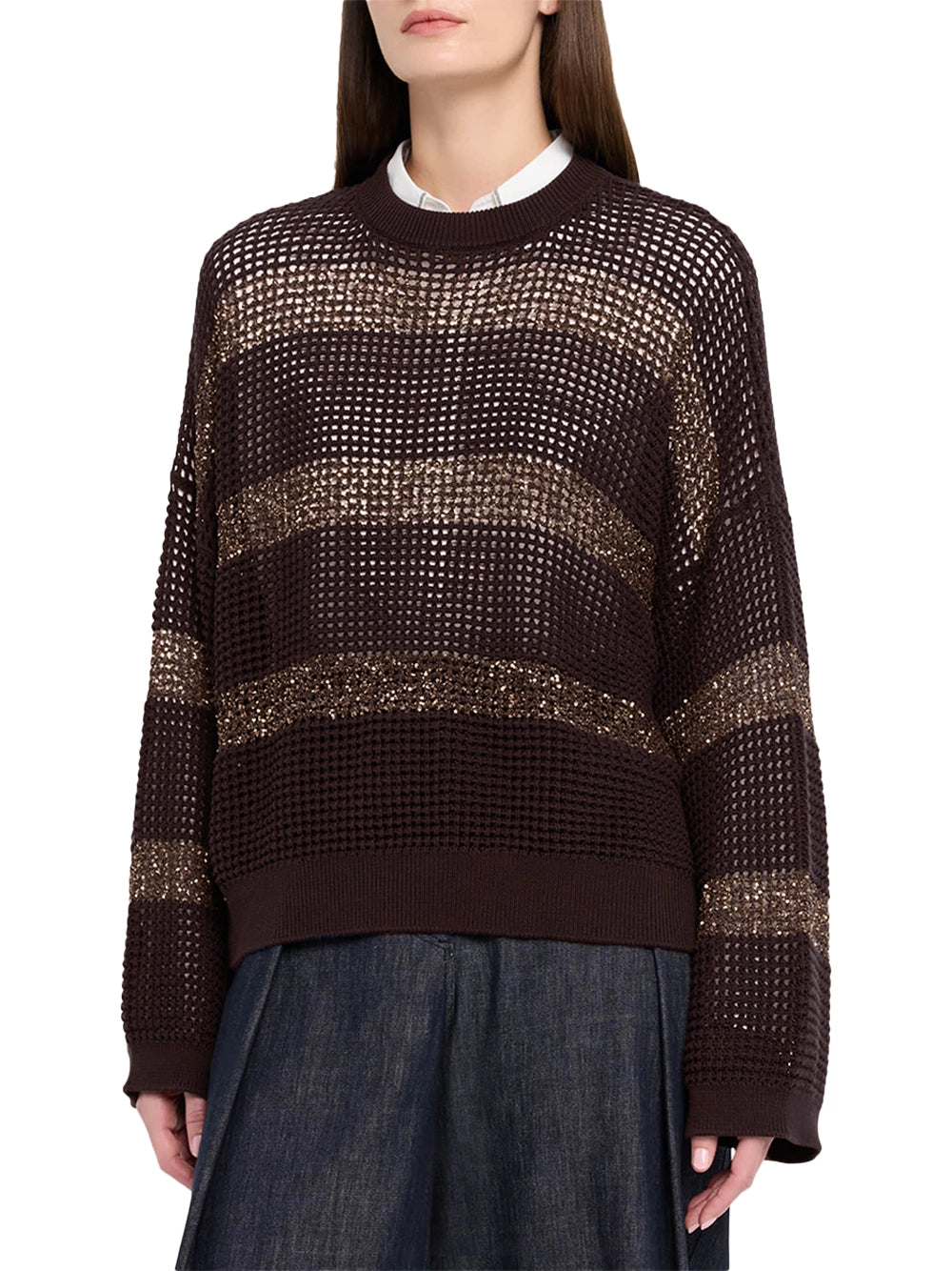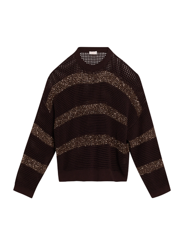 Indulge in the ethereal glow of this brunello cucinelli sweater. Featuring open-work knitting and shimmering sequin stripes, this brunello cucinelli piece offers a relaxed, dropped-shoulder fit. The iconic brunello cucinelli women's aesthetic is elevated by Italian-made craftsmanship and ribbed trims. This brunello cucinelli sweater is a knitwear masterpiece.