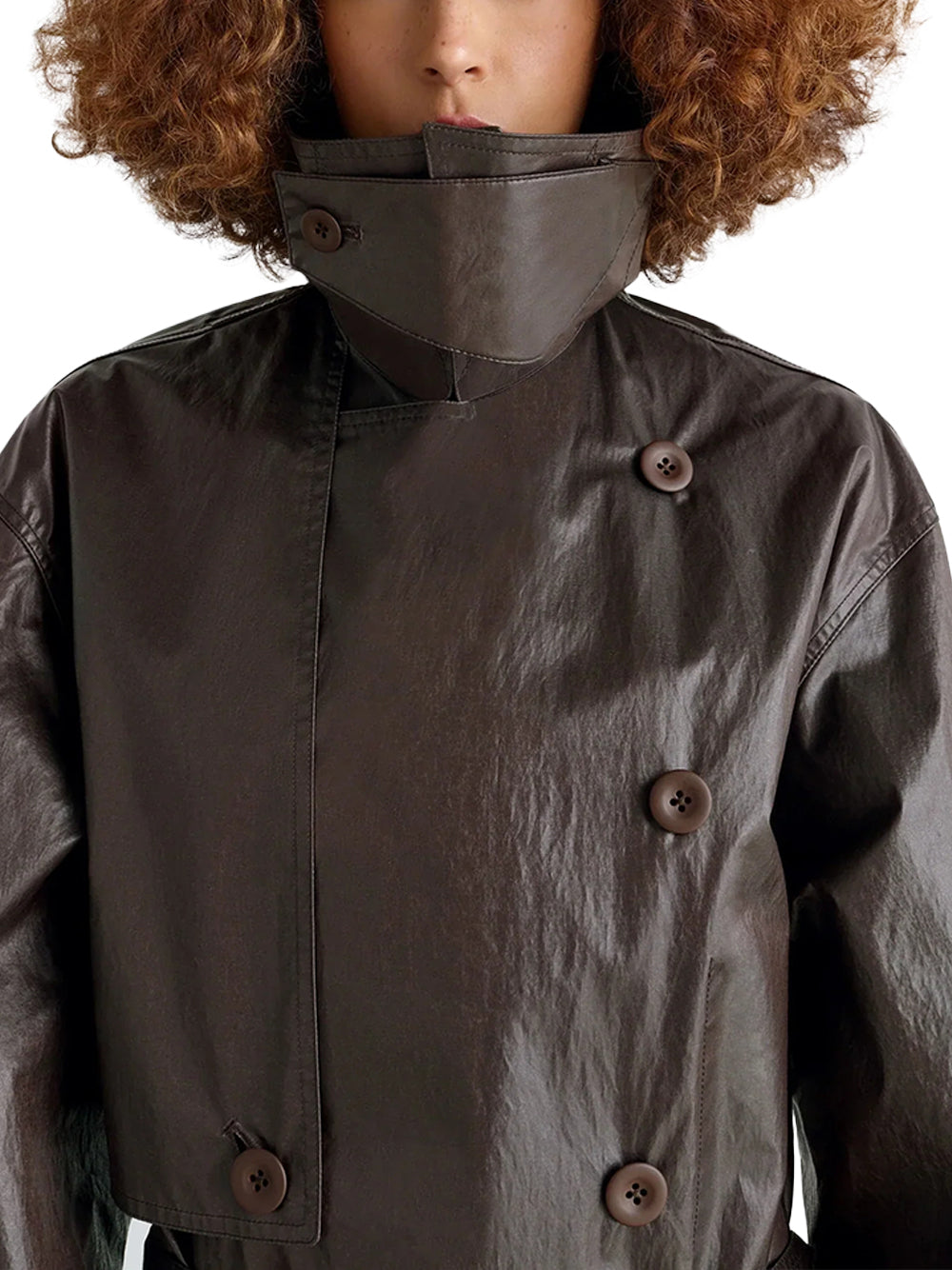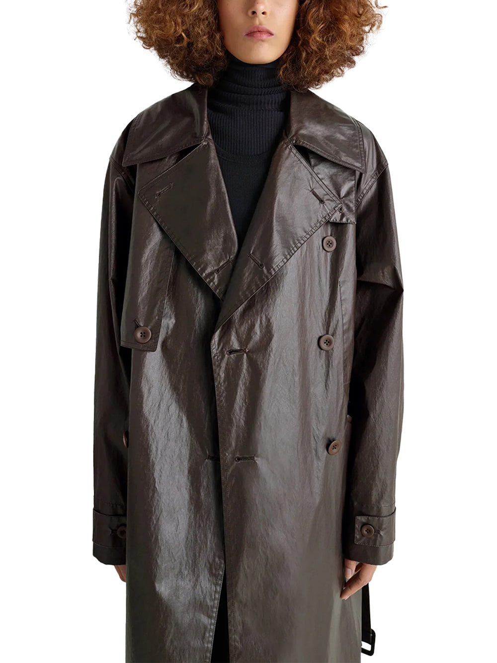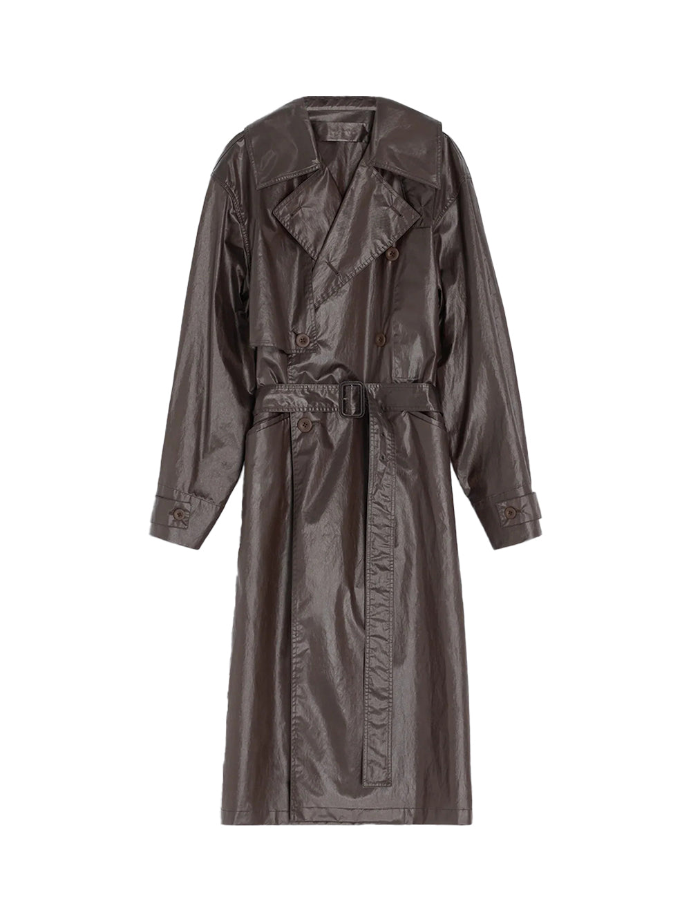 • Oversized trench coat in shiny, water-repellent coated cotton with metallic effect