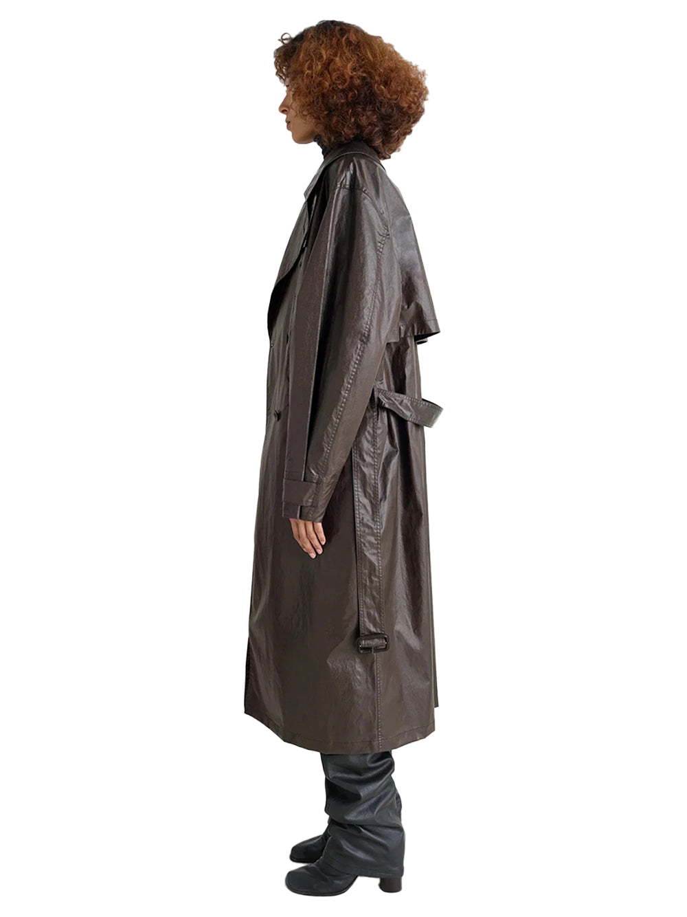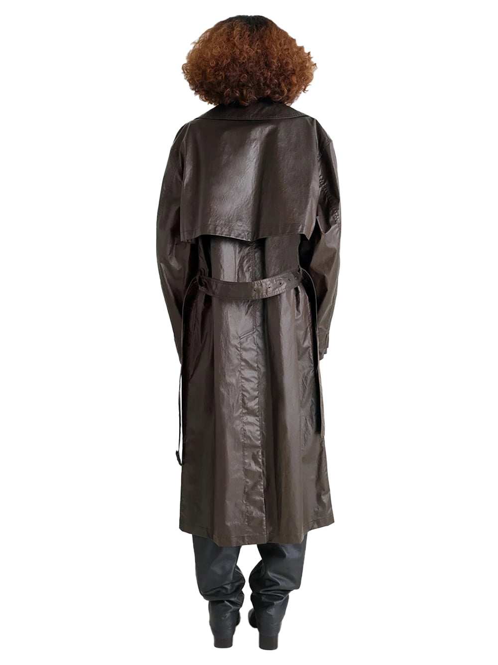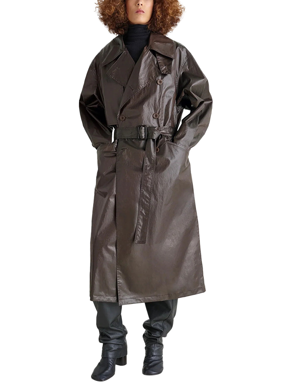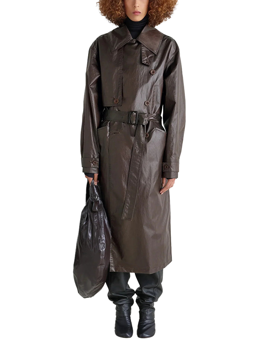 • Oversized trench coat in shiny, water-repellent coated cotton with metallic effect