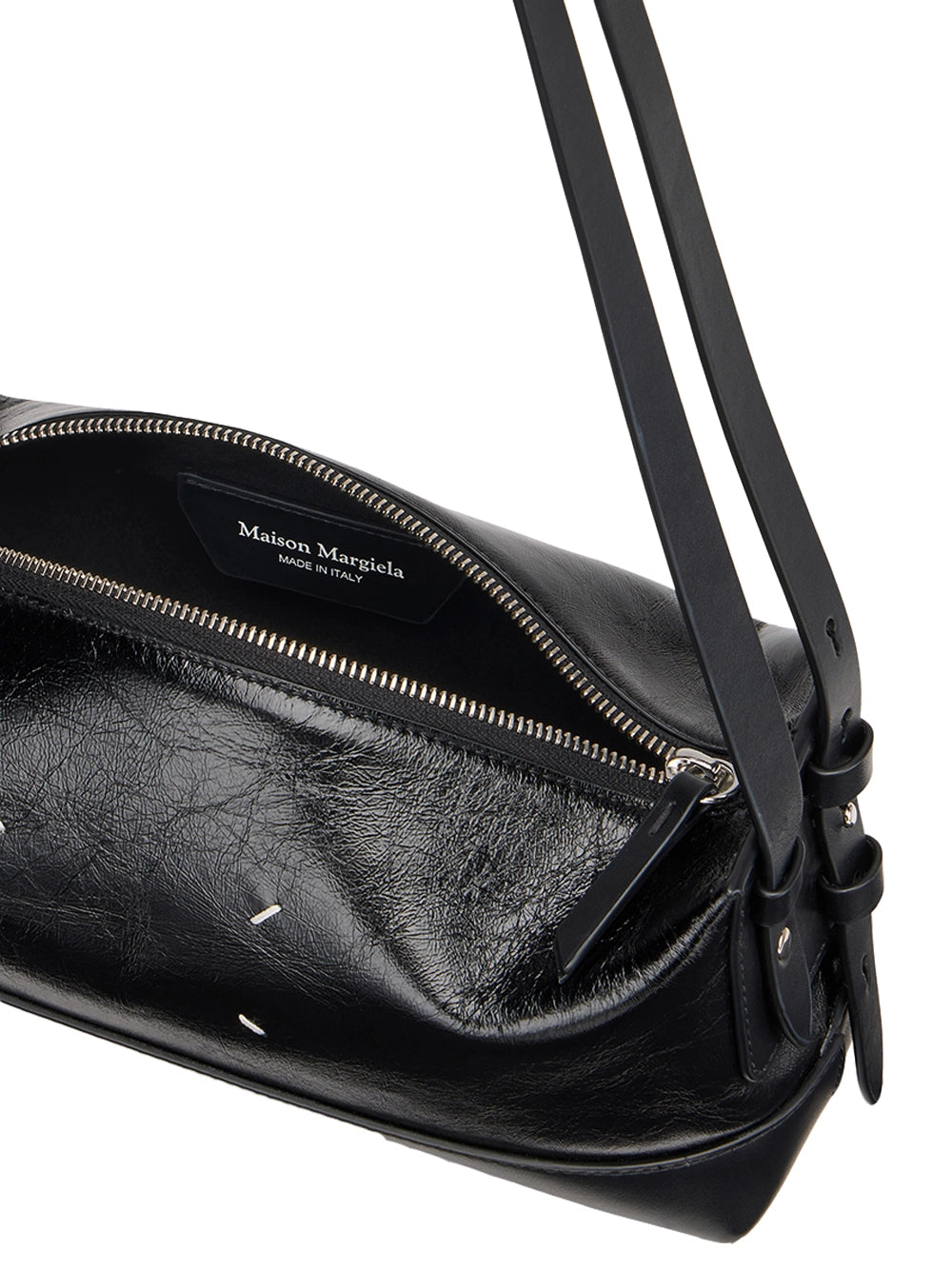 Define your edge with this maison margiela bag. This crinkled leather maison margiela shoulder bag features a buckle-adjusted strap and the iconic four-stitch detail. The Italian-made maison margiela accessory is secured by a sleek zip closure. This maison margiela shoulder bag is a masterclass in texture.