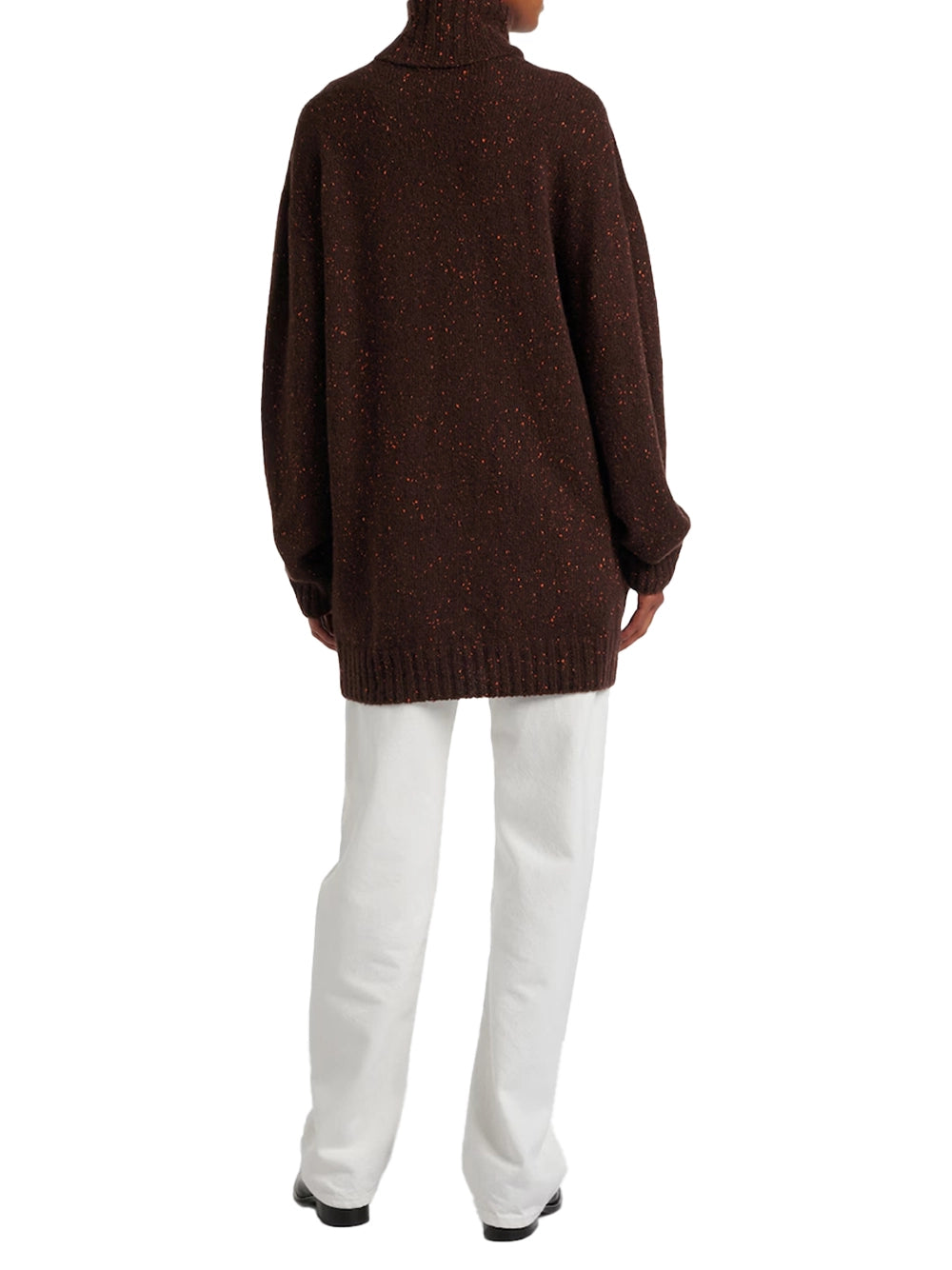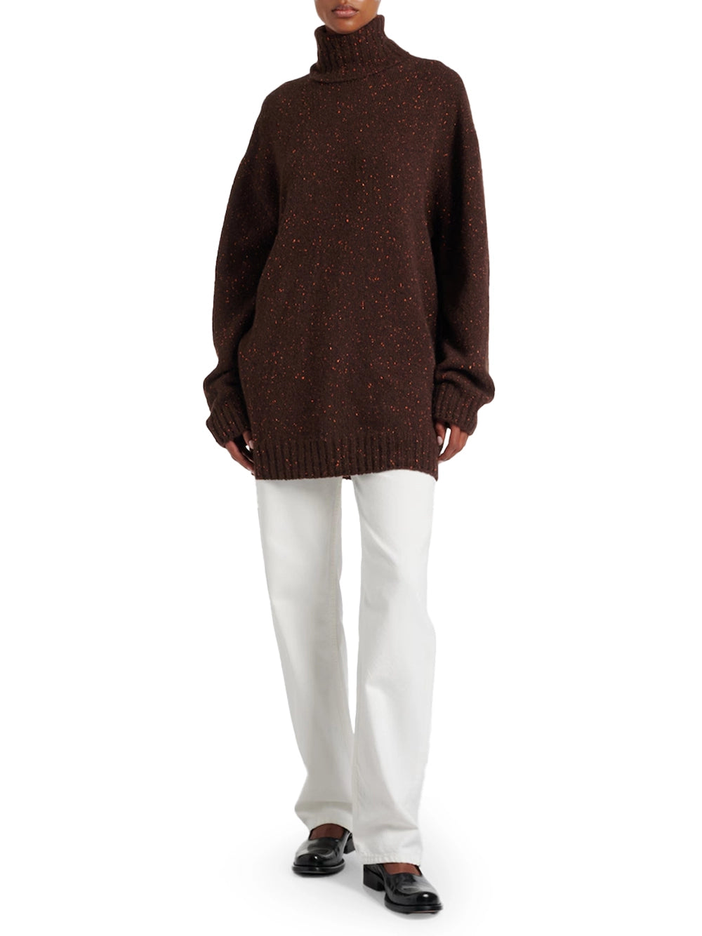 From the coveted The Row London collection, this piece is defined by its classic high neck and relaxed, dropped-shoulder silhouette that falls below the hip. Crafted from a soft, slightly stretchy fabric, it features ribbed knit detailing for subtle texture and a clean finish. This sweater exemplifies the understated, luxurious ease The Row is celebrated for. An essential layer for quiet luxury, this is an investment piece from The Row designed to elevate your wardrobe with its timeless, sophisticated style.
