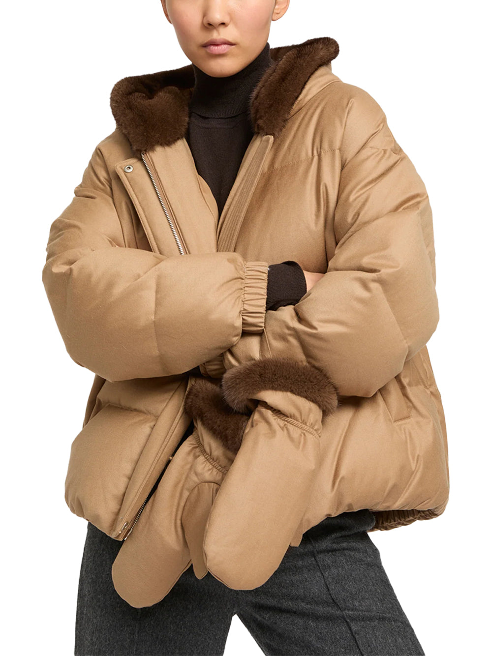• Removable flannel fabric mittens with mink fur trims