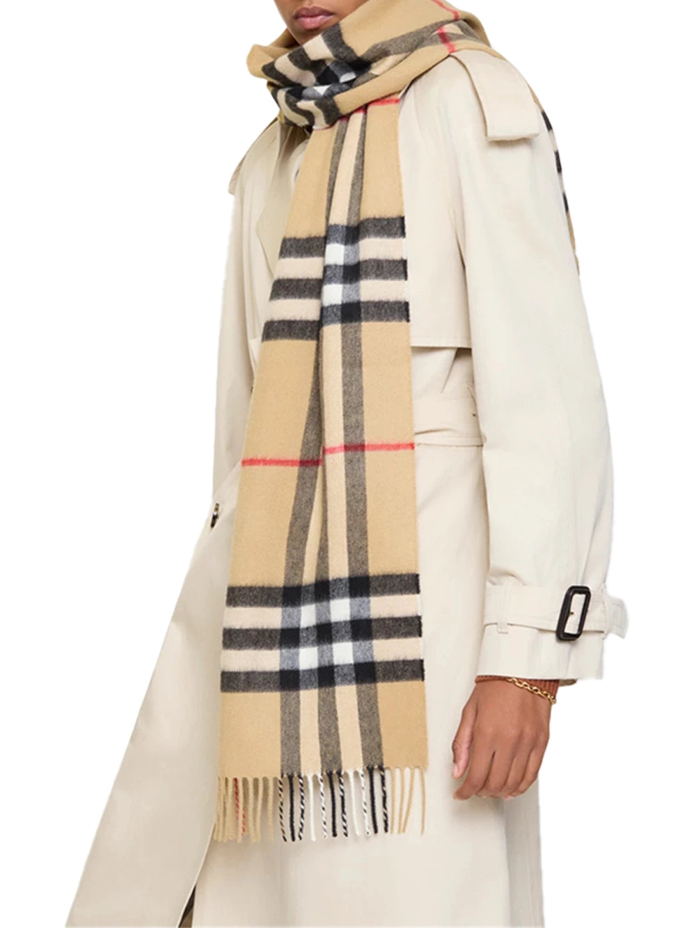 The Heritage Check Cashmere Scarf in Archive Beige represents the timeless elegance of British heritage. Crafted from 100% pure cashmere and woven on traditional looms in Scotland, this scarf is a testament to timeless craftsmanship and understated luxury. This product has been designed with fashion-conscious British consumers in mind, who place a high value on both style and substance. Its distinctive check pattern and luxurious texture make it a suitable choice for both city strolls and countryside outings.