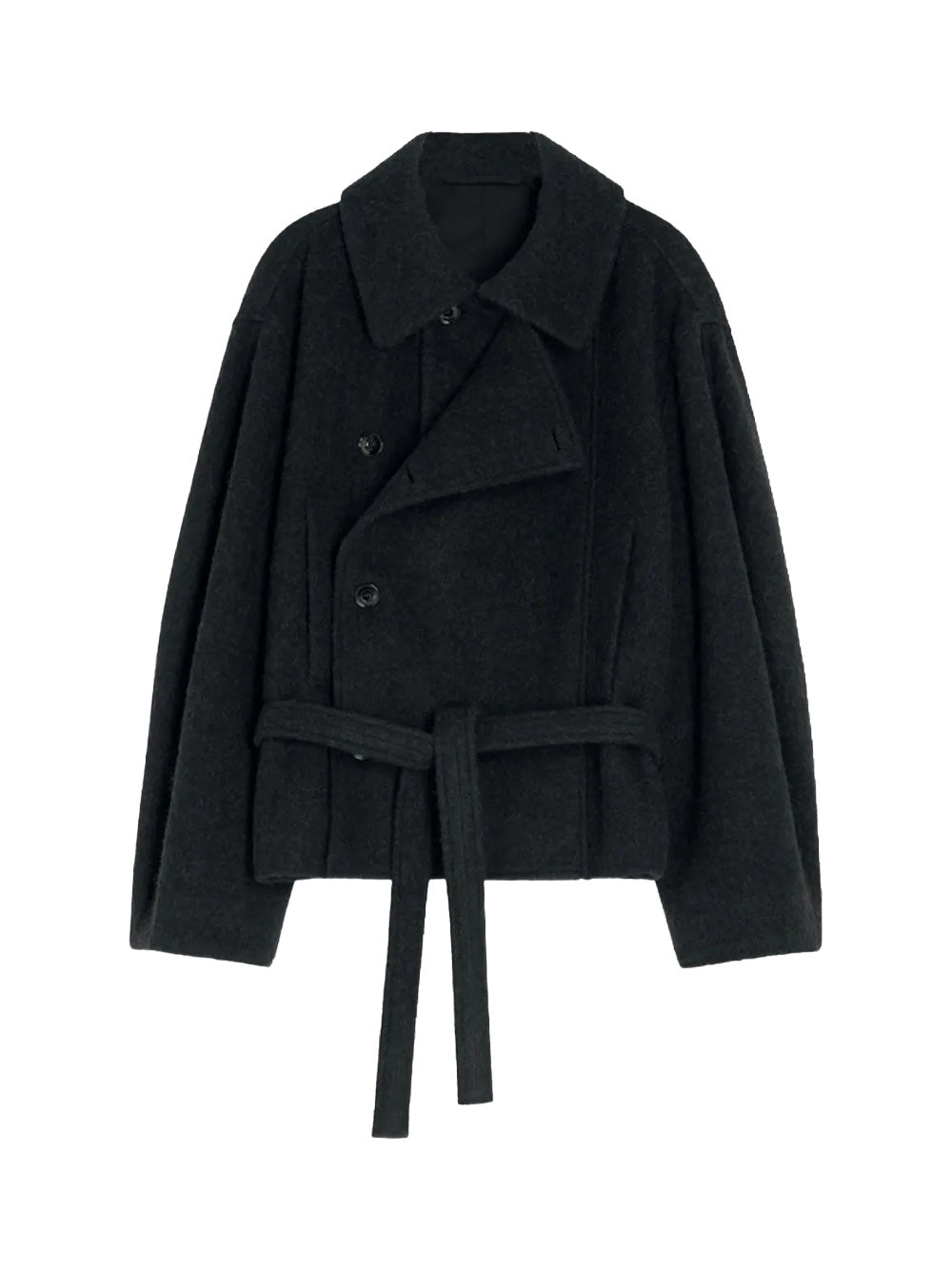 Discover the Lemaire Women's Black Double-Breasted Short Coat, a timeless piece blending elegance and functionality. Crafted from premium wool, it features an oversized collar, long sleeves, and a self-tie belt for a flattering silhouette. Ideal for those seeking a sophisticated black wool coat with modern appeal.