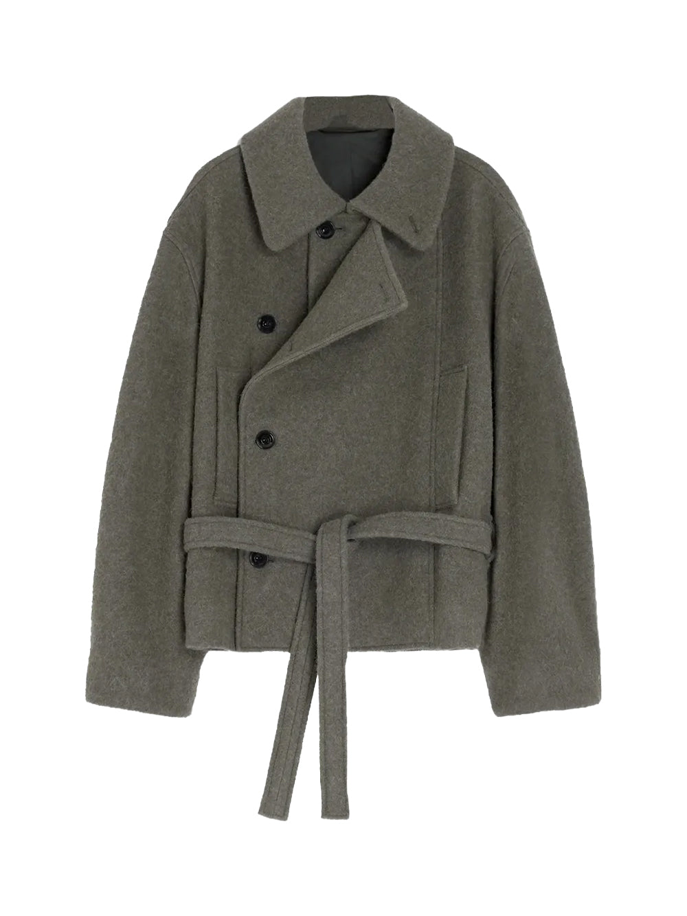 Dark khaki Lemaire short coat — double-breasted front with self-tie belt, oversized collar and long sleeves. Tailored short length for citywear; neat finishes and roomy mobility make it perfect for smart-casual looks and seasonal layering.