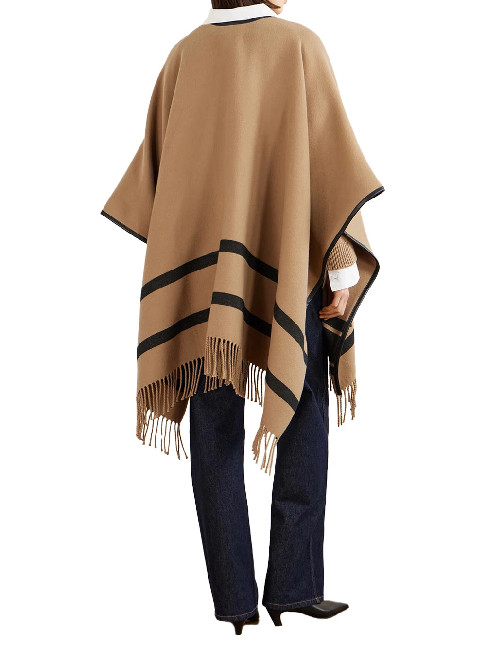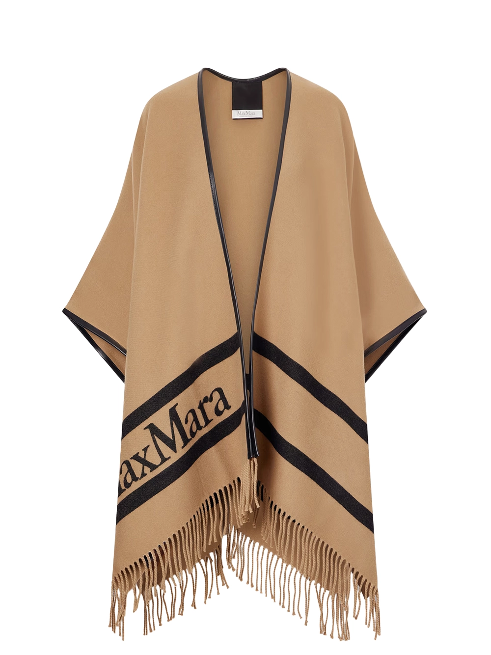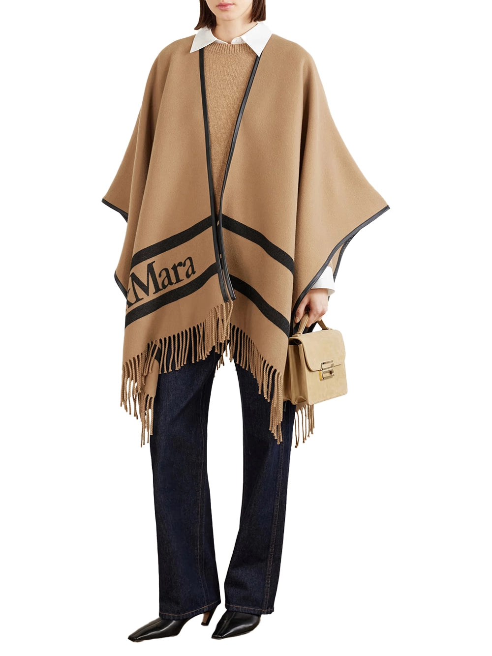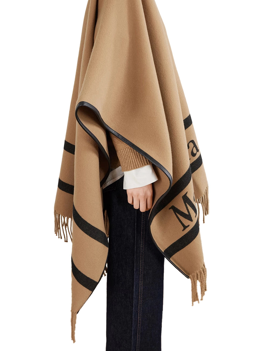 Woven from premium wool jacquard, this max mara poncho cape embraces a maximalist silhouette with elegant leather trims. The oversized max mara frame is beautifully finished with a playful fringed hem for added movement. This exquisite max mara wool poncho alternative brings a touch of luxury to your seasonal wardrobe.