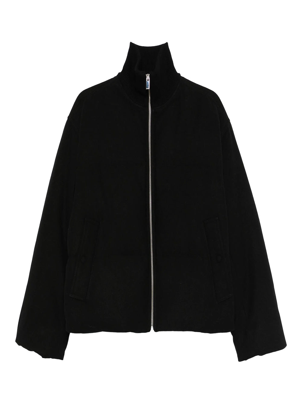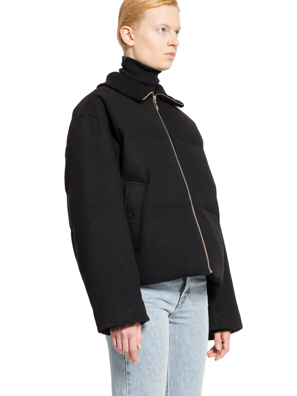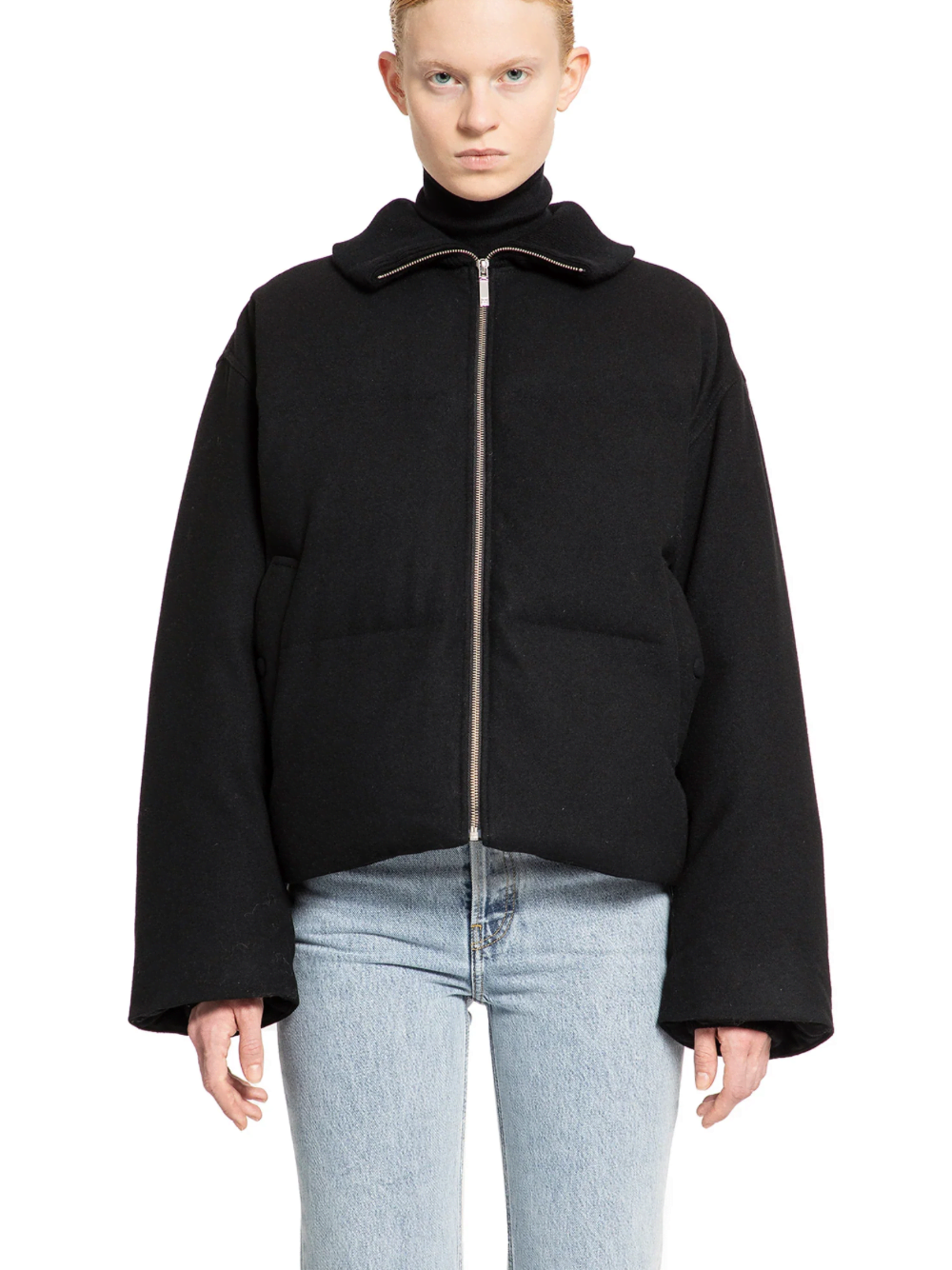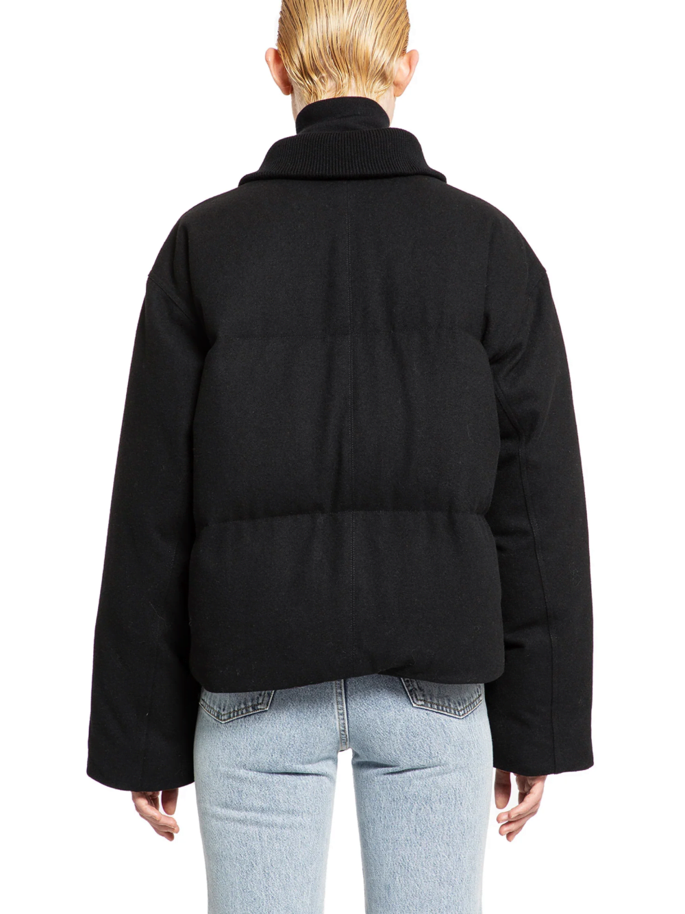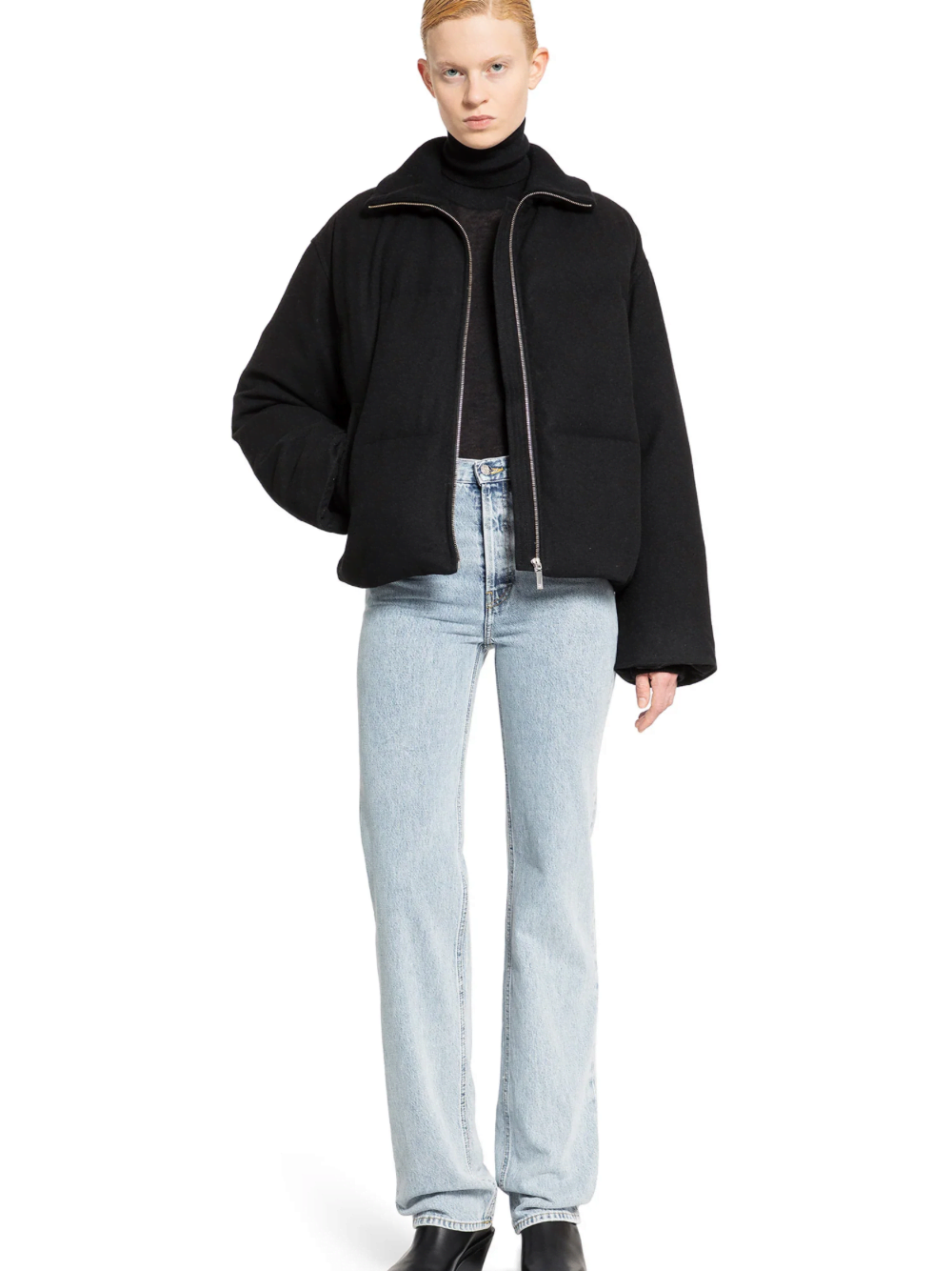 The Toteme Flannel Puffer Jacket in black is a chic blend of warmth and style. This jacket features a relaxed fit with a high collar and oversized padding, making it the perfect choice for effortless layering in colder weather. Its minimalist design and timeless silhouette make it a versatile addition to your outerwear collection.