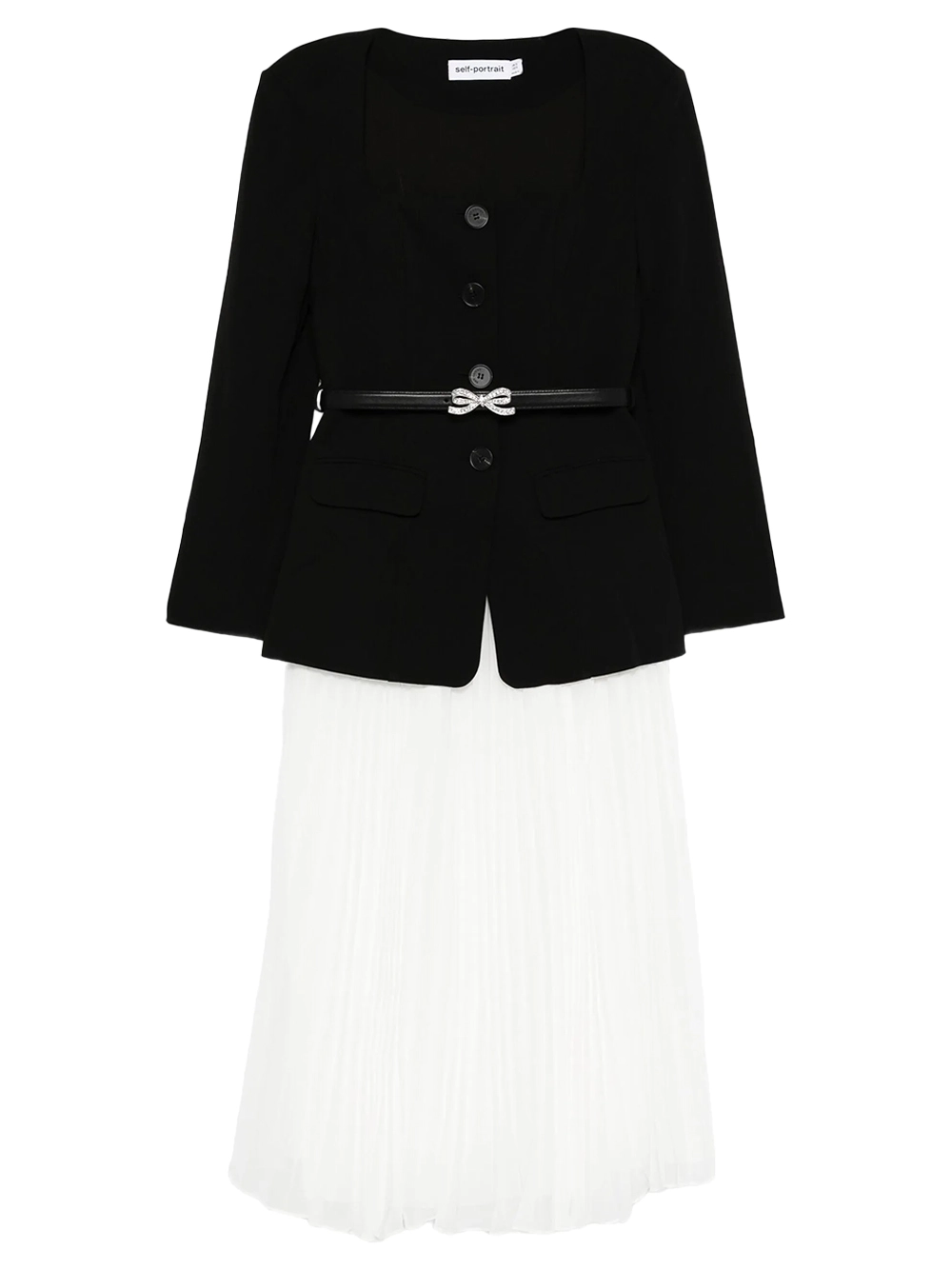 The Self-Portrait Contrast Dress in Black is a chic yet practical choice, featuring a button-front bodice and contrast trim that exudes modern elegance. The skirt's elasticated waistband provides ample storage capacity, while a removable grosgrain bow belt adds a touch of elegance and volume. This dress is cut to a flattering midi length, making it a versatile choice.