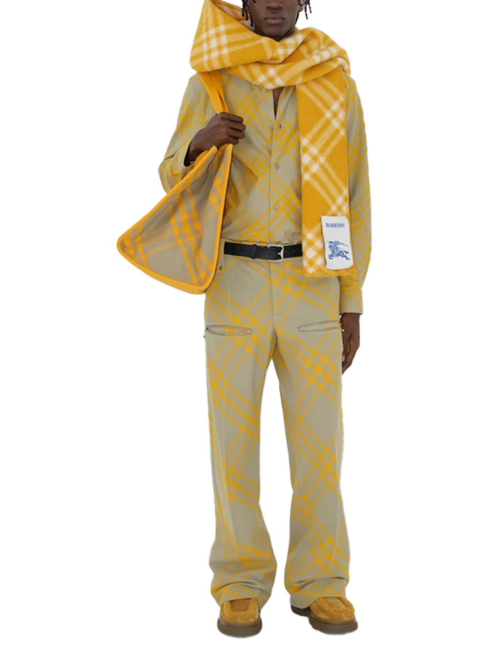 Burberry Check Wool Hooded Scarf Yellow-with model(1) Burberry Check Wool Hooded Scarf Yellow-with model(1)