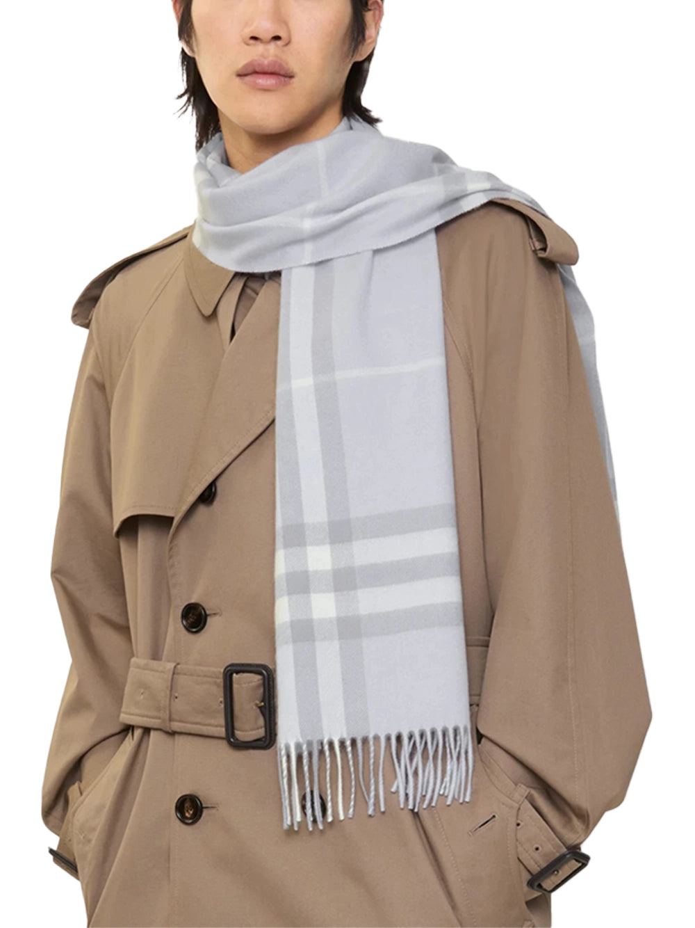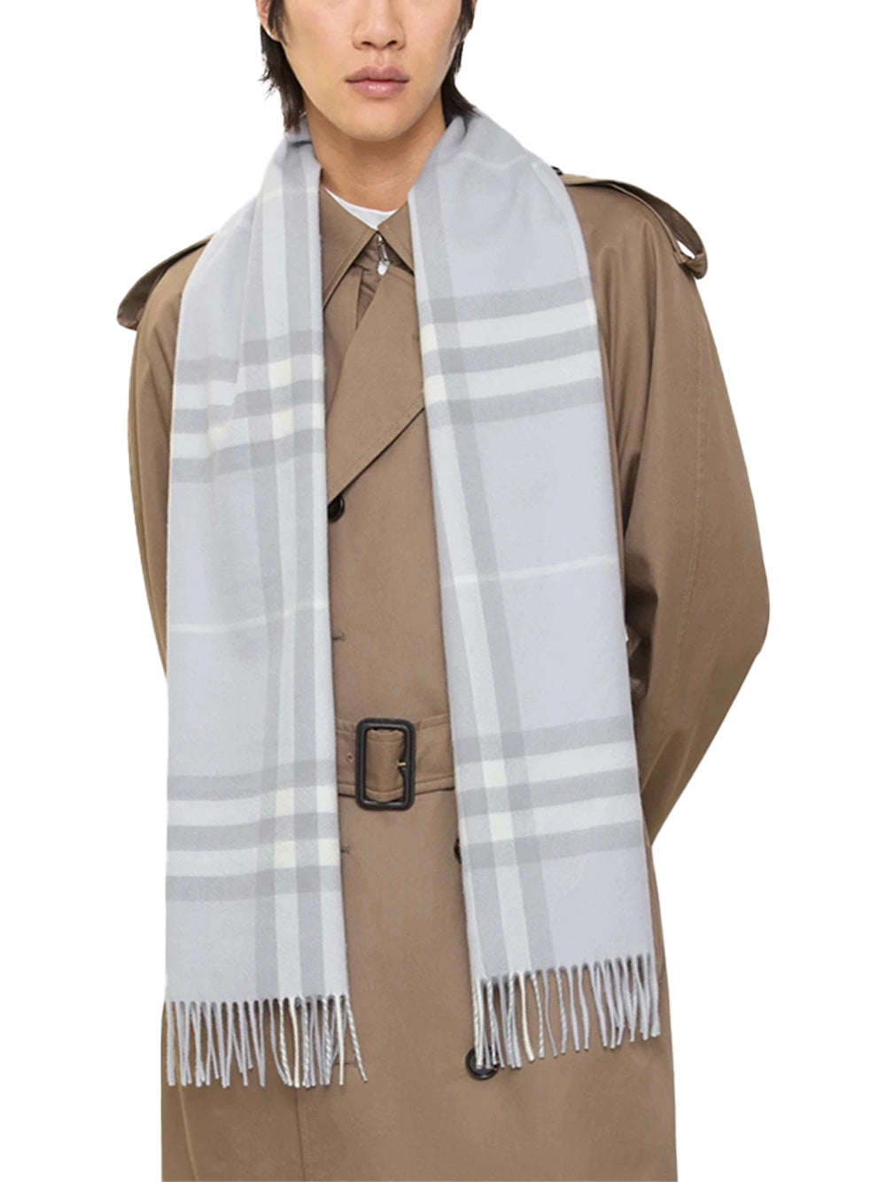 Experience timeless British luxury with this Burberry scarf, crafted from pure cashmere on traditional looms in the iconic check pattern. This mist-colored Burberry cashmere scarf features the rectangular shape and elegant fringe ends that have become synonymous with heritage craftsmanship. The versatile design makes this Burberry scarf men and women to appreciate in transitional seasons.