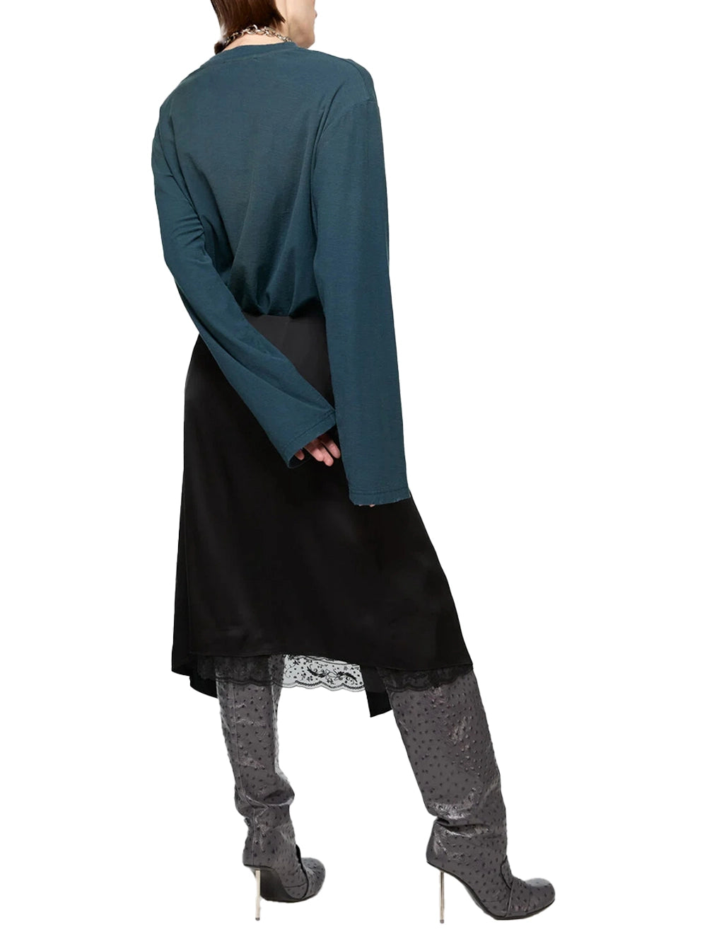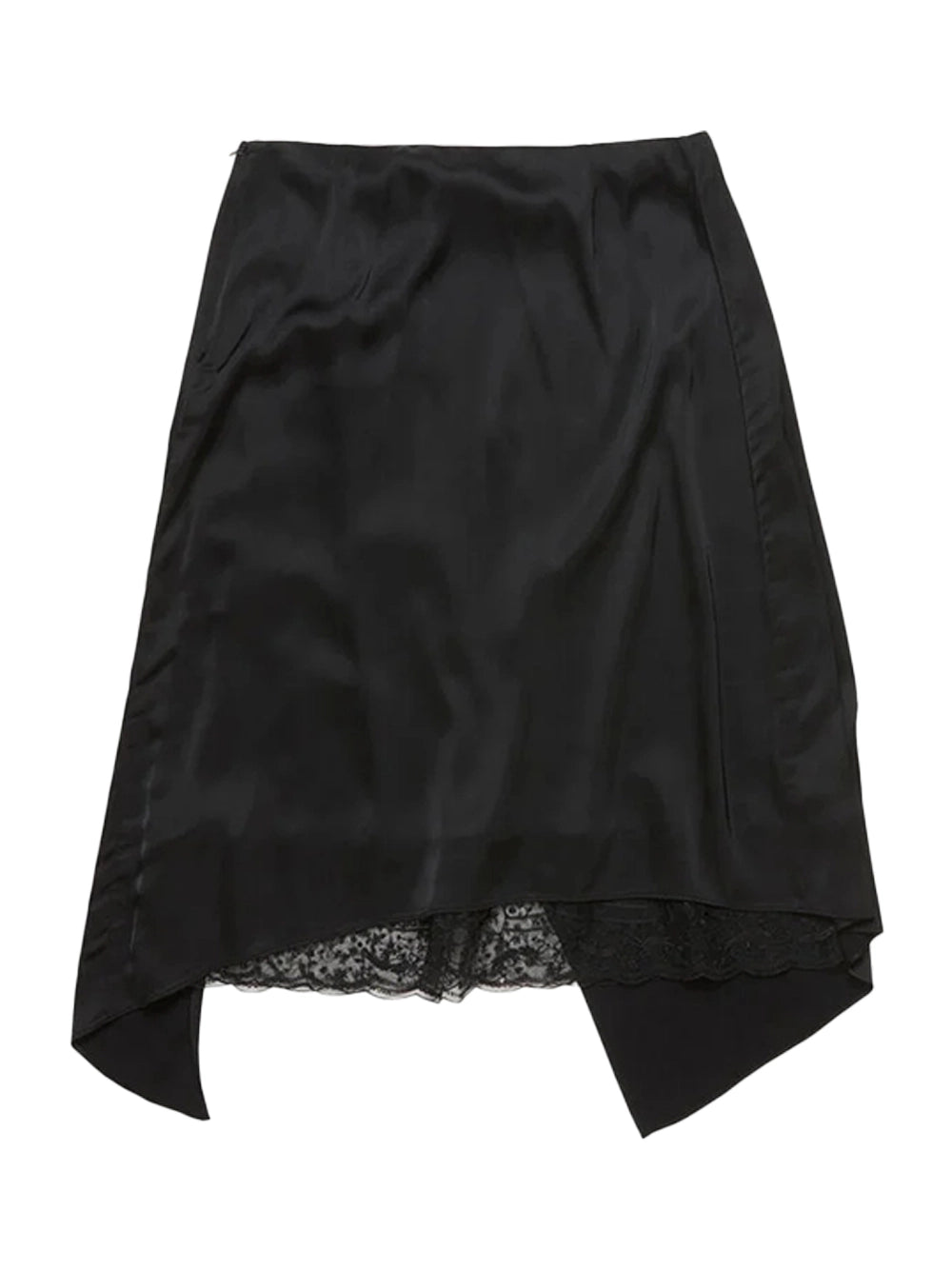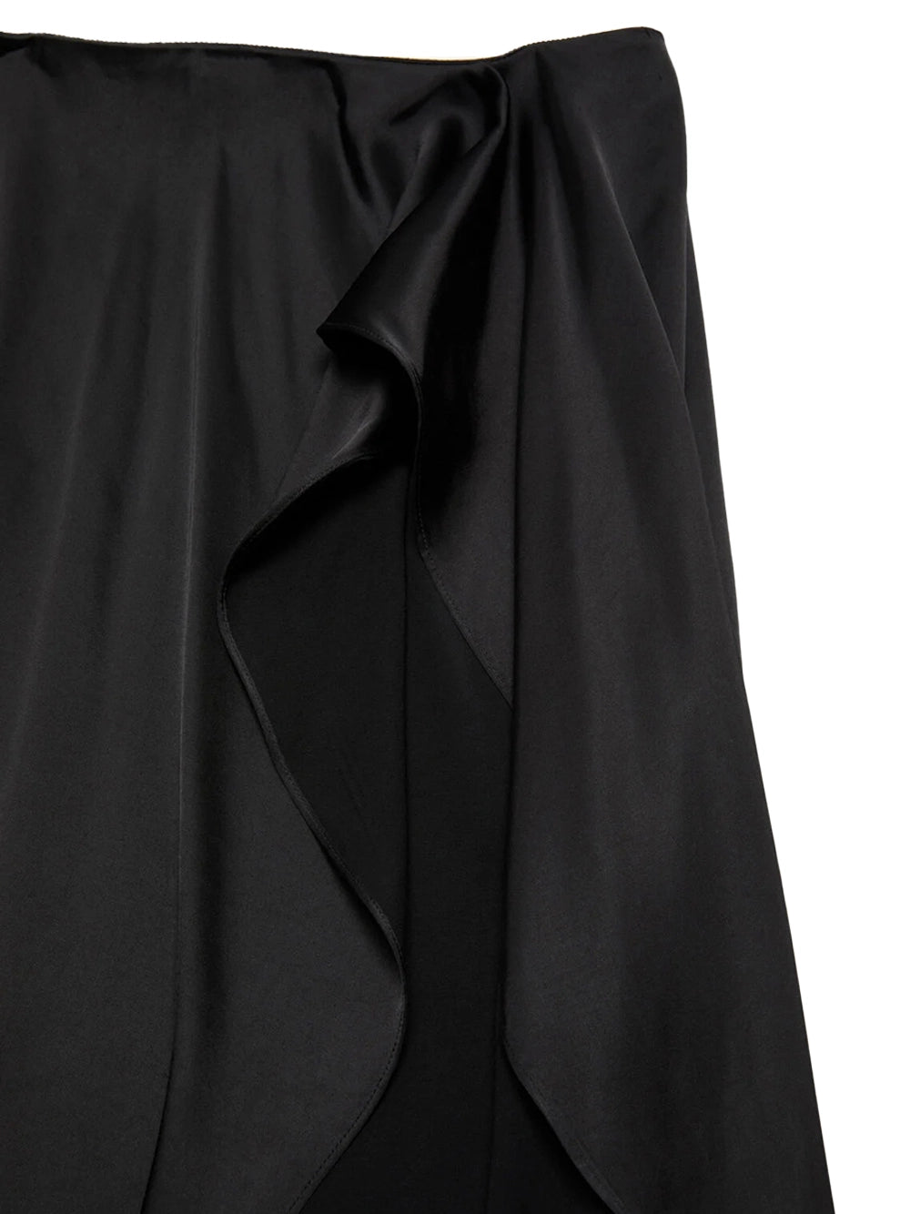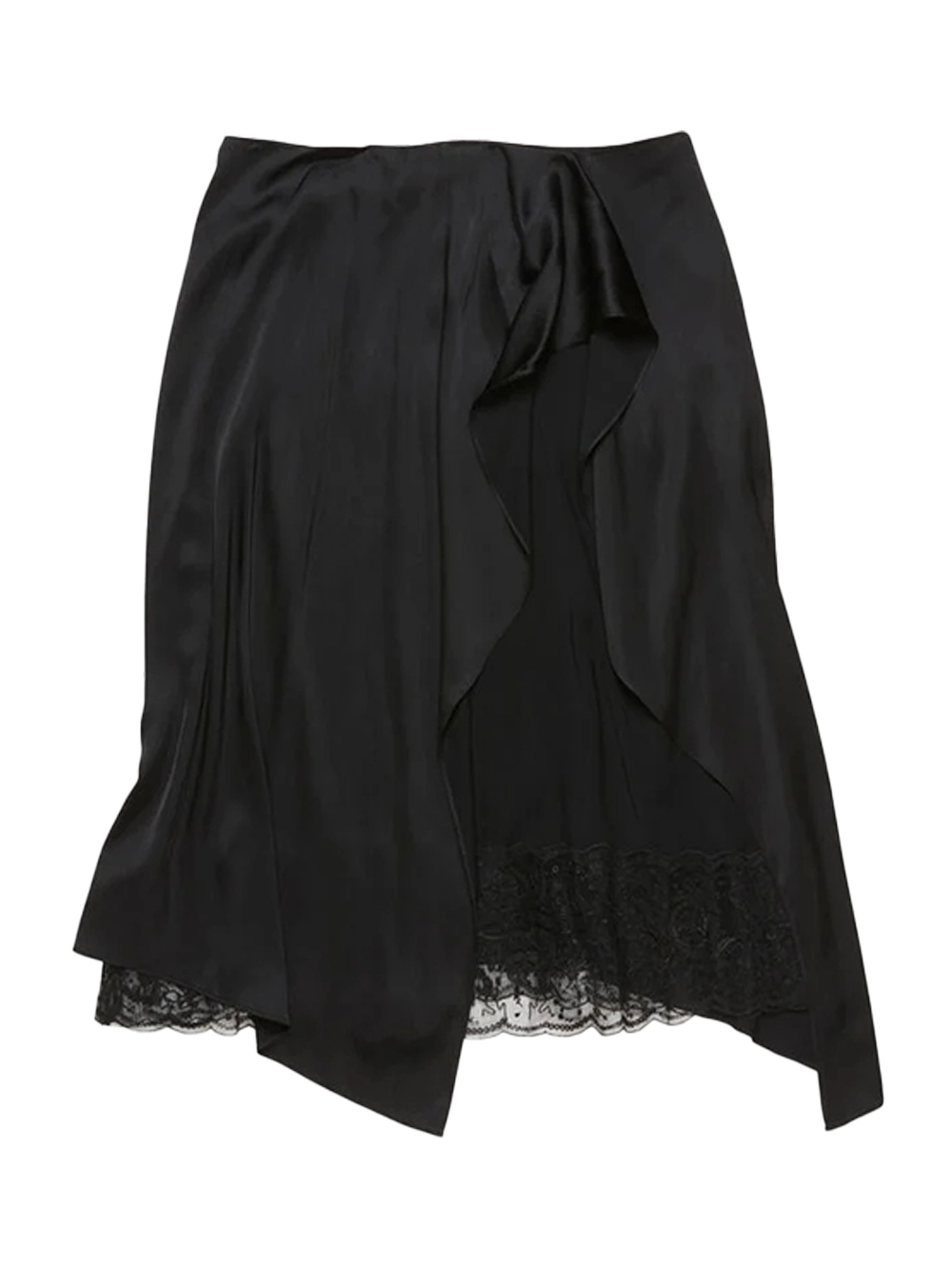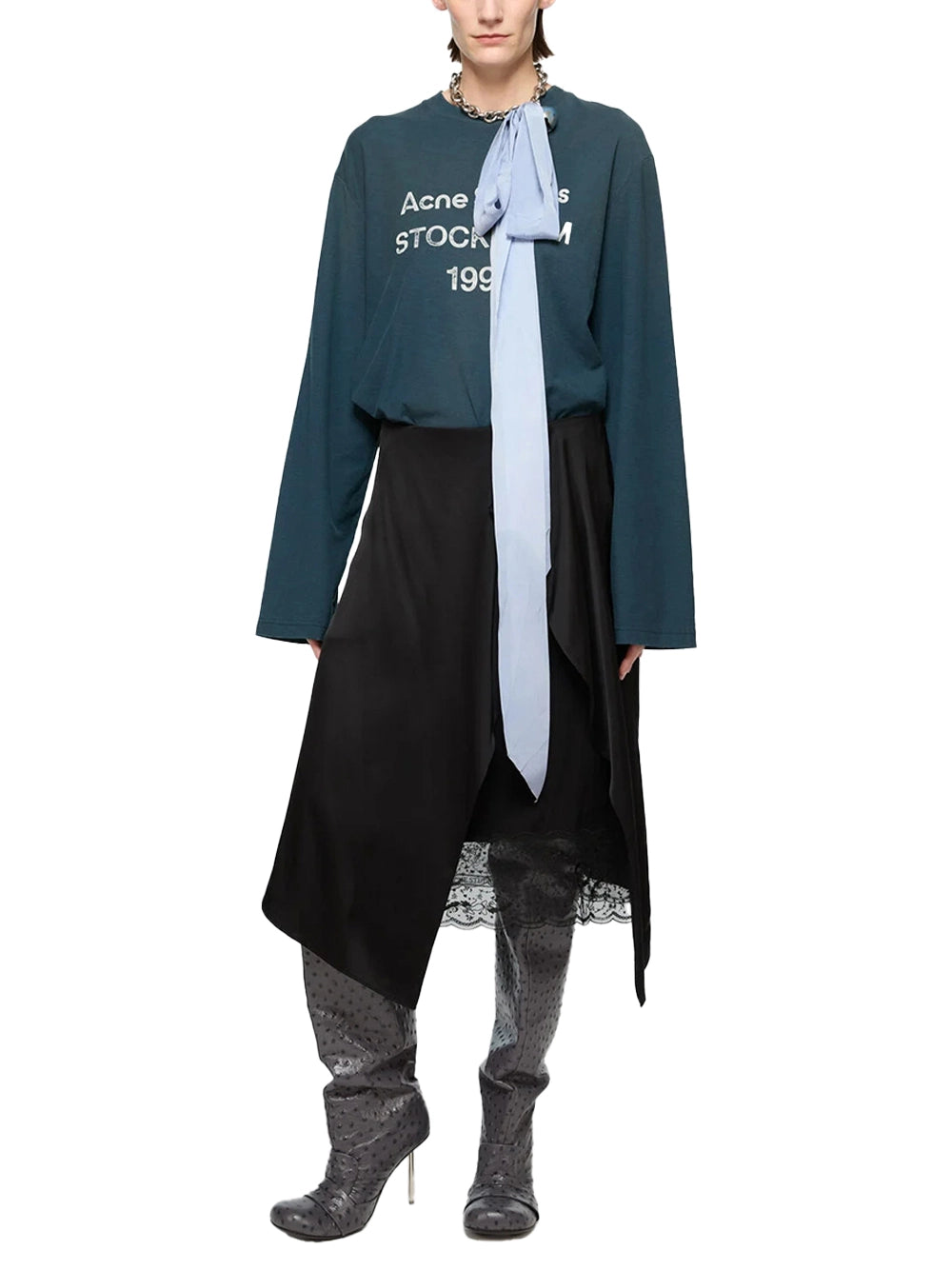 Embrace dark elegance with Acne Studios and this fluid black satin skirt. This acne studios skirt black features a layered pleat build and an acne skirt aesthetic. A mid-rise acne studios fit meets the knee in this black satin skirt essential.