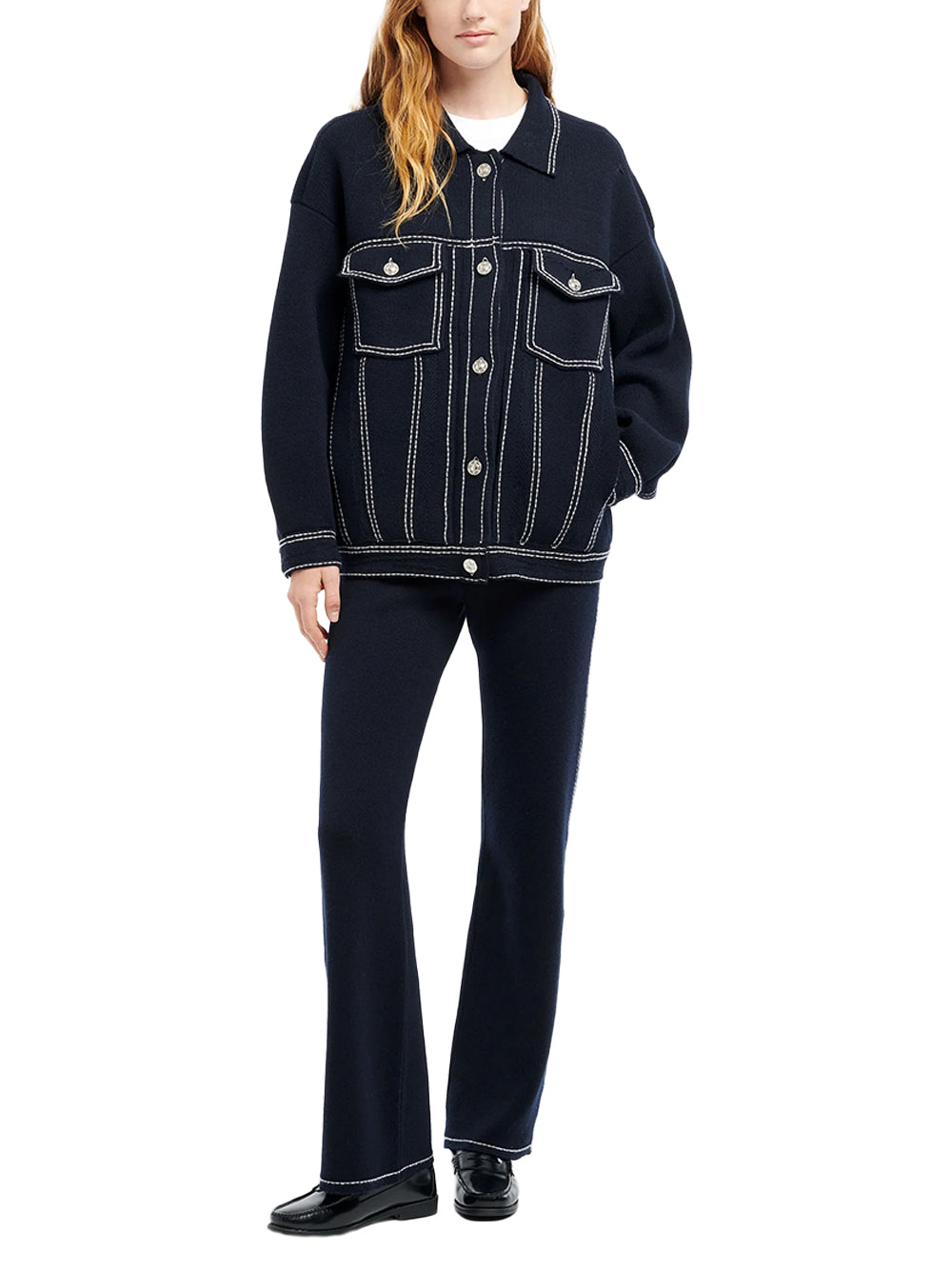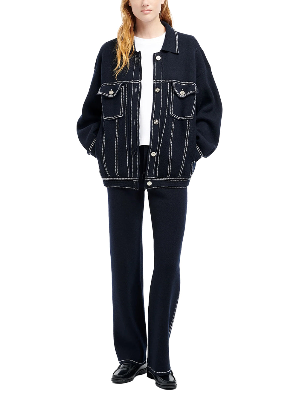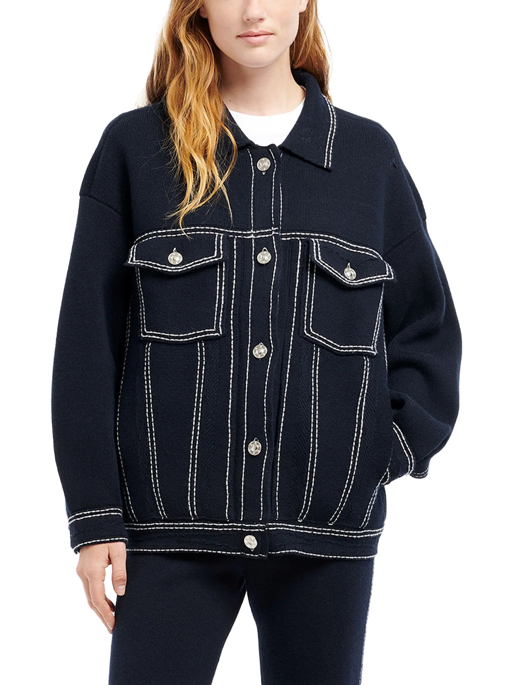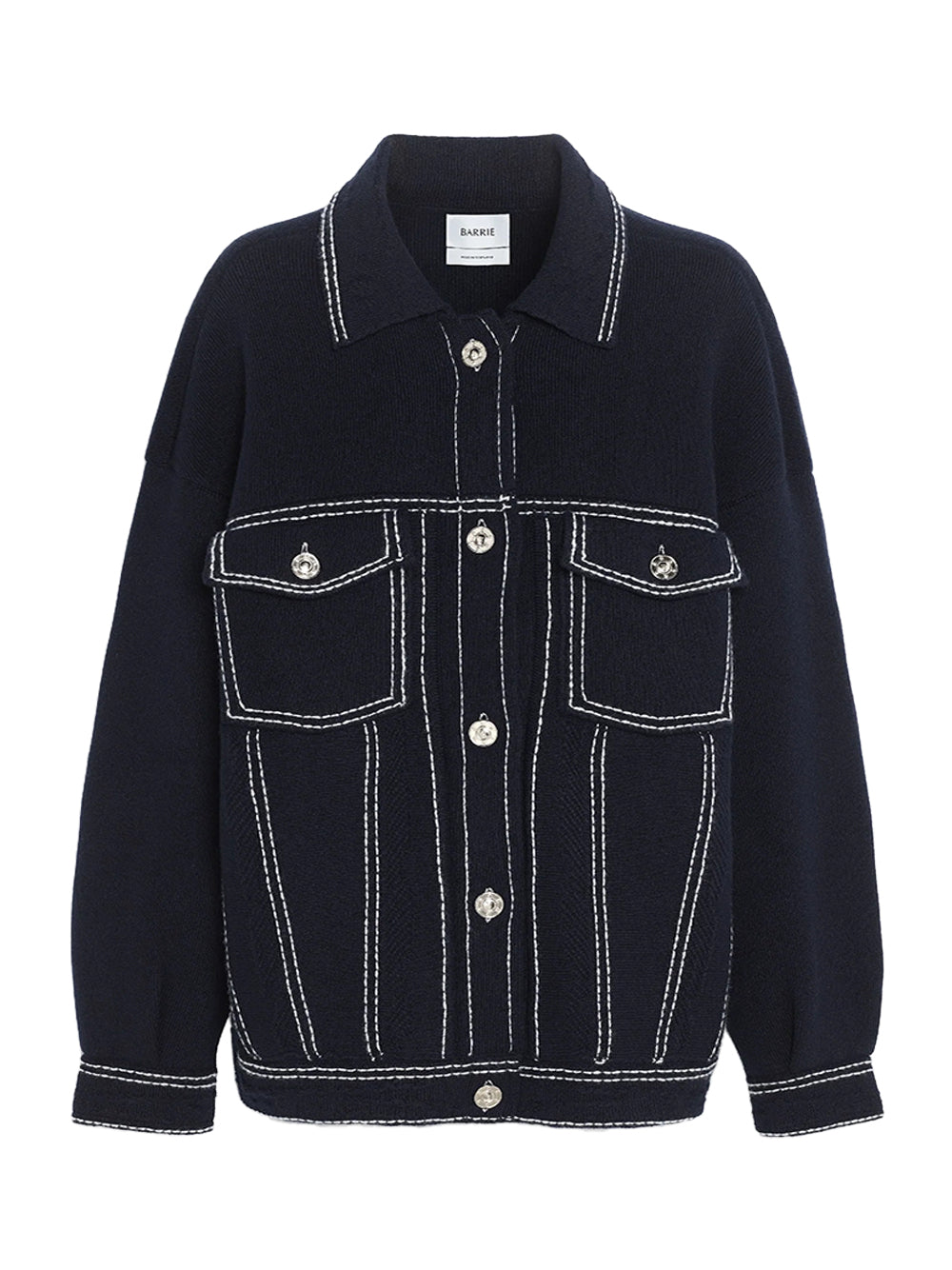 Discover contemporary comfort with Barrie denim cashmere cotton jacket in classic navy. This premium Barrie jacket combines cashmere-cotton blend fabric with an elegant oversize silhouette for modern styling. The sophisticated design features precise topstitch seams and distinctive Barrie branded metal buttons throughout. Perfect for London's fashion-forward, this versatile Barrie coat alternative offers both relaxed elegance and luxury craftsmanship.