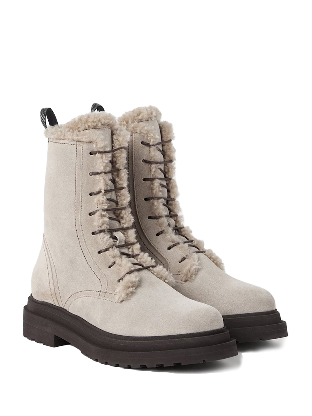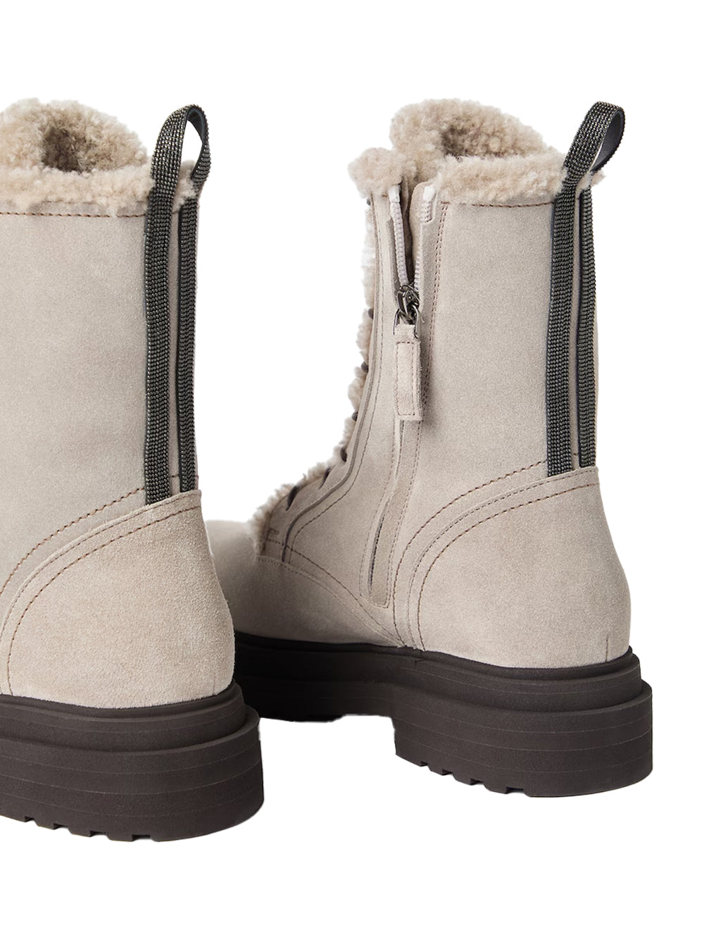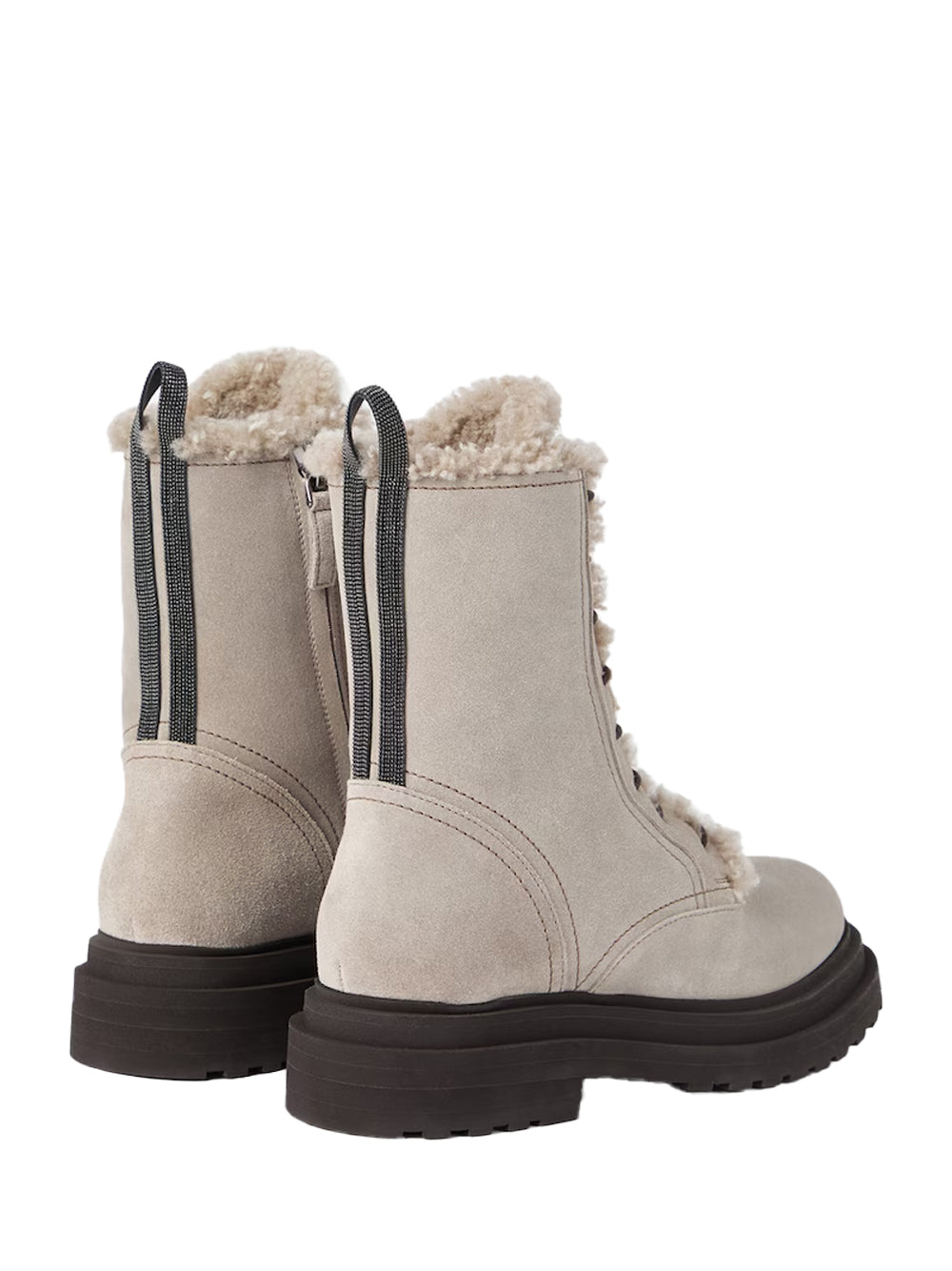 Brunello Cucinelli Shearling-Lined Boots — Light Grey. Italian-made suede ankle boots with plush shearling lining, round waxed laces, inner side zip, leather lining and a lightweight micro-rubber sole with a 4 cm heel. Finished with a nickel-free monili detail at the heel for a discreet sparkle.