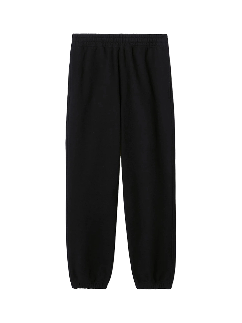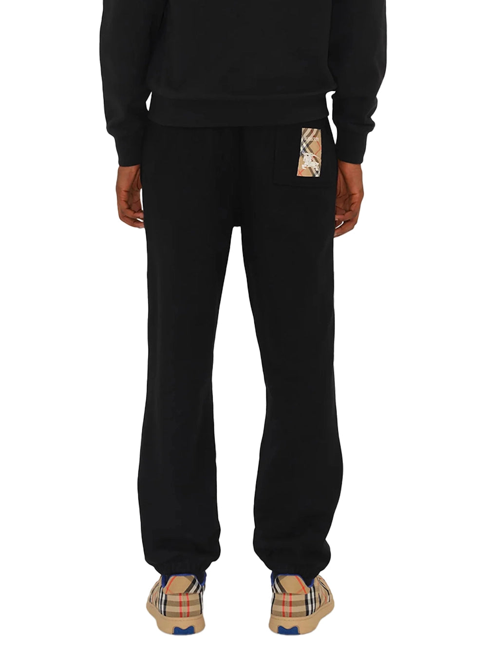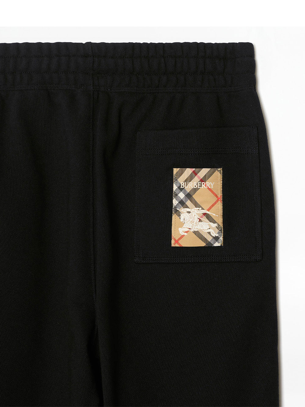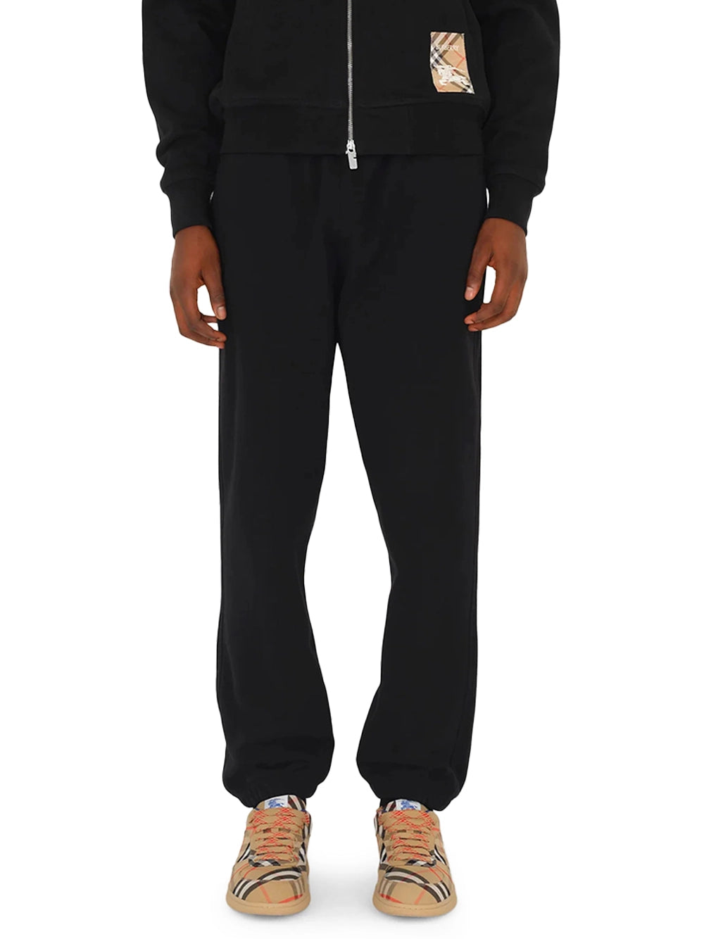 Burberry trousers are crafted from soft cotton jersey, featuring a classic straight-leg cut and a practical internal drawstring waist for an adjustable fit. Designed with side-entry pockets and a rear patch pocket, these black Burberry trousers are subtly branded. A signature check patch and a logo combining the Burberry wordmark with the equestrian knight device complete the look.