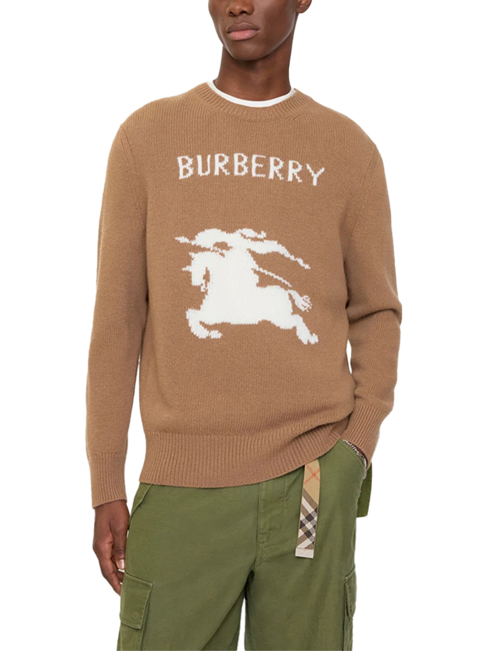 Experience luxurious comfort with Burberry men's EKD sweater in classic camel. Crafted from premium wool-cashmere blend, this Burberry sweater mens features ribbed trim and regular fit. The crewneck design showcases signature Burberry knit lettering with contrast Equestrian Knight emblem. This sophisticated Burberry jumper offers timeless style for both casual and formal occasions, embodying British heritage craftsmanship in every detail.
