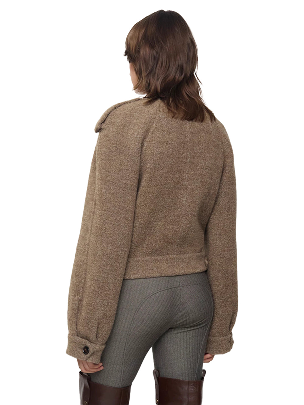 Discover sophisticated tailoring with Burberry women's jacket in elegant biscuit. This wool blend Burberry jacket womens features button-front closure, epaulettes, and side buttoned welt pockets. The adjustable side tabs and button cuffs create a customized fit, while the detachable scarf adds versatile elegance.