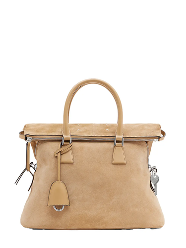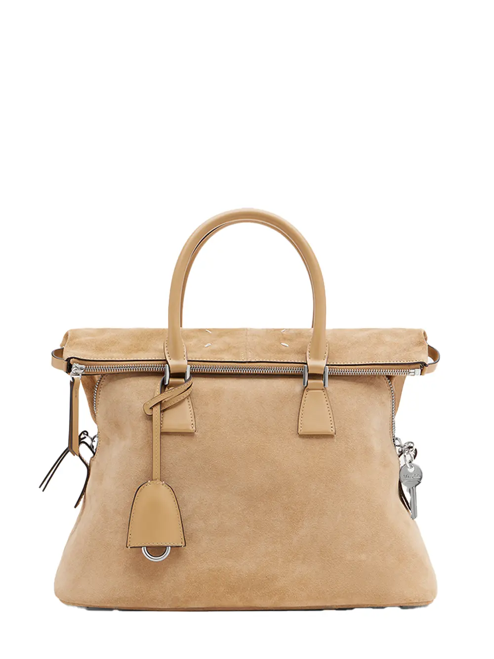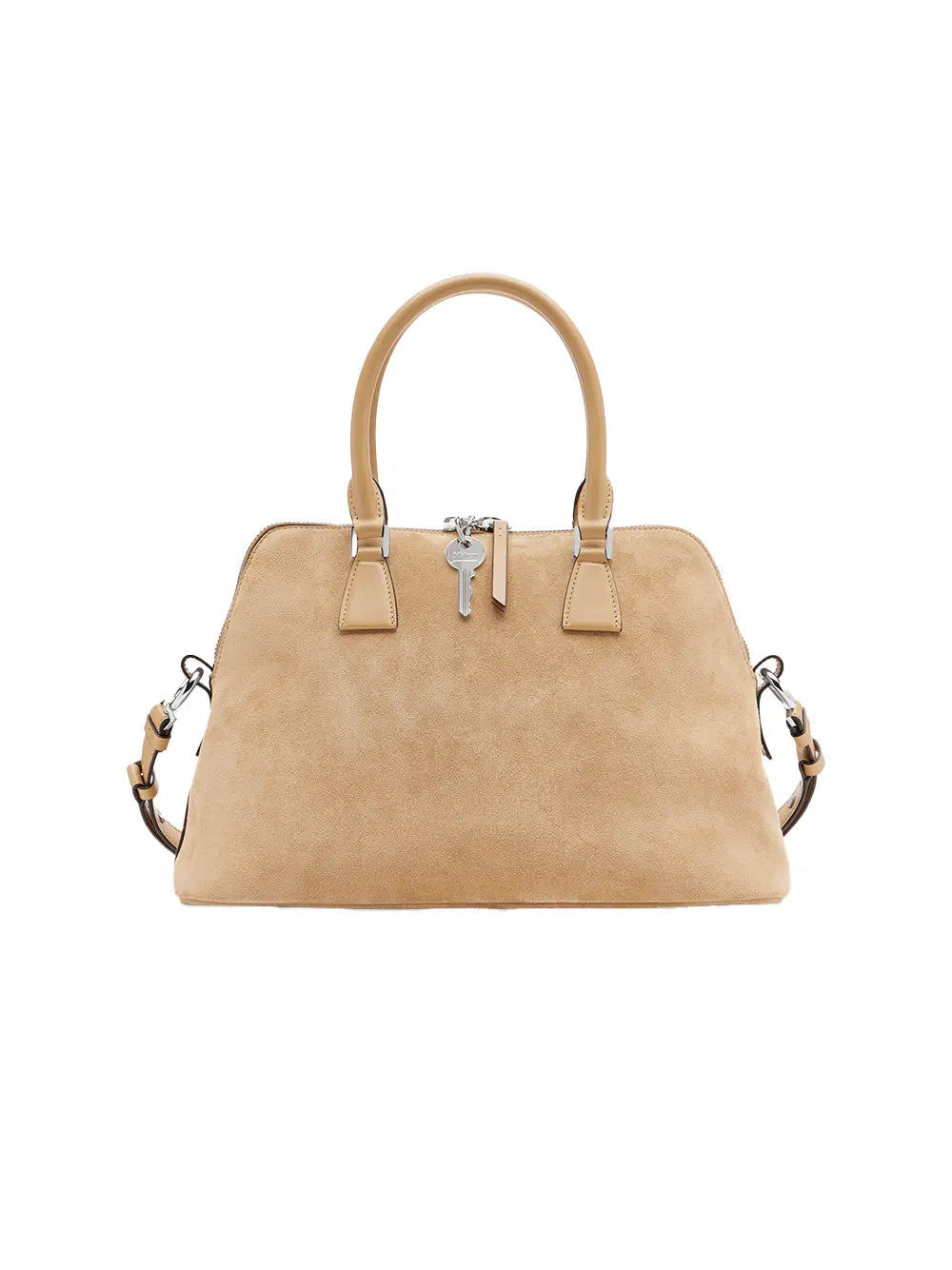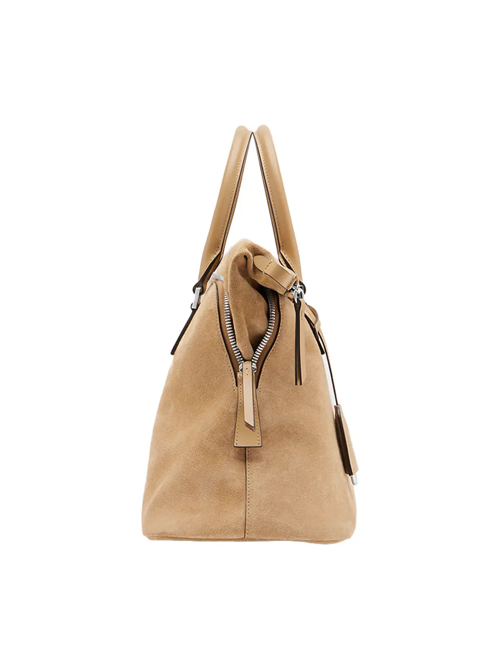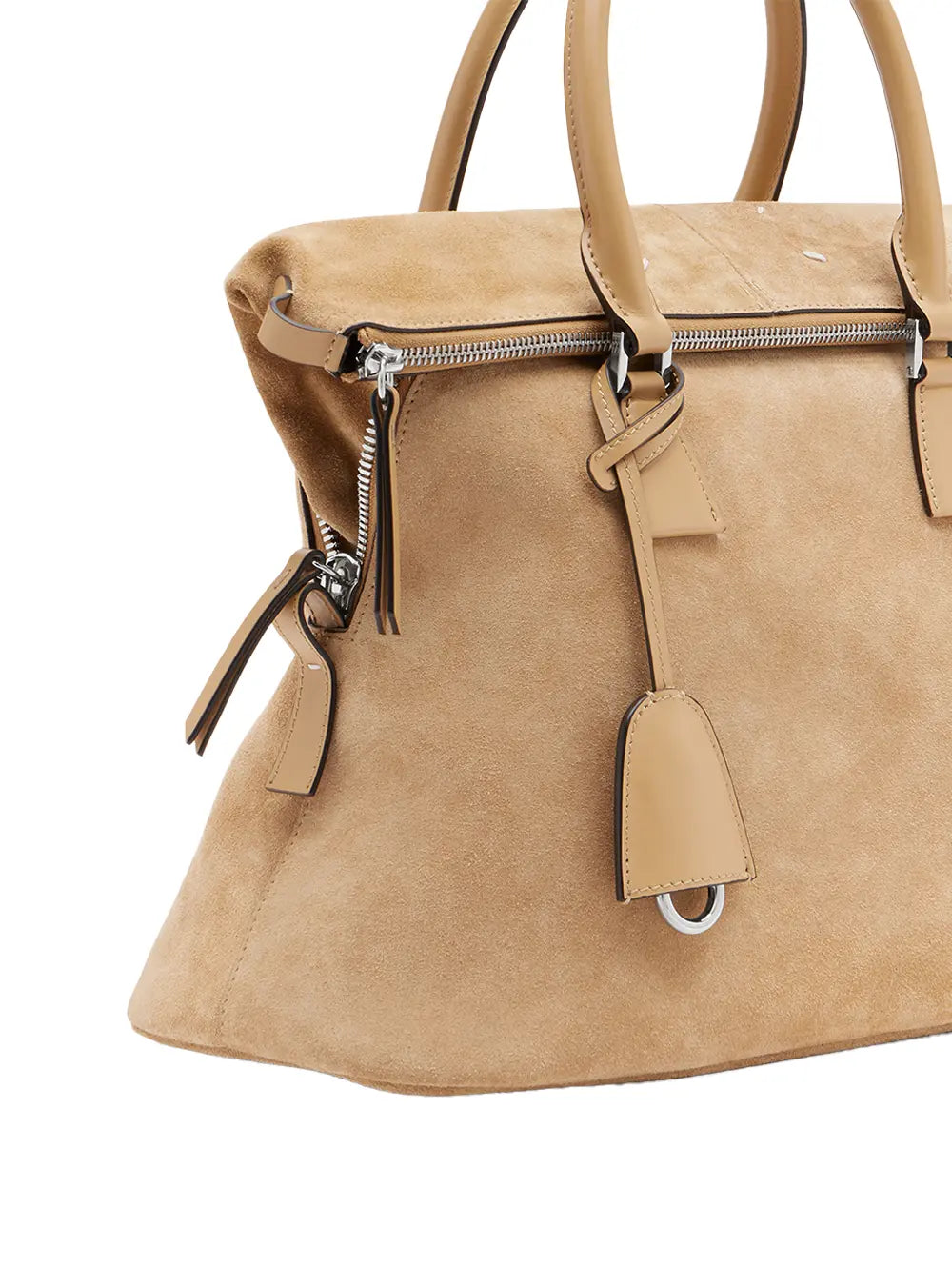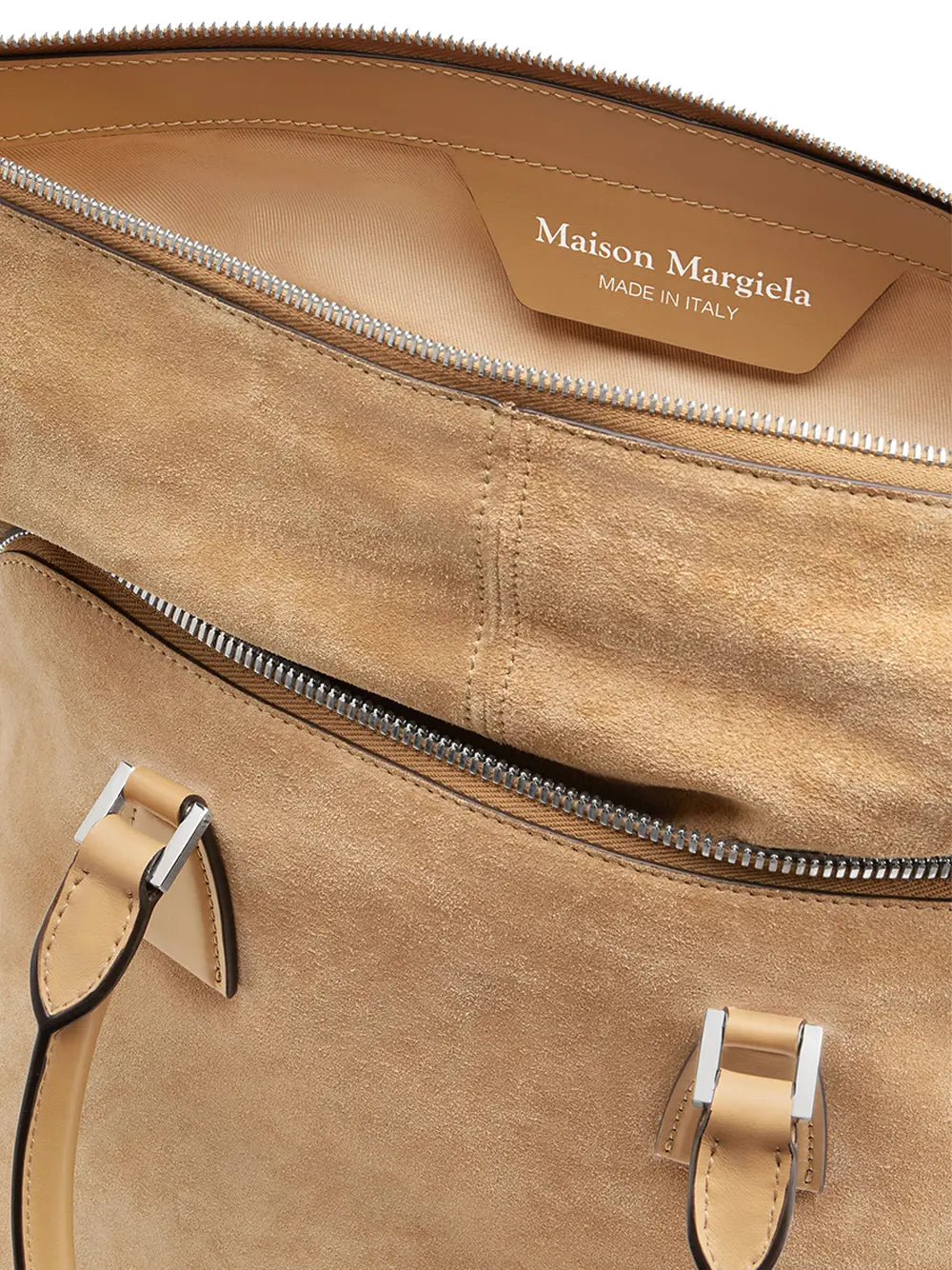 This luxurious Maison Margiela bag is crafted in Italy from a refined blend of suede and soft calfskin. Featuring dual top handles and a detachable, adjustable shoulder strap, this versatile bag maison margiela offers multiple styling options. Secure your essentials with the convenient top zip closure. The design is distinguished by the iconic four-stitch detail on the back and an internally stamped brand logo.