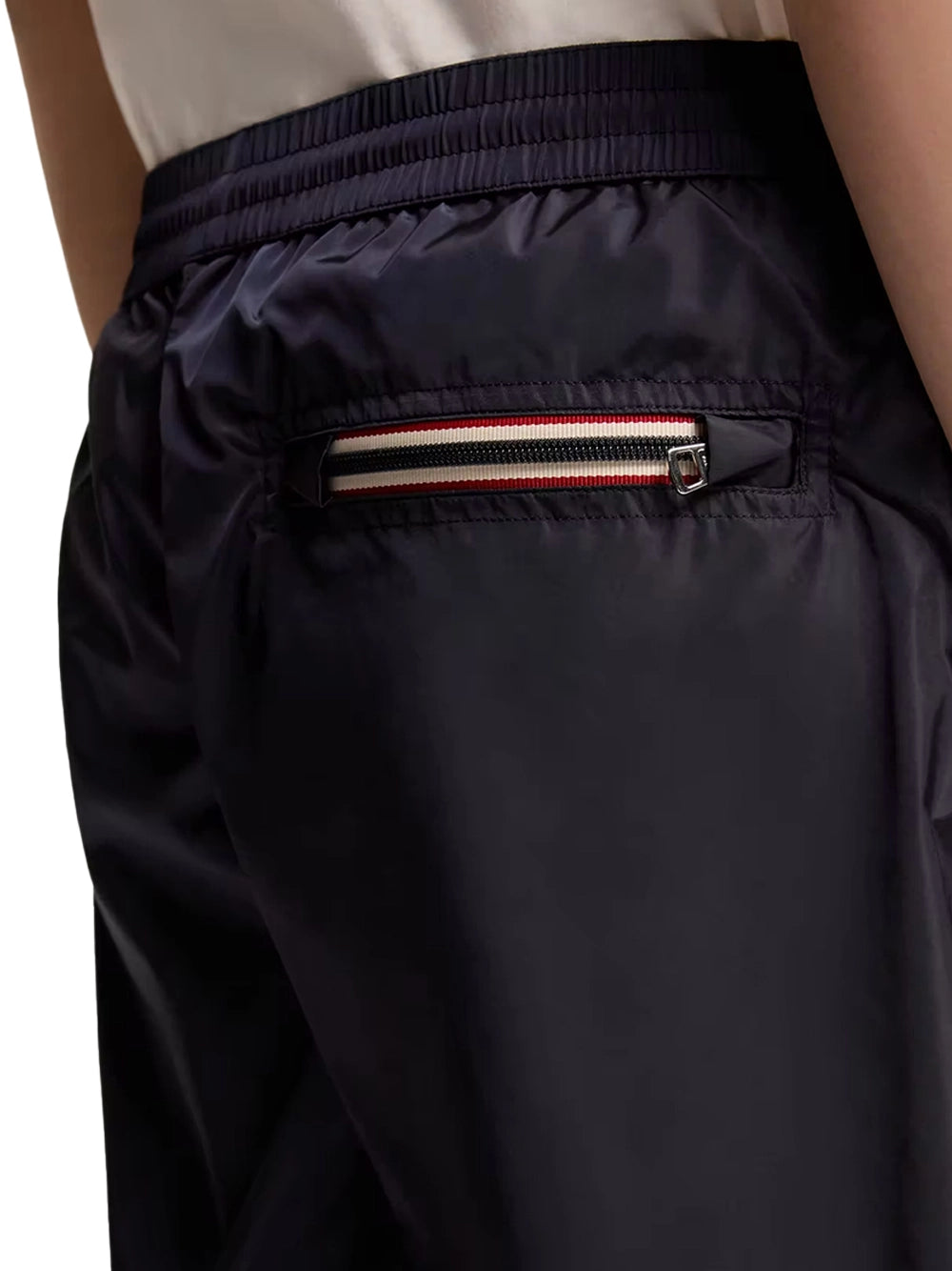 - Zipped back pocket with tricolor trim
