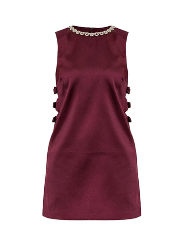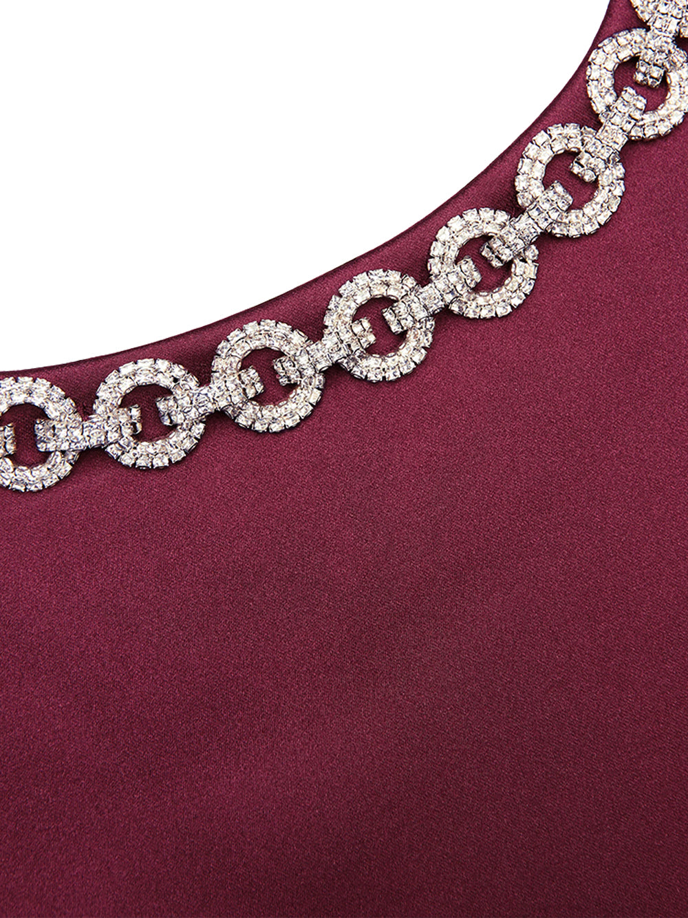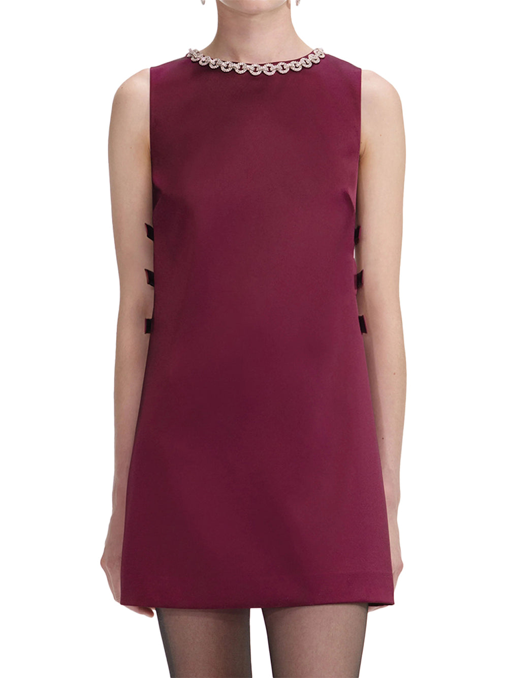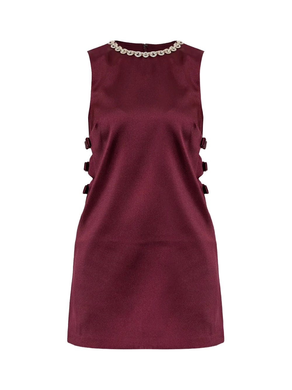 Discover luxurious comfort with Self-Portrait satin mini dress in rich burgundy. This self portrait piece offers true-to-size sizing with a relaxed silhouette, featuring sophisticated side cut-outs and convenient side zip fastening. The elegant neckline showcases signature crystal chain detailing, creating a striking self portrait red dress perfect for special occasions. Currently available in the self portrait dress sale, this exquisite design combines effortless elegance with the brand's signature craftsmanship.