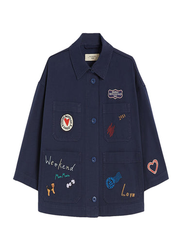 Discover sophisticated tailoring with this Weekend MaxMara Assuan jacket in classic navy. The elegant Weekend Max Mara design features a sharp pointed collar and distinctive bracelet-length sleeves with decorative patches and embroidery. This versatile weekend jacket includes front button fastening and practical patch pockets for everyday elegance.
