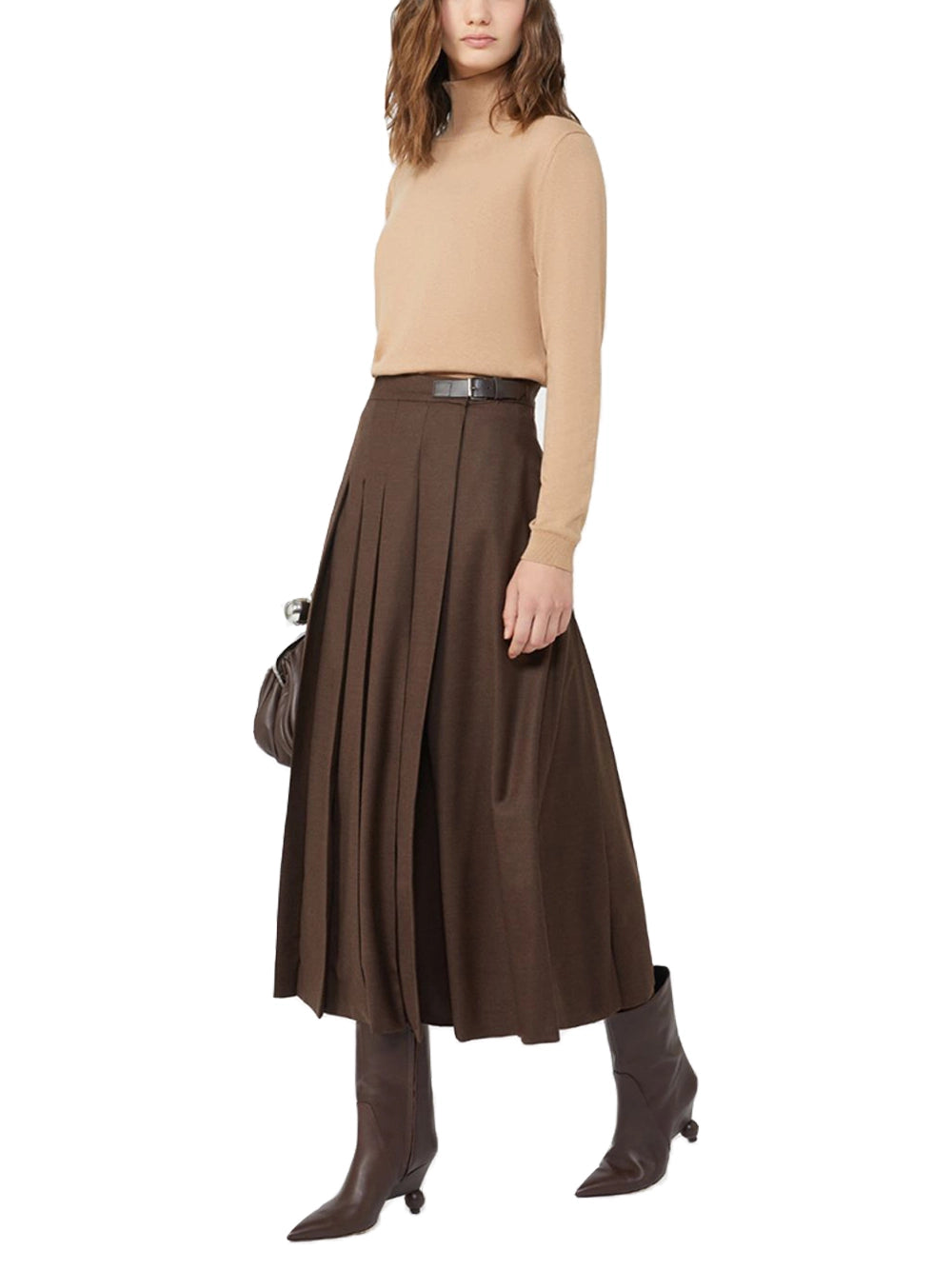 Indulge in the elegant drape of our Weekend Max Mara skirt, crafted from sumptuously soft wool flannel. This flared Weekend Max Mara design features a chic faux-leather buckled strap wrap closure at the left side . Practical side slit pockets and vented slits at the hem enhance its stylish silhouette, perfect for a sophisticated Max Mara weekend look. Embrace the confident and understated charm that defines the Weekend Max Mara collection . This versatile skirt is an essential piece for your curated wardrobe, offering effortless style for any occasion.