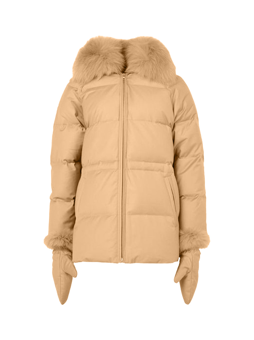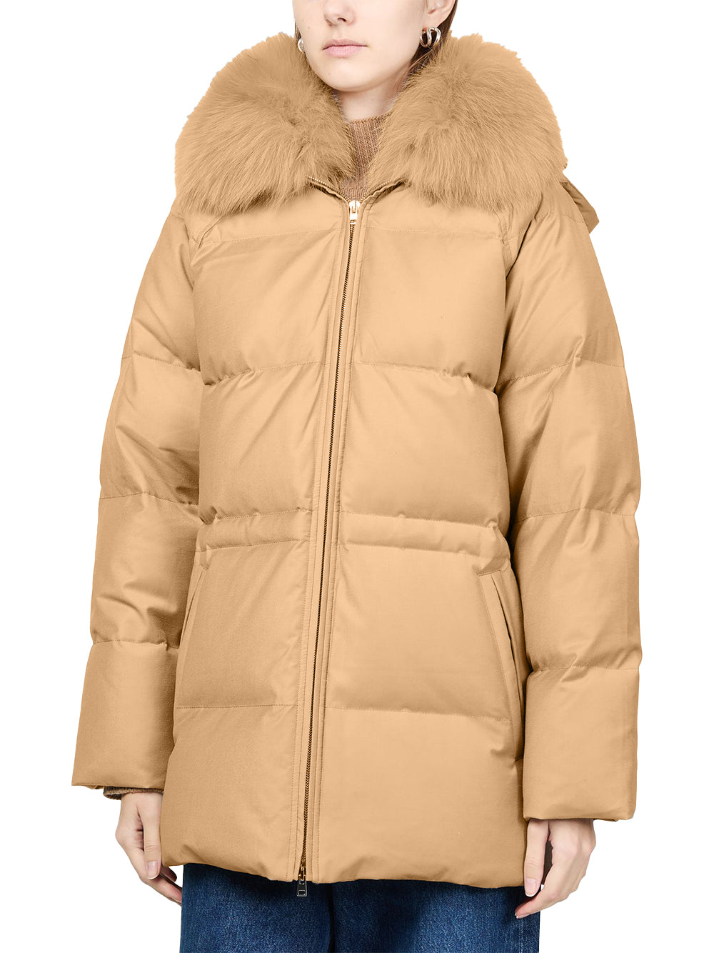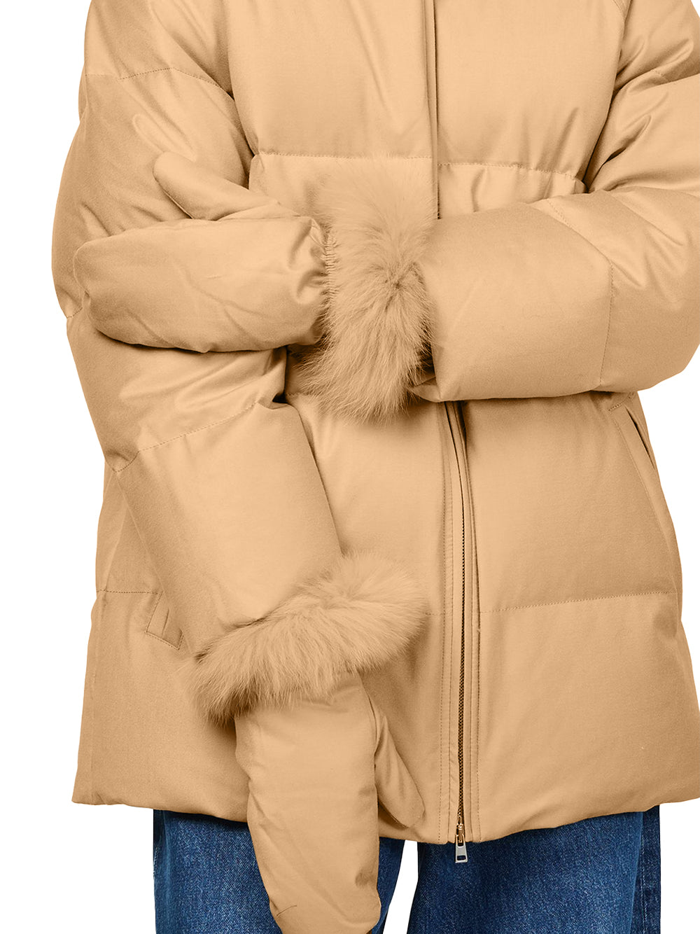 Experience exceptional warmth with Yves Salomon down coat in elegant macadamia. This short-length Yves Salomon coat combines thermal fabric with luxurious fur detailing and textured fill for maximum insulation. Featuring a collar, long sleeves, side pockets, and zip-front closure, this lined coat Yves Salomon offers sophisticated protection from British winters.