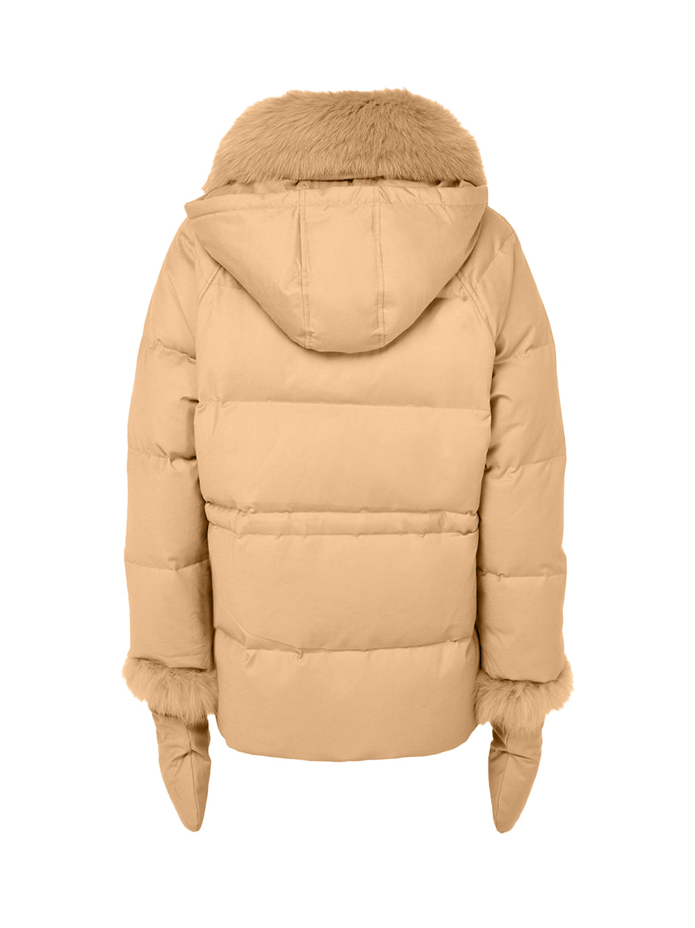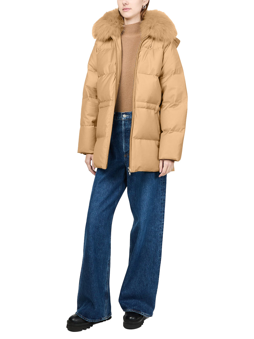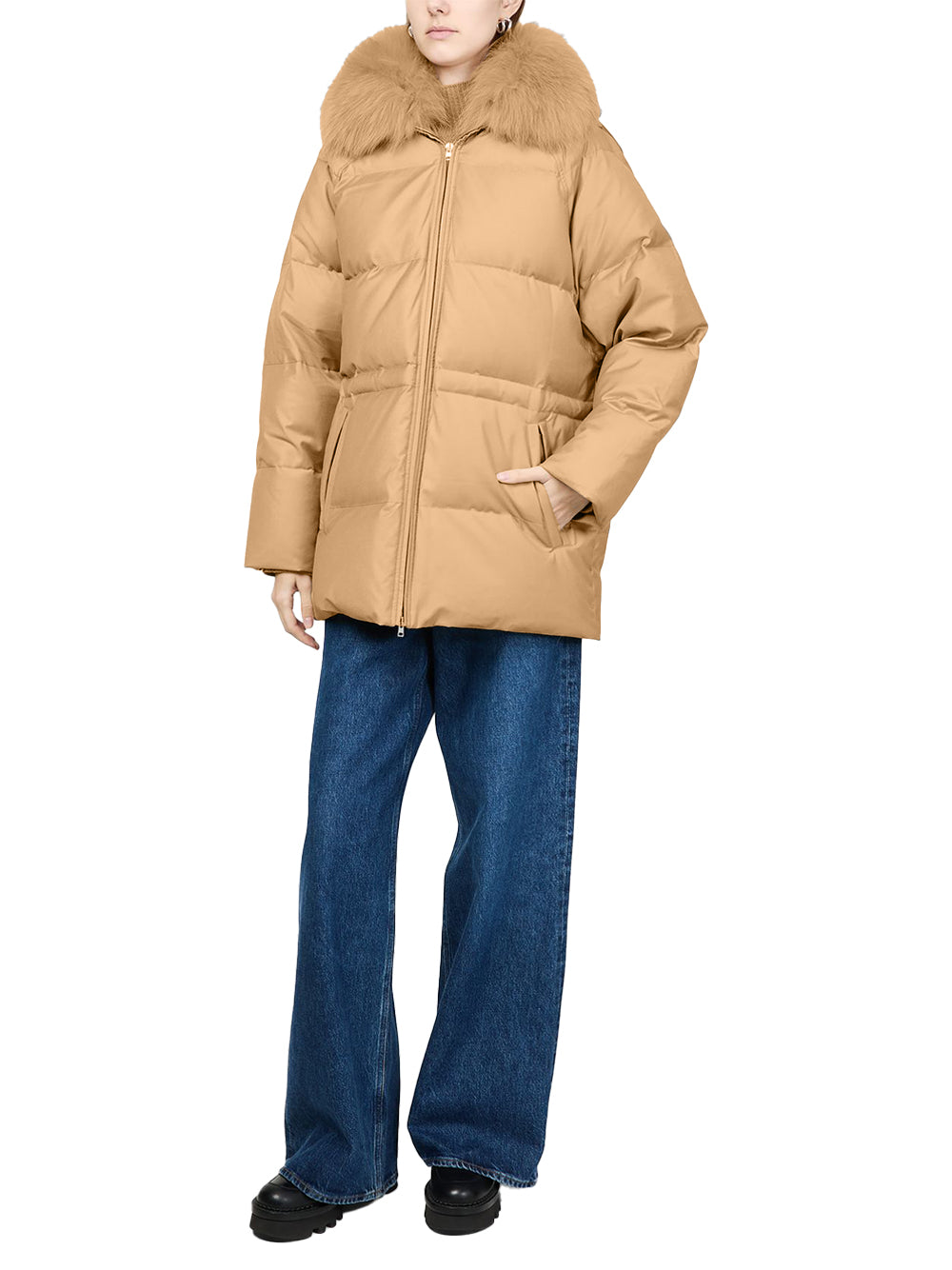 Experience exceptional warmth with Yves Salomon down coat in elegant macadamia. This short-length Yves Salomon coat combines thermal fabric with luxurious fur detailing and textured fill for maximum insulation. Featuring a collar, long sleeves, side pockets, and zip-front closure, this lined coat Yves Salomon offers sophisticated protection from British winters.