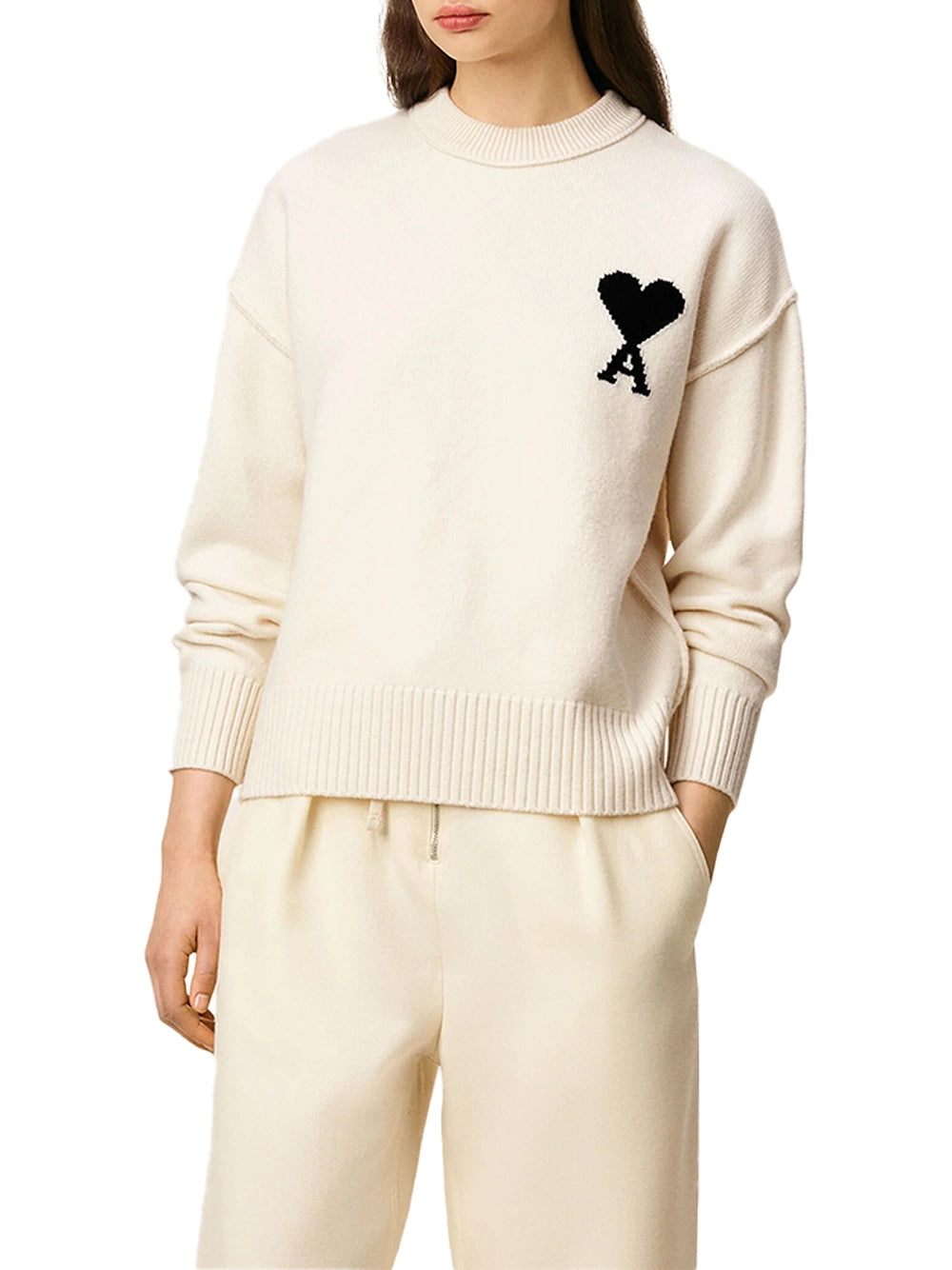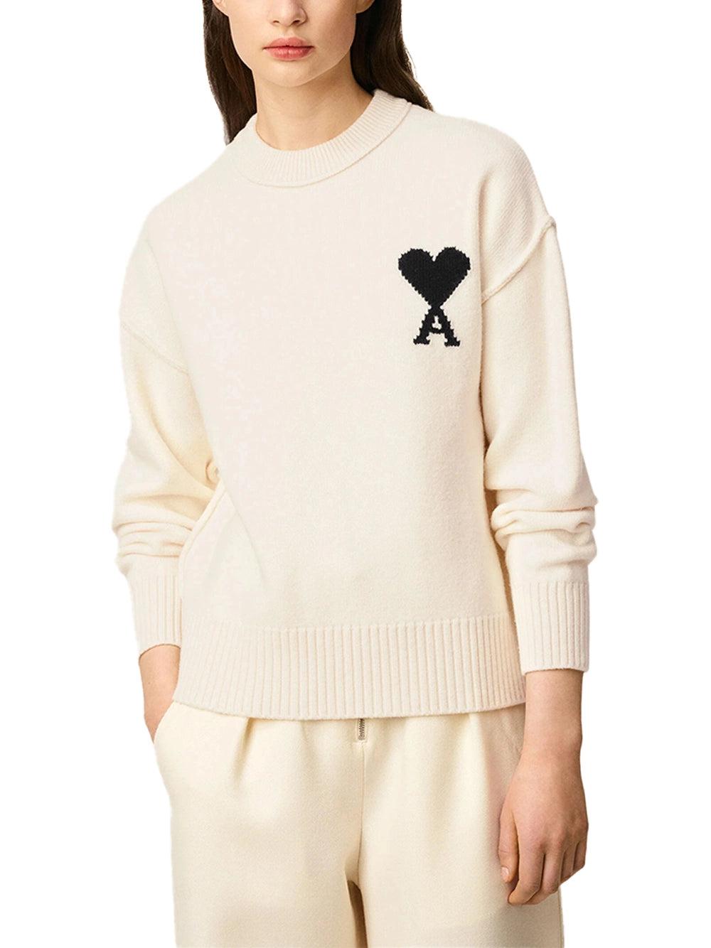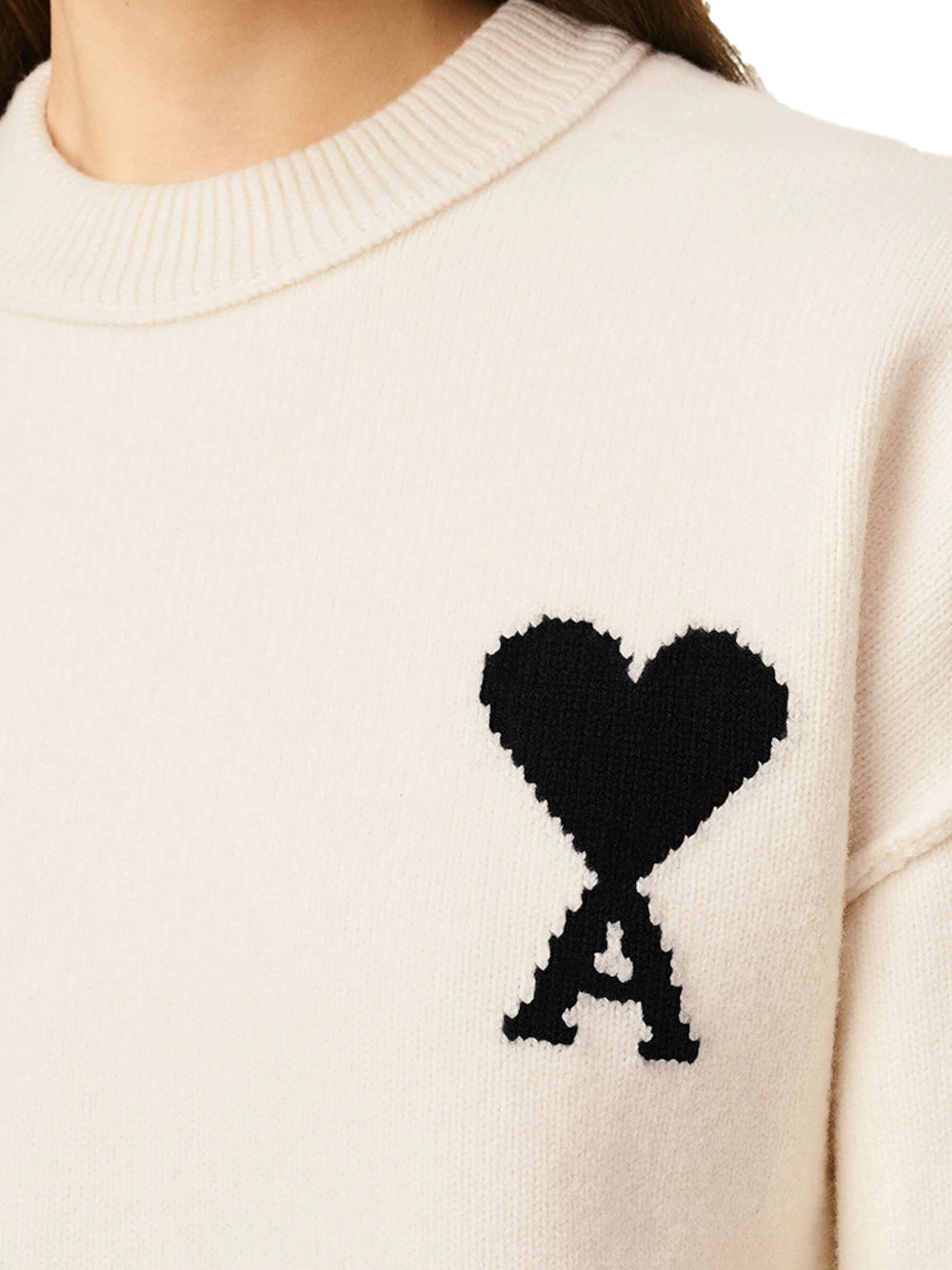 AMI Wool Crewneck Sweater White/Black-front detial with women model AMI Wool Crewneck Sweater White/Black-front detial with women model