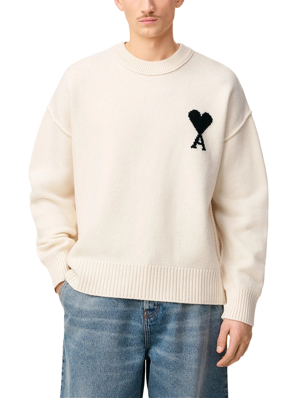 AMI Wool Crewneck Sweater White/Black-front detial ith men model AMI Wool Crewneck Sweater White/Black-front detial ith men model
