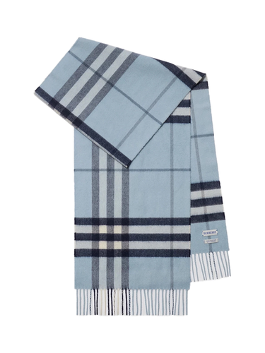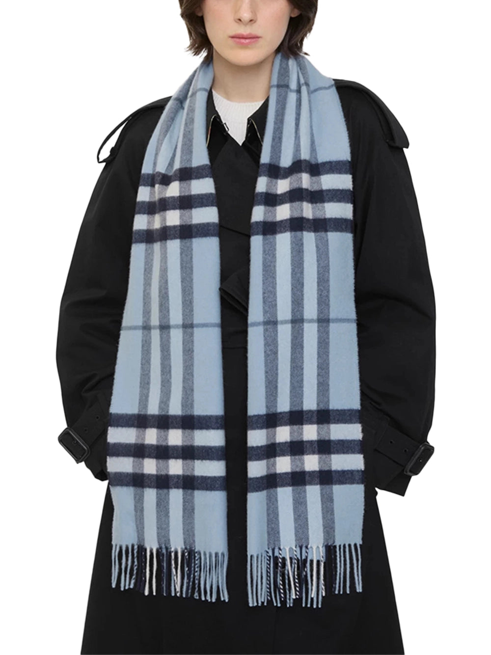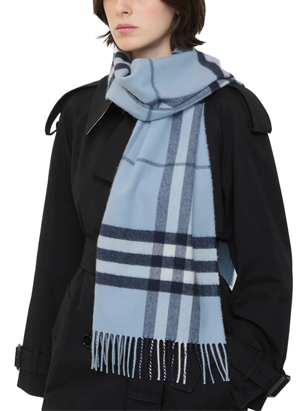 Discover timeless British luxury with this Burberry scarf, crafted from 100% cashmere in a sophisticated bank blue hue. This iconic Burberry cashmere scarf features the signature check pattern, elegantly finished with classic fringe ends. The rectangular shape ensures versatile styling for both men and women, making this Burberry scarf men and women will appreciate. Experience exceptional softness and lightweight warmth with this essential Burberry scarf women's collection piece.