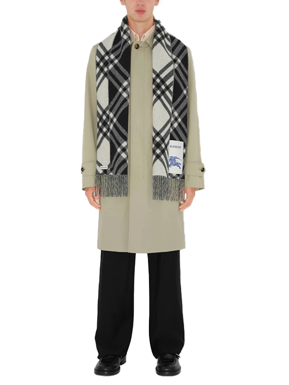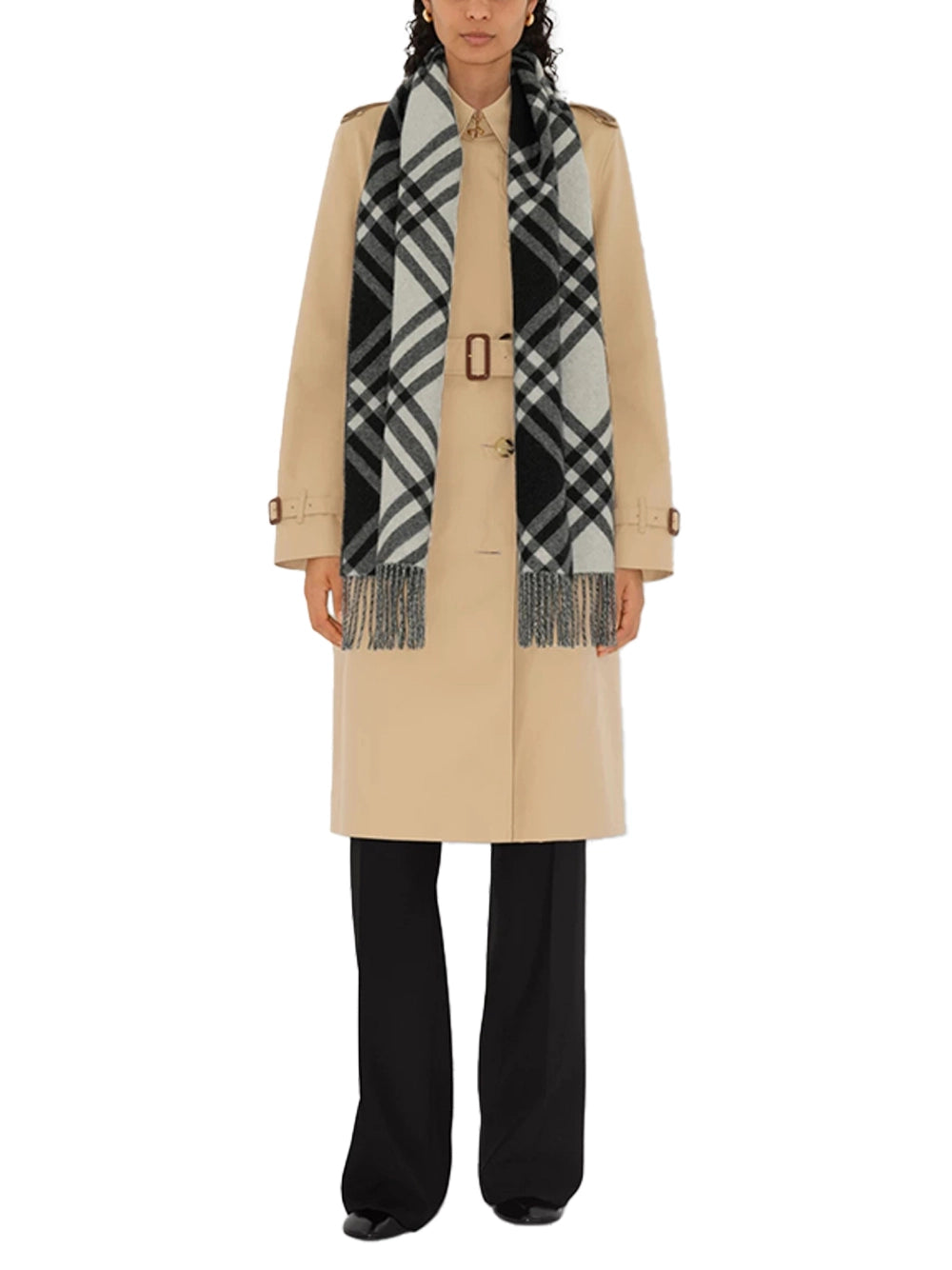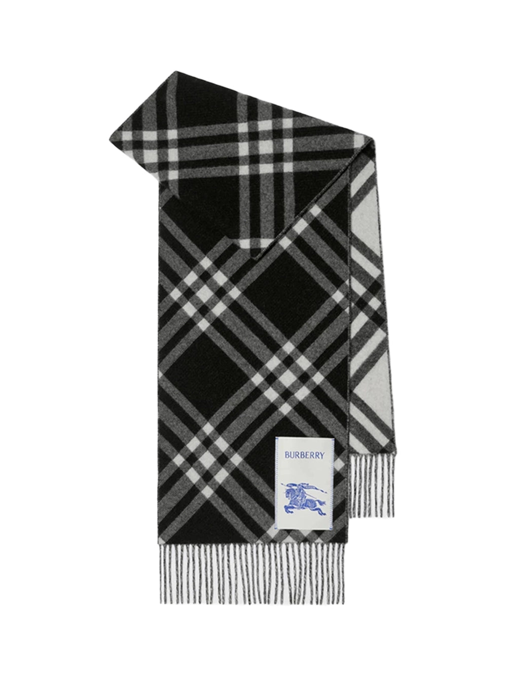 Experience timeless luxury with this Burberry scarf, crafted from double-faced cashmere for exceptional softness and warmth. This iconic Burberry cashmere scarf features the signature check pattern in classic black, finished with elegant fringe ends. The rectangular shape makes this Burberry scarf men and women both enjoy versatile styling options. Discover the perfect blend of heritage and comfort in this essential Burberry scarf women's collection piece, ideal for transitional weather and sophisticated layering. This luxurious Burberry spring scarf offers lightweight warmth with timeless appeal.