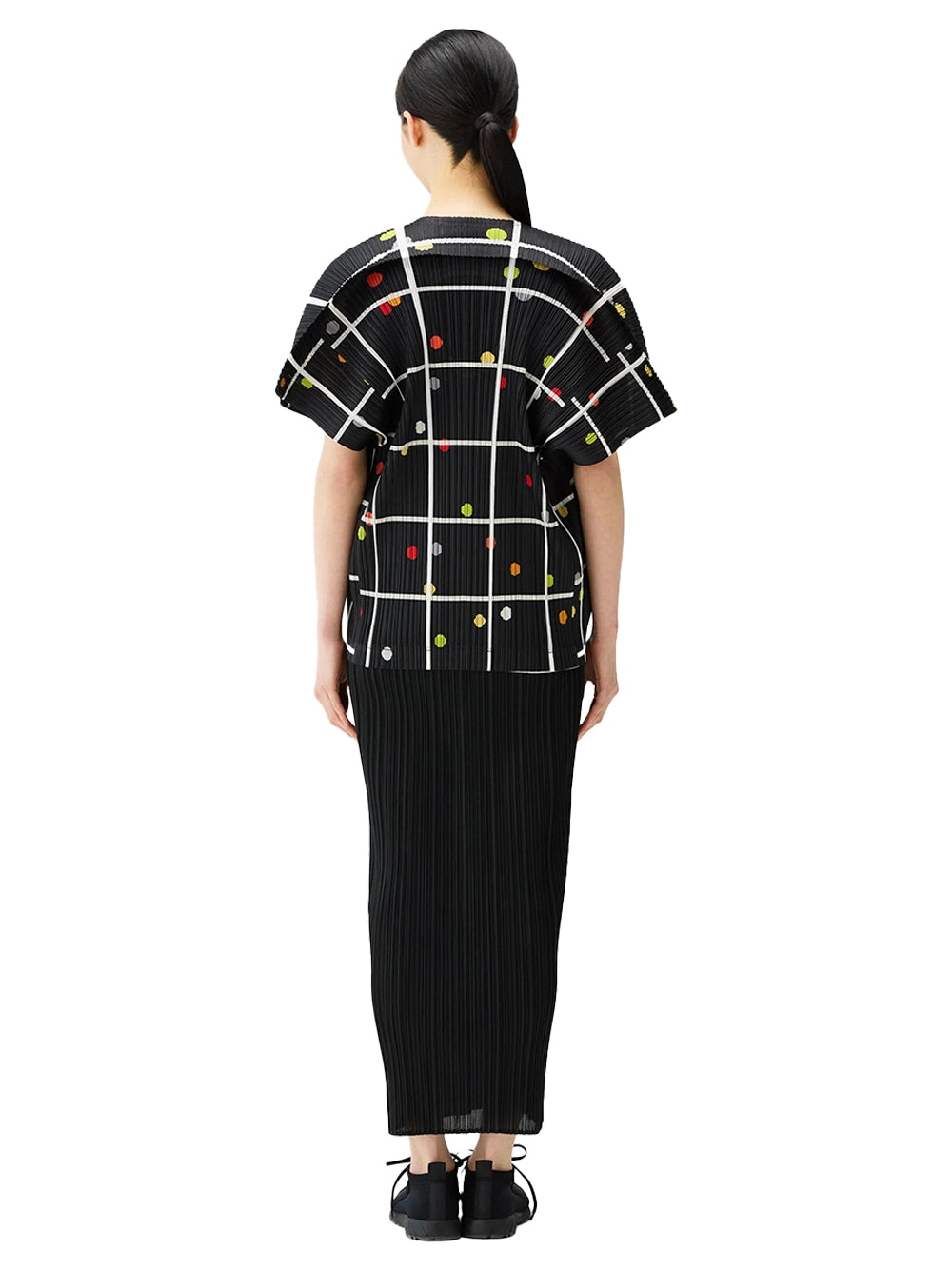 Add a playful edge to your collection with this Issey Miyake top black. Featuring a striking mix of checks and polka dot prints, this Issey Miyake top boasts a modern, boxy silhouette. The classic round neck complements the avant-garde Issey Miyake aesthetic beautifully. Elevate your creative wardrobe with this iconic top Issey Miyake. Truly, Issey Miyake defines wearable art.