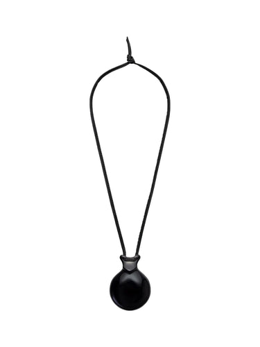 Discover Lemaire's innovative approach to accessories with this black lacquer-finish resin castanet pendant. This versatile Lemaire London piece combines decorative elegance with practical functionality, featuring a soft lambskin knot tie and concealed circular mirror. The subtle Lemaire branding appears engraved inside, maintaining the brand's signature understated aesthetic.