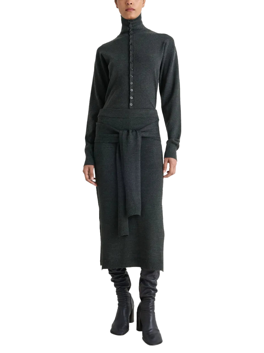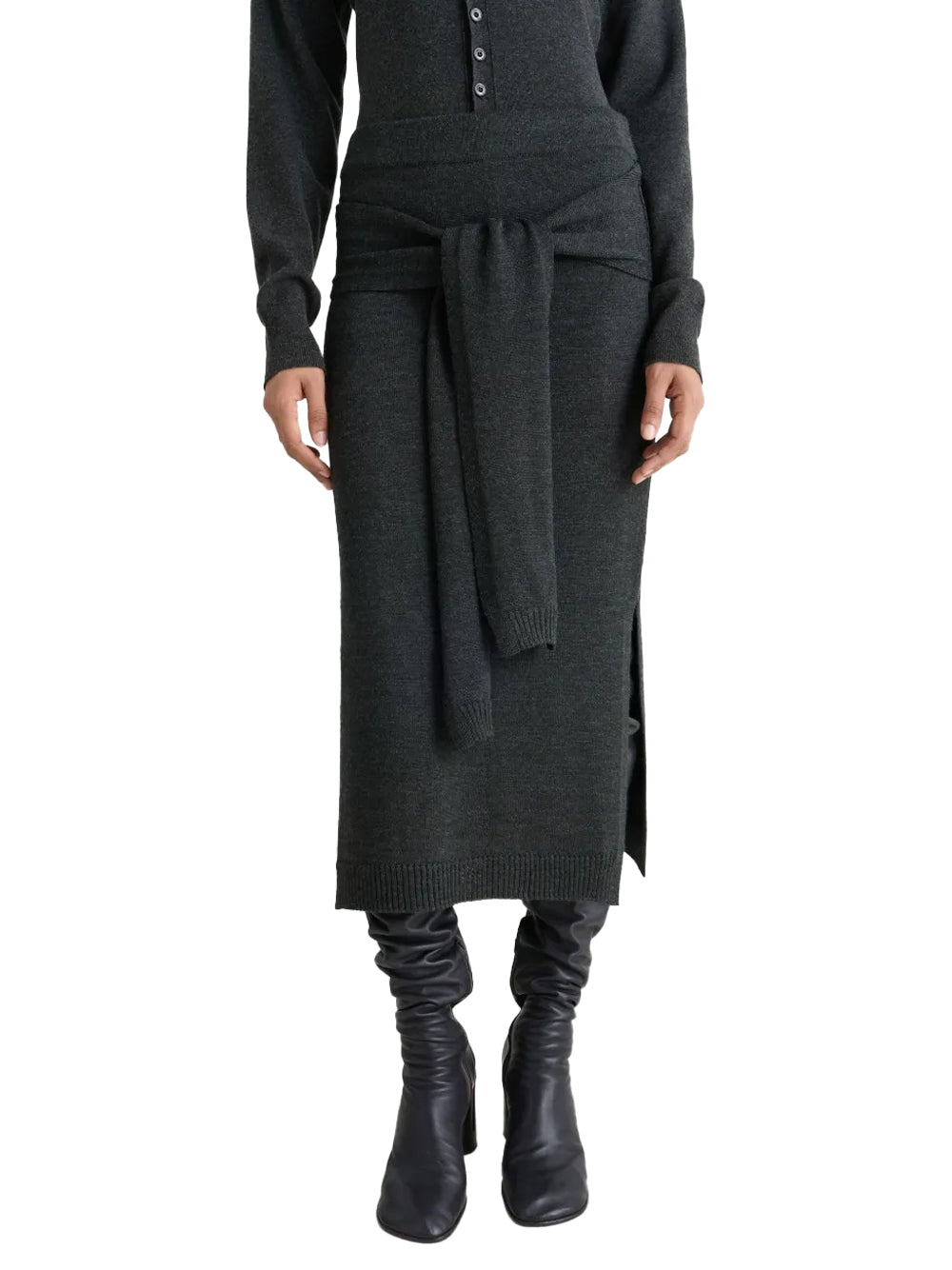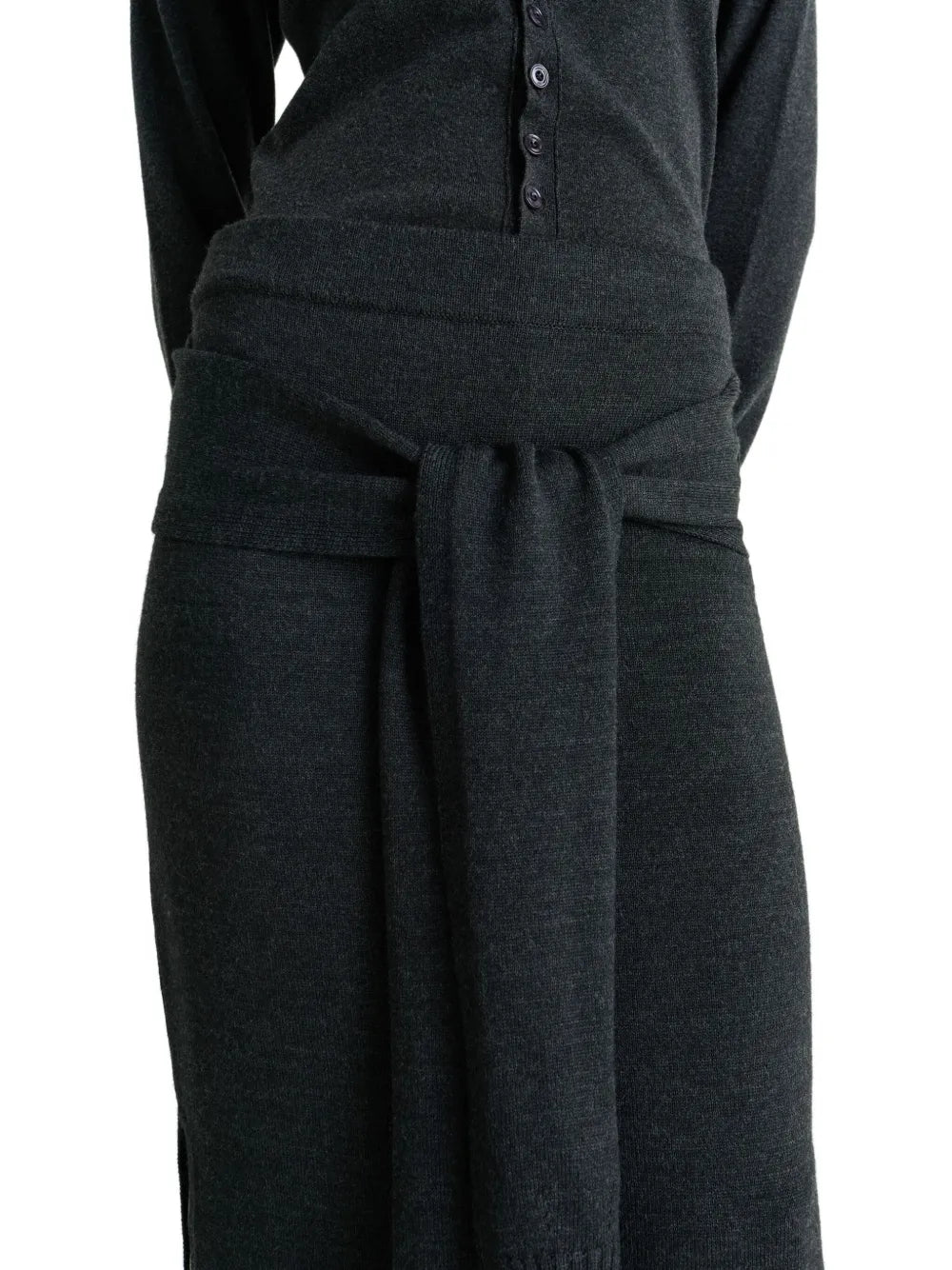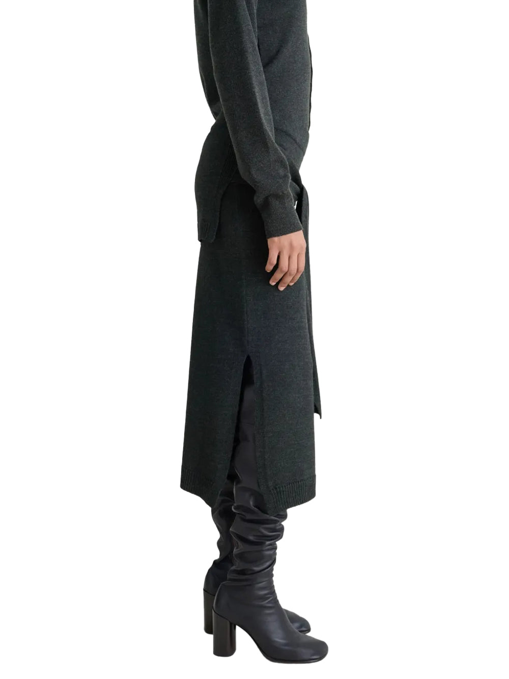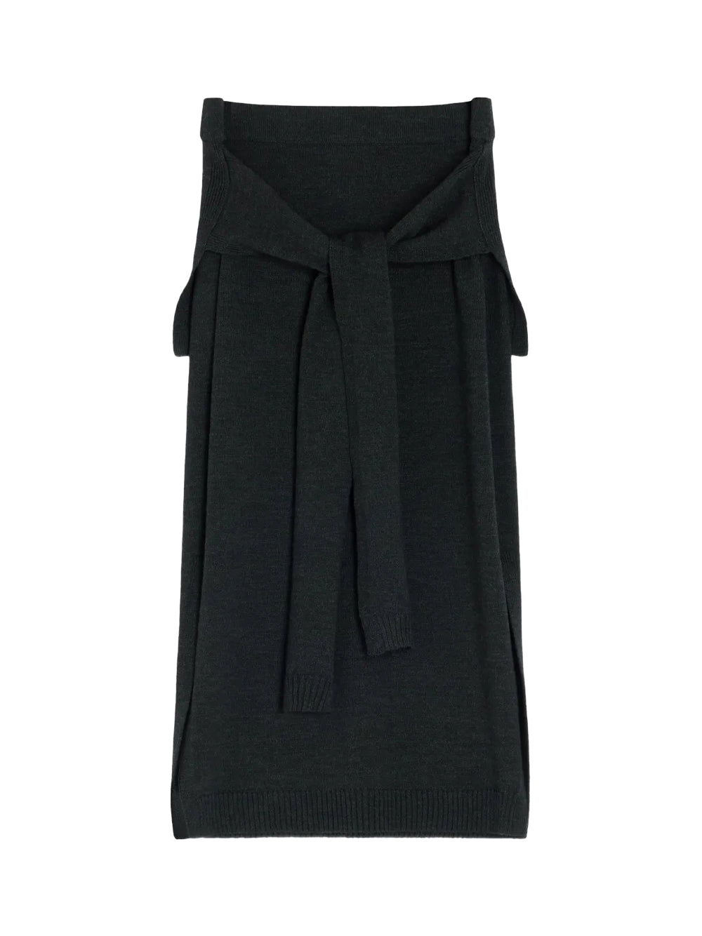 Experience innovative design with this Lemaire trompe l'oeil skirt in sophisticated anthracite grey, crafted from premium merino wool blend for exceptional comfort and drape. This distinctive Lemaire London piece features the signature illusion knit design with a ribbed waistband and clever trompe l'oeil sweater-style back panel. The elegant Lemaire creation showcases subtle side slits and ribbed knit trims, creating versatile styling options for discerning wearers of designer dresses for women.