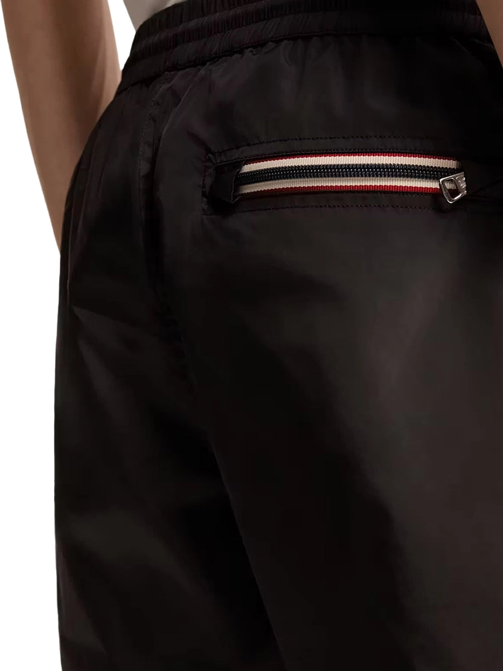 - Zipped back pocket with tricolor trim