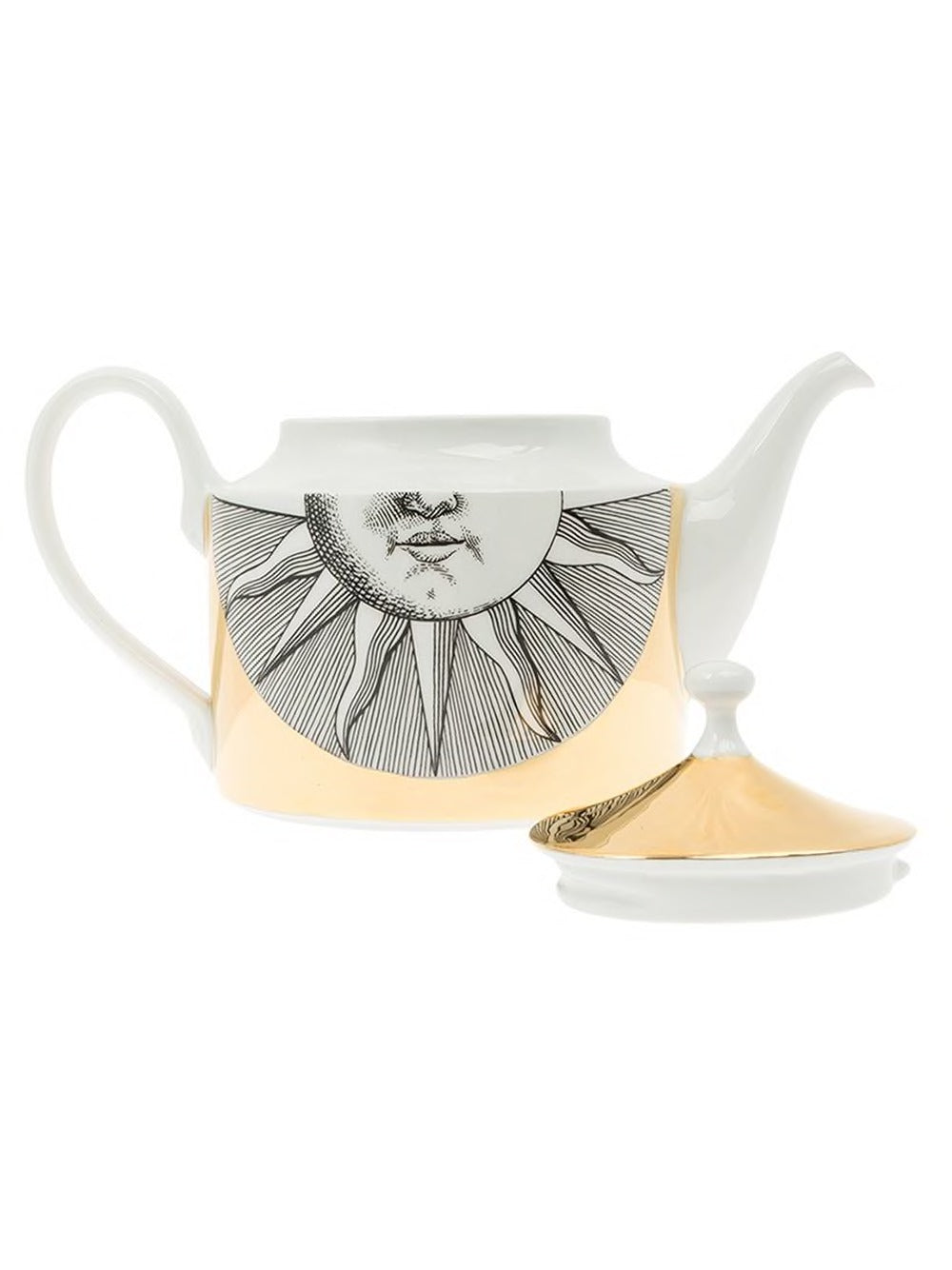 The motif of the sun covers this hand-decorated porcelain teapot with gold accents, transferring Fornasetti's imagery to an object for daily use and thereby transforming it into a collector's item.