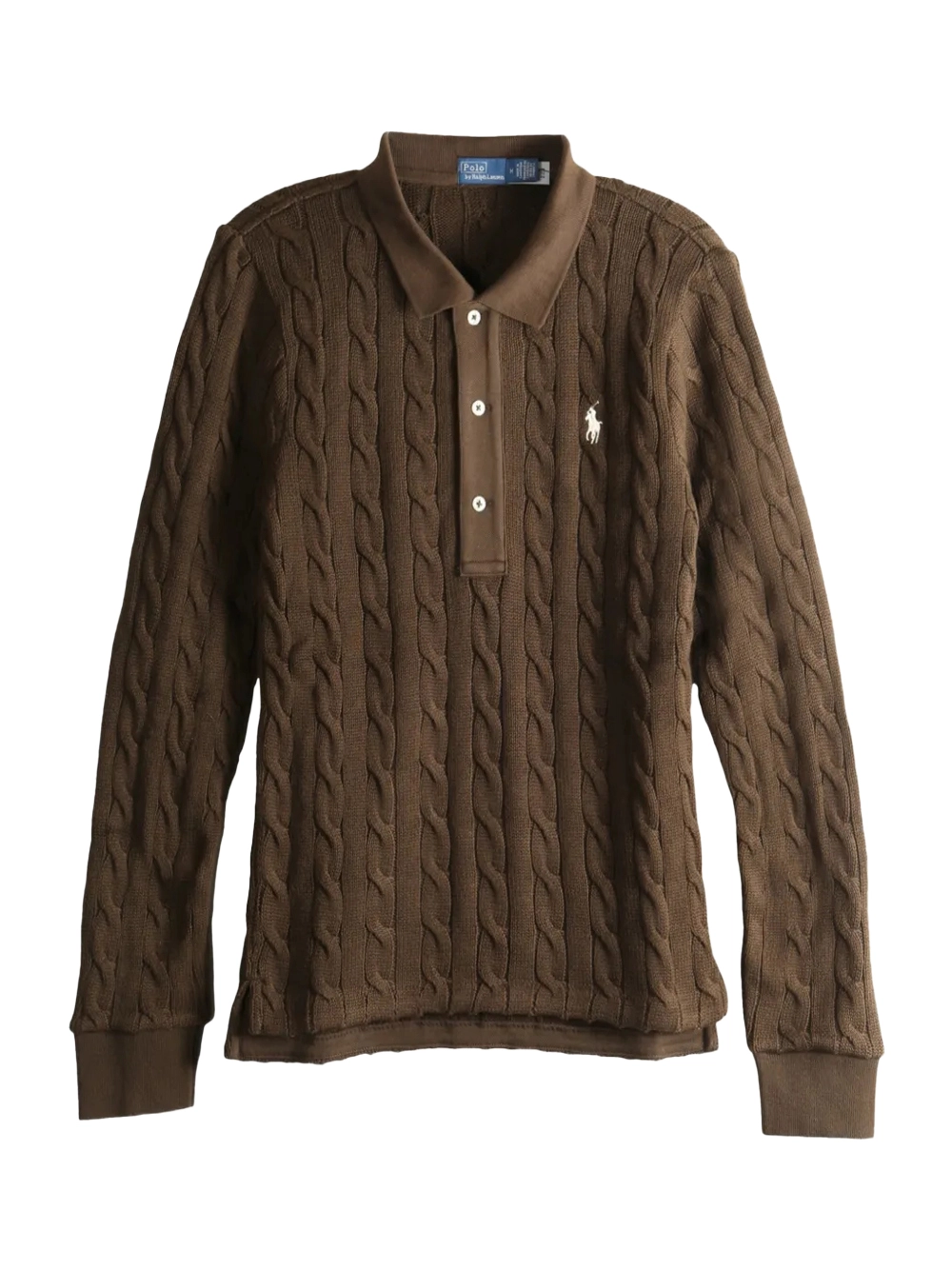 Discover timeless style with this Polo Ralph Lauren cable-knit polo top in rich dark brown. It features a buttoned placket and a traditional polo collar, crafted for a refined look. The long sleeves and signature brand details complete this versatile Polo Ralph Lauren top, making it a perfect layering piece. This essential Ralph Lauren polo top is a cornerstone of understated, smart-casual elegance for any wardrobe.