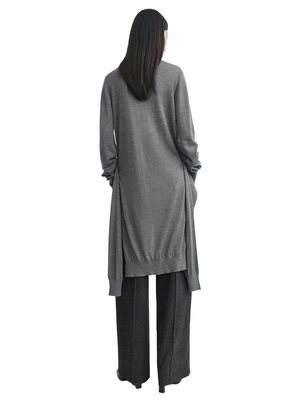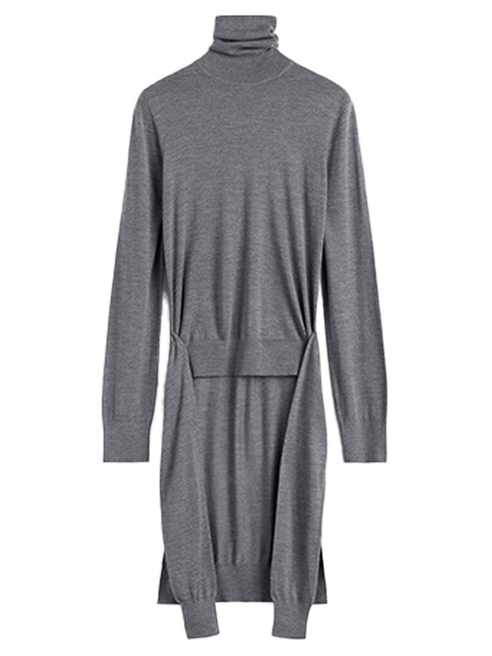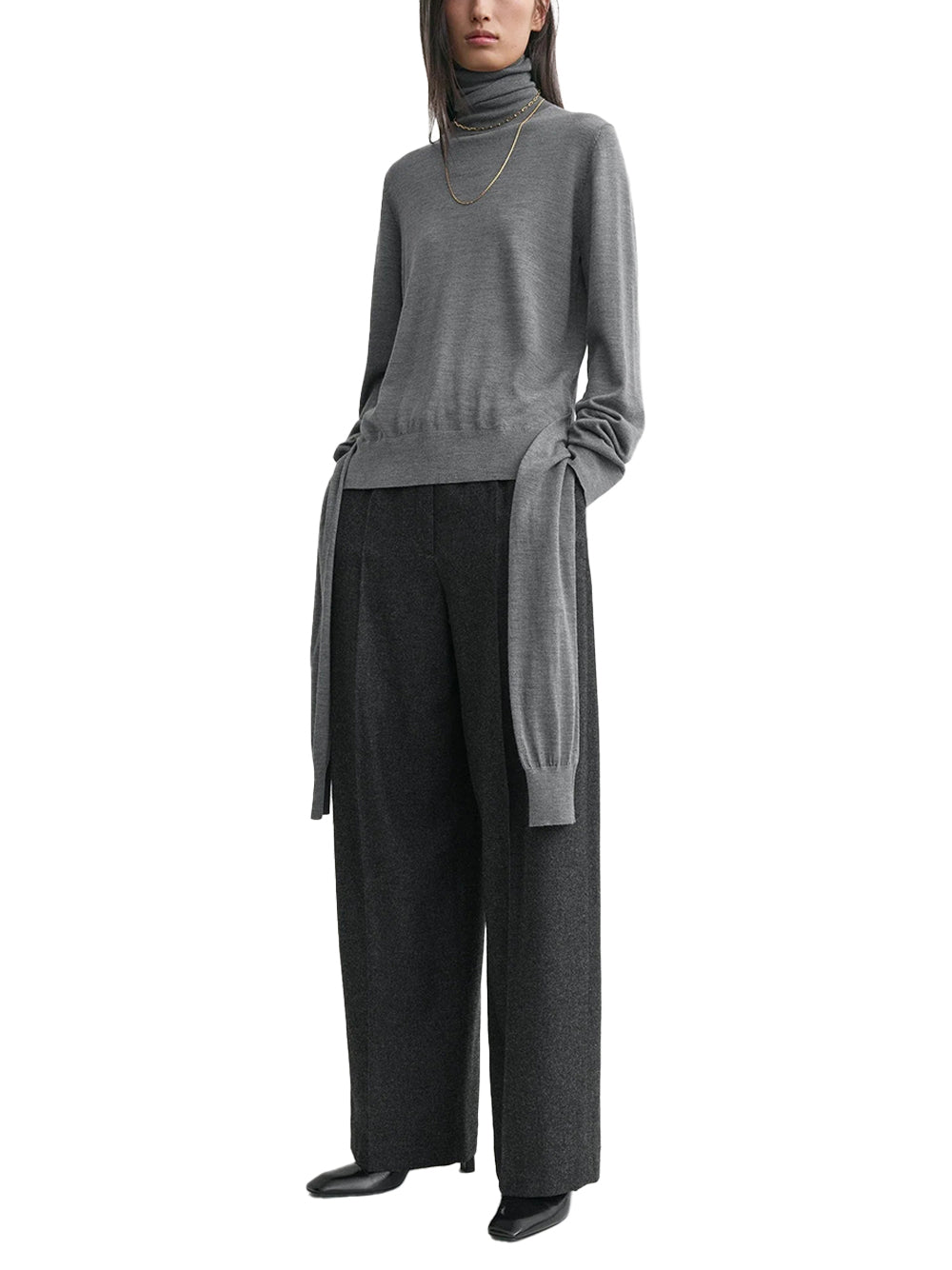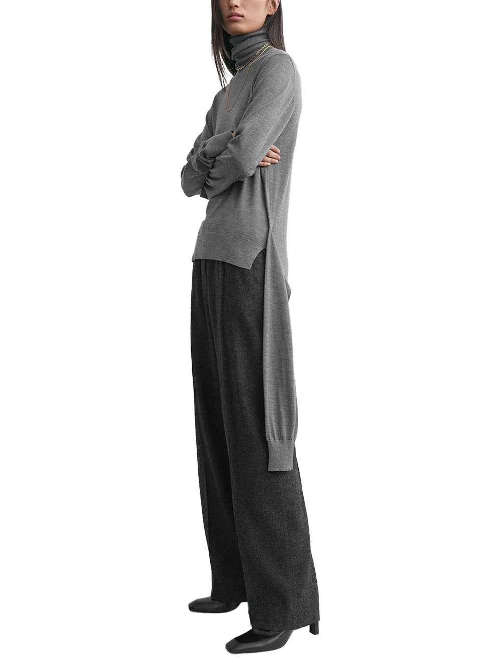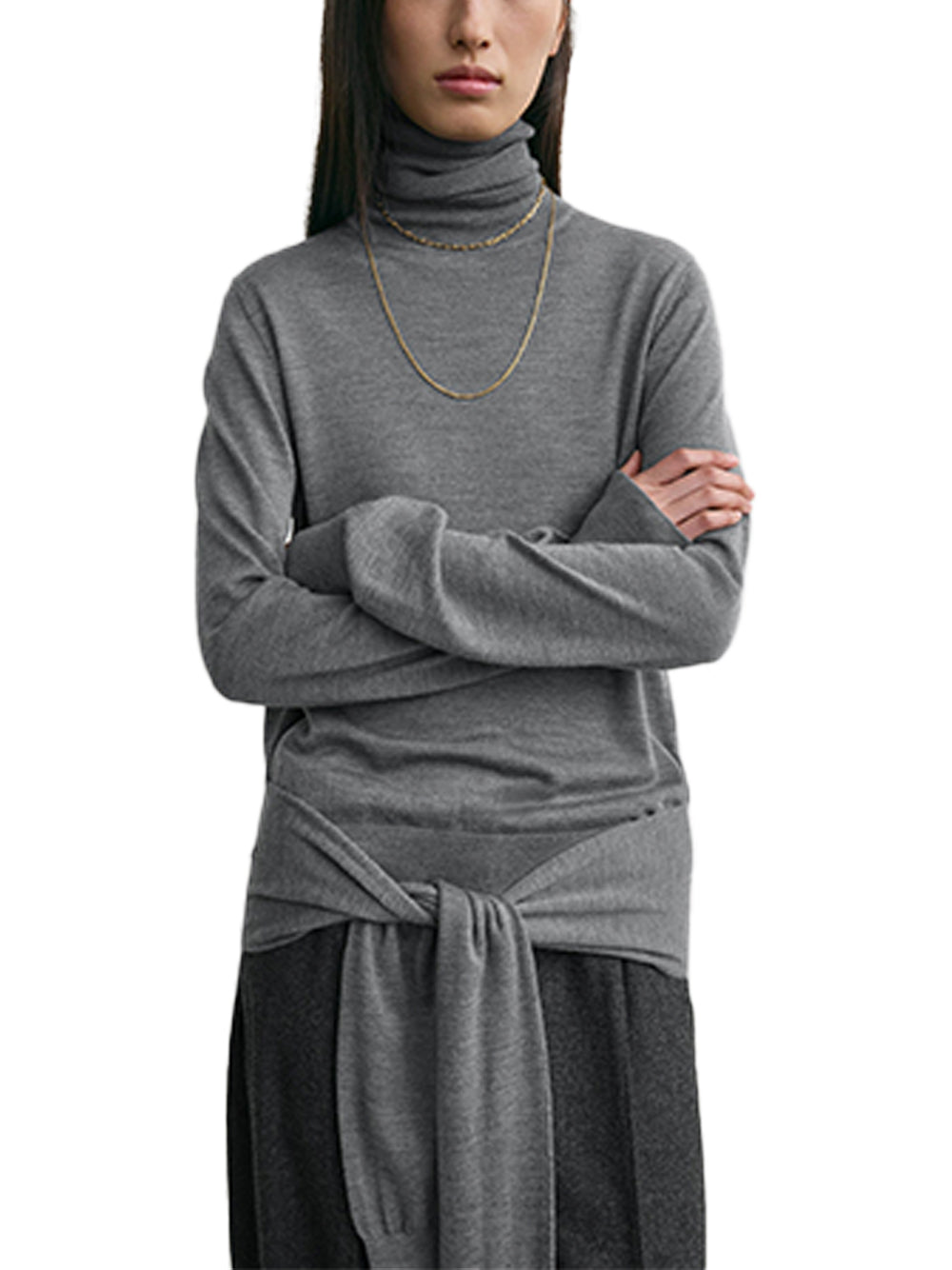 Experience architectural design with Toteme double-sleeve turtleneck in medium grey. This innovative Toteme jumper combines a wool-silk blend with a fitted silhouette and high neck for timeless comfort. The defining feature is the additional sleeve tied at the waist, creating a sculptural profile that embodies Scandinavian minimalist aesthetics.