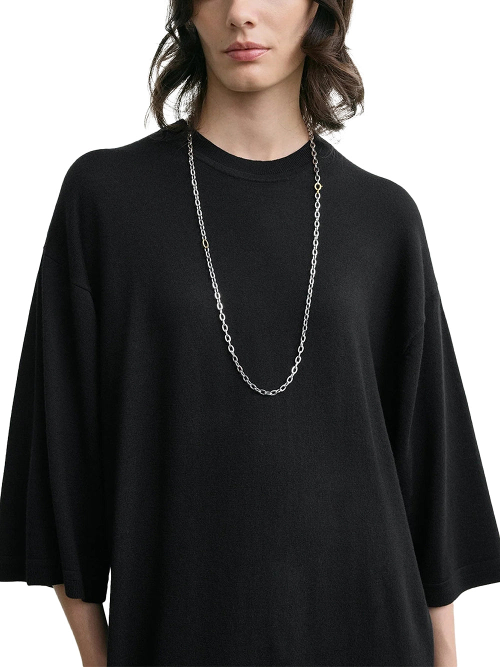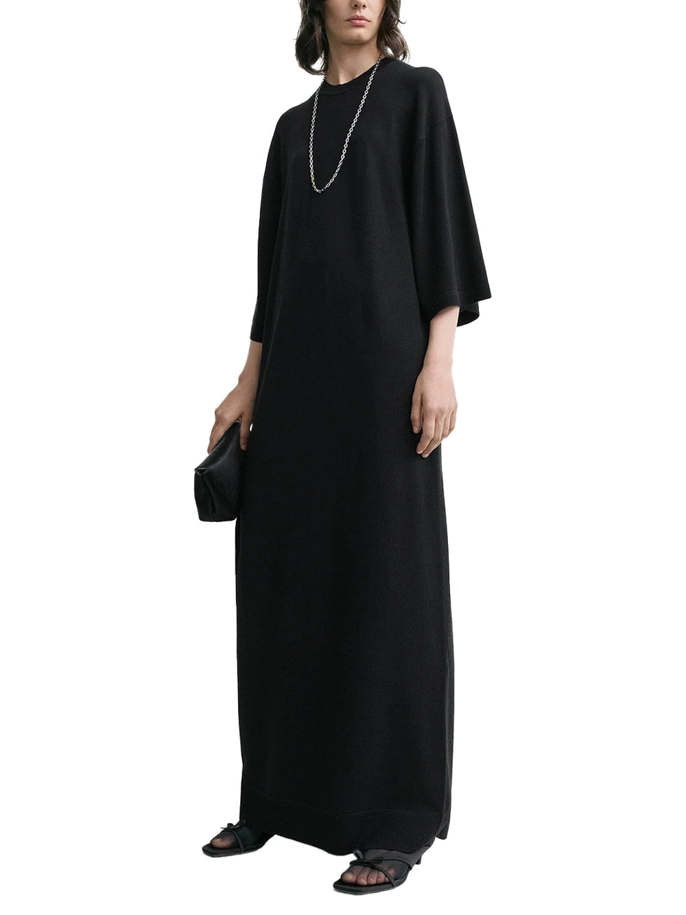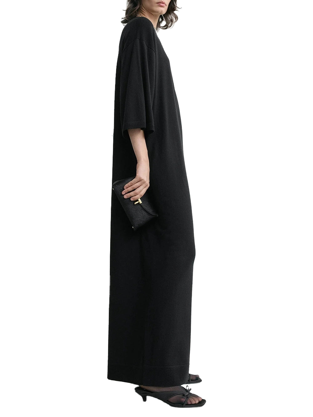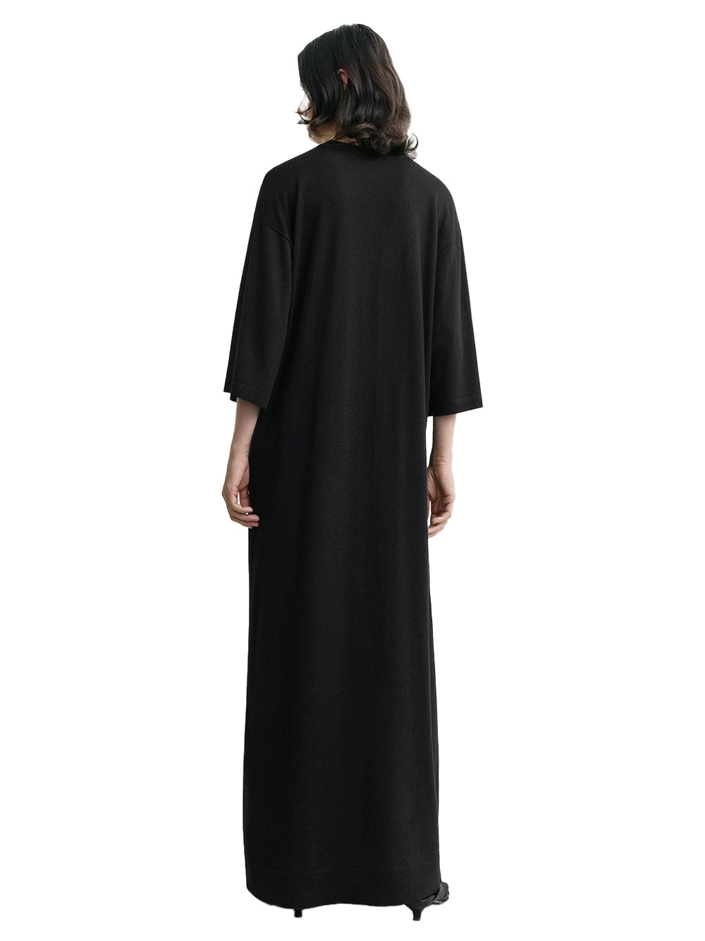Elevate your style with the TOTEME Merino Knit Tee Dress Black, a staple of totem clothing. This toteme dress features a ribbed crew neck and dropped shoulders for a relaxed fit. As a signature dress toteme, it offers wide sleeves in a timeless black hue. Discover the effortless luxury of toteme with this versatile knit, designed for the modern British woman.