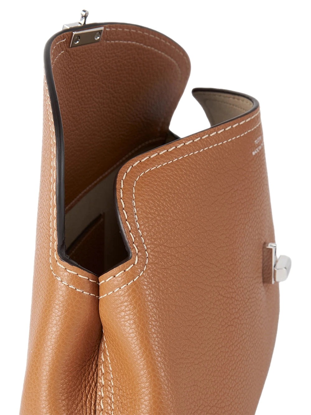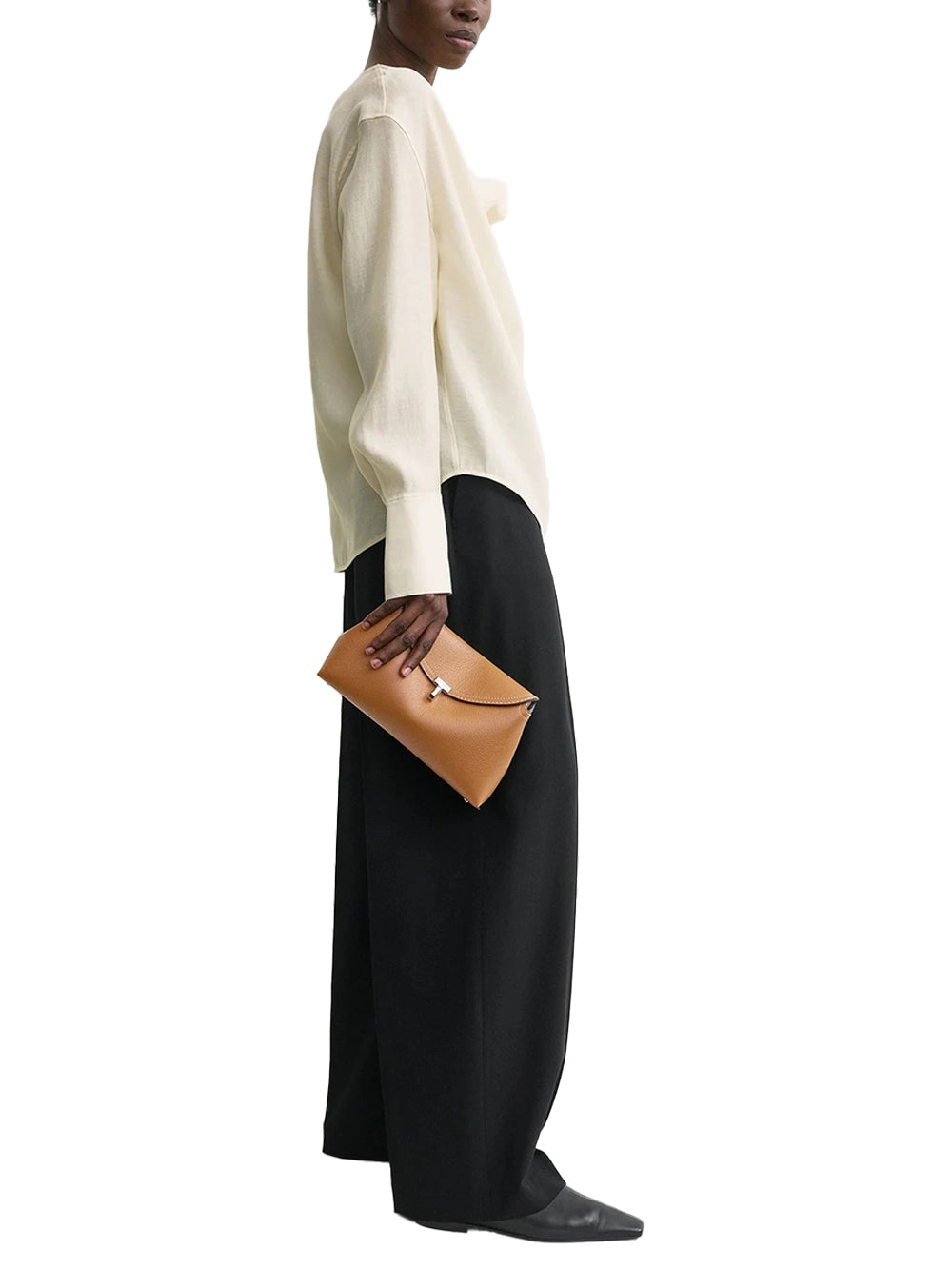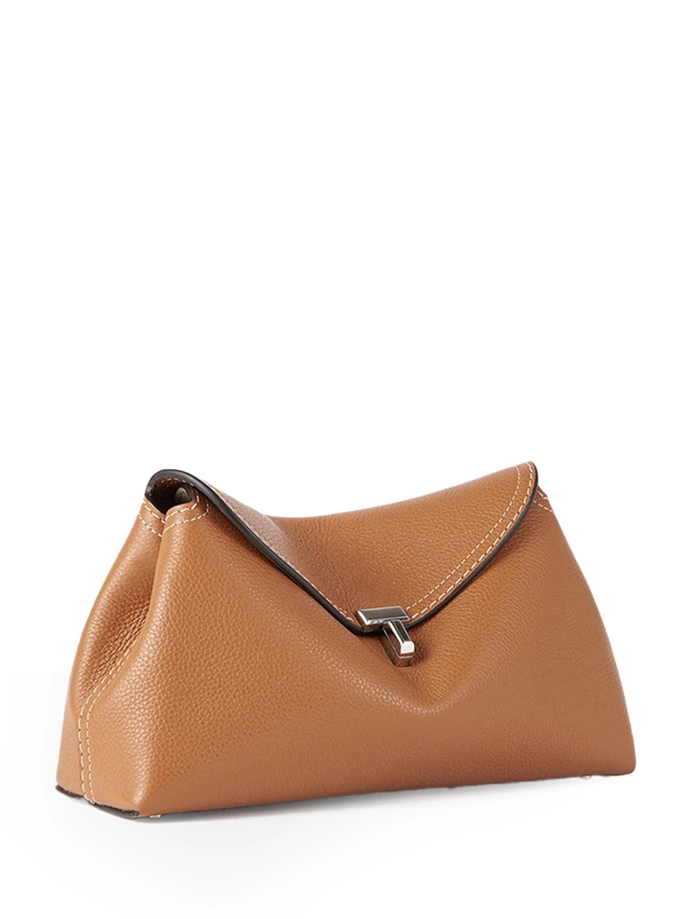 Introduce the Toteme T-Lock clutch in a warm tan shade of grained leather. This elegant Toteme bag is defined by its signature silver rotating lock closure. It includes a detachable, adjustable shoulder strap for versatile wear, transitioning effortlessly from hand to shoulder. Inside, this practical Toteme bag is lined with easy-clean beige microsuede.