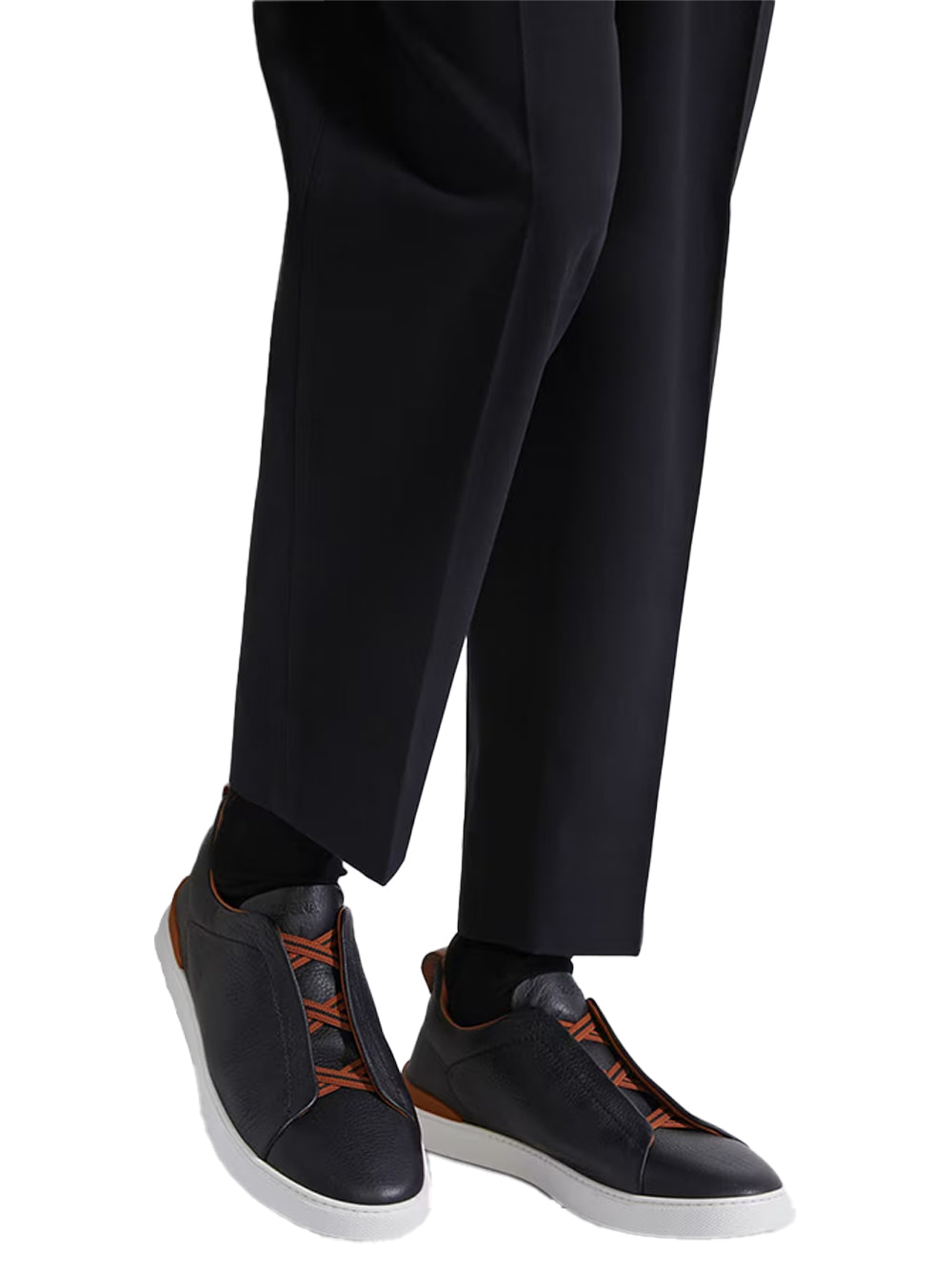 Step into sophistication with Zegna's Deerskin Triple Stitch Sneakers. Made from high-quality Italian deerskin, these black sneakers have crossed elastics for easy wear. They also include a Sanitized® removable footbed for cleanliness and a lightweight white rubber sole for all-day comfort. The foliage-coloured leather lining and Zegna 232 Road Brand Mark add a touch of exclusivity. These designer sneakers are perfect for both casual and smart outfits.