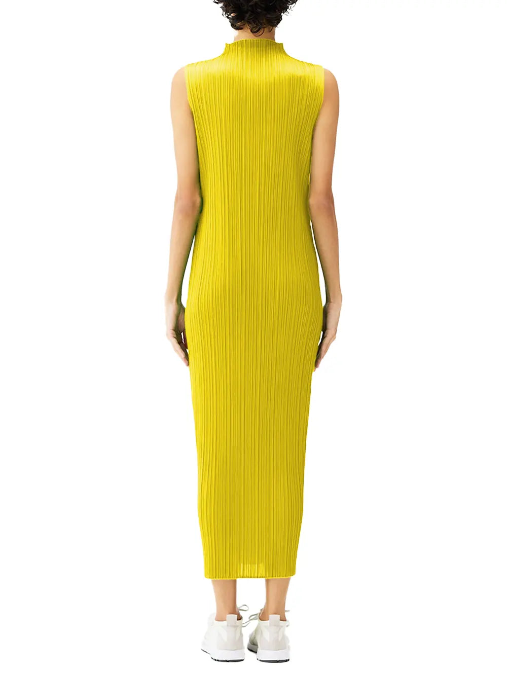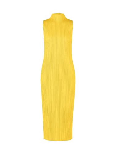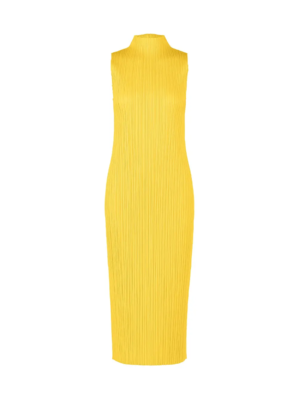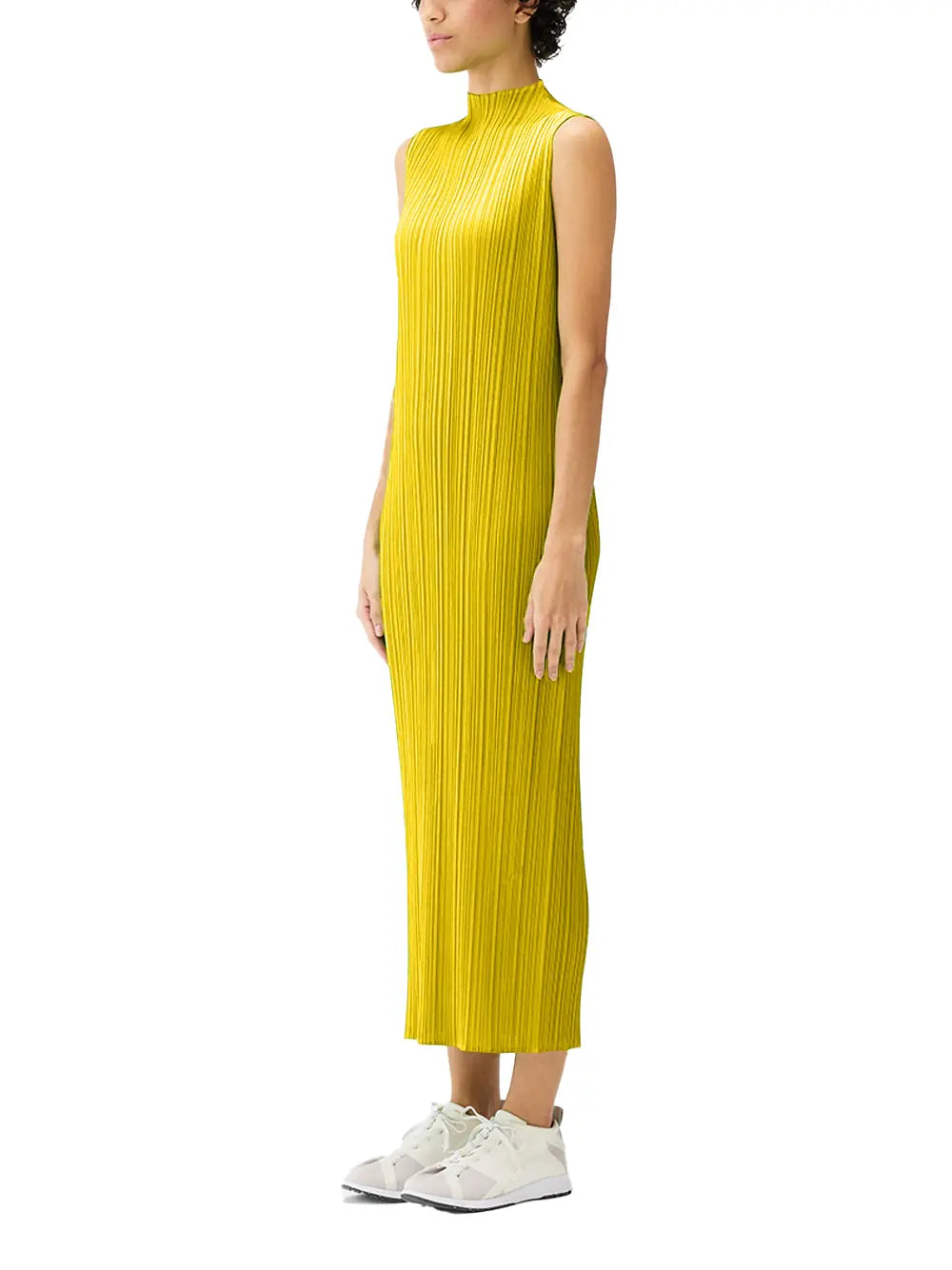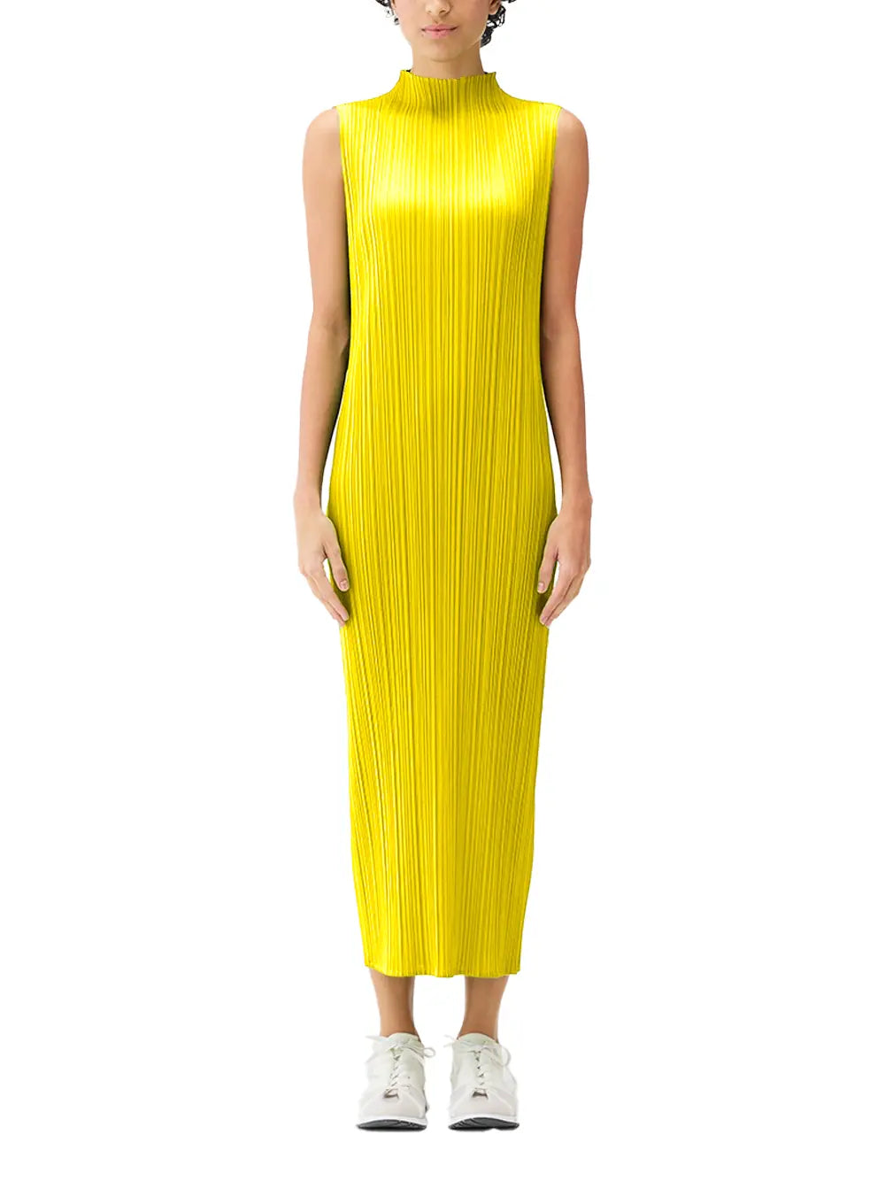 Radiate modern energy with issey miyake striking yellow dress. This issey miyake dress features a high neck and the signature fluid texture of issey miyake design. Enjoy a sleeveless cocoon silhouette on this issey miyake pleats please yellow dress. This issey miyake dress offers effortless, architectural volume.
